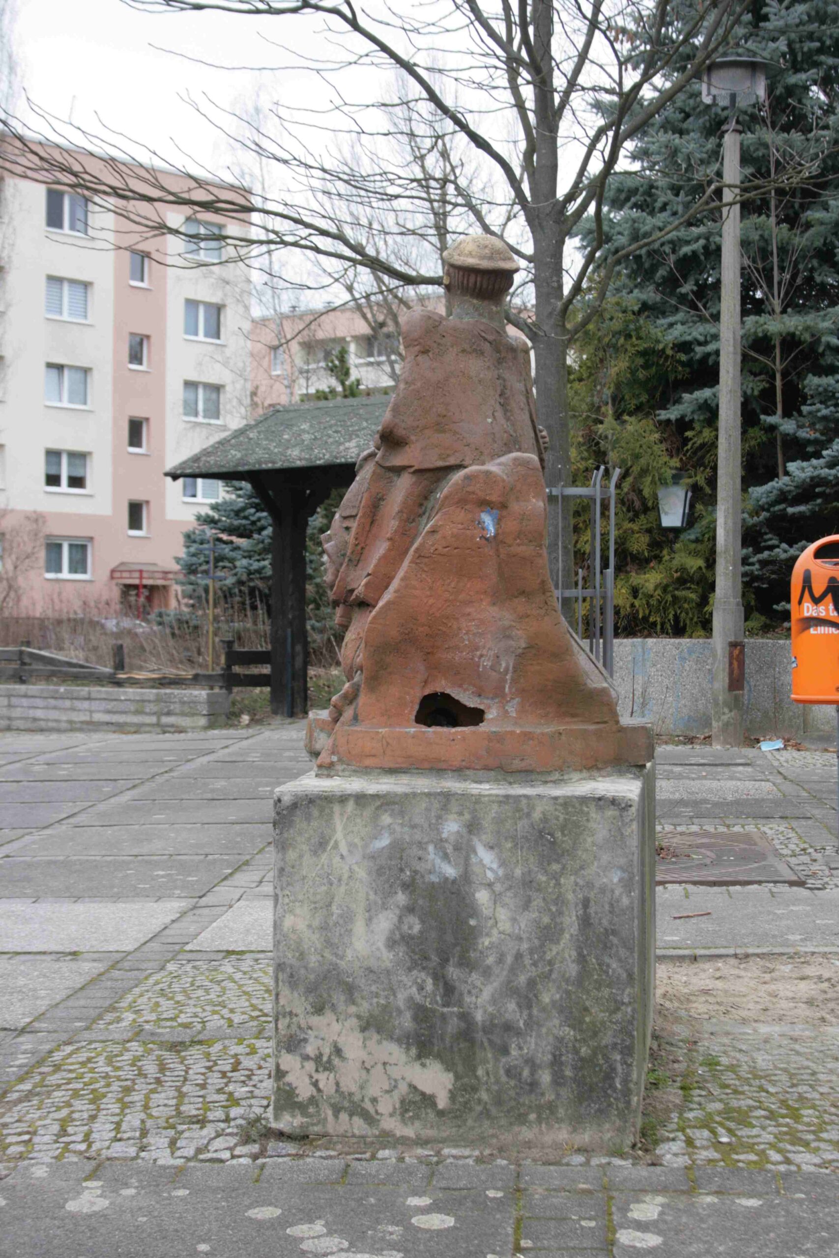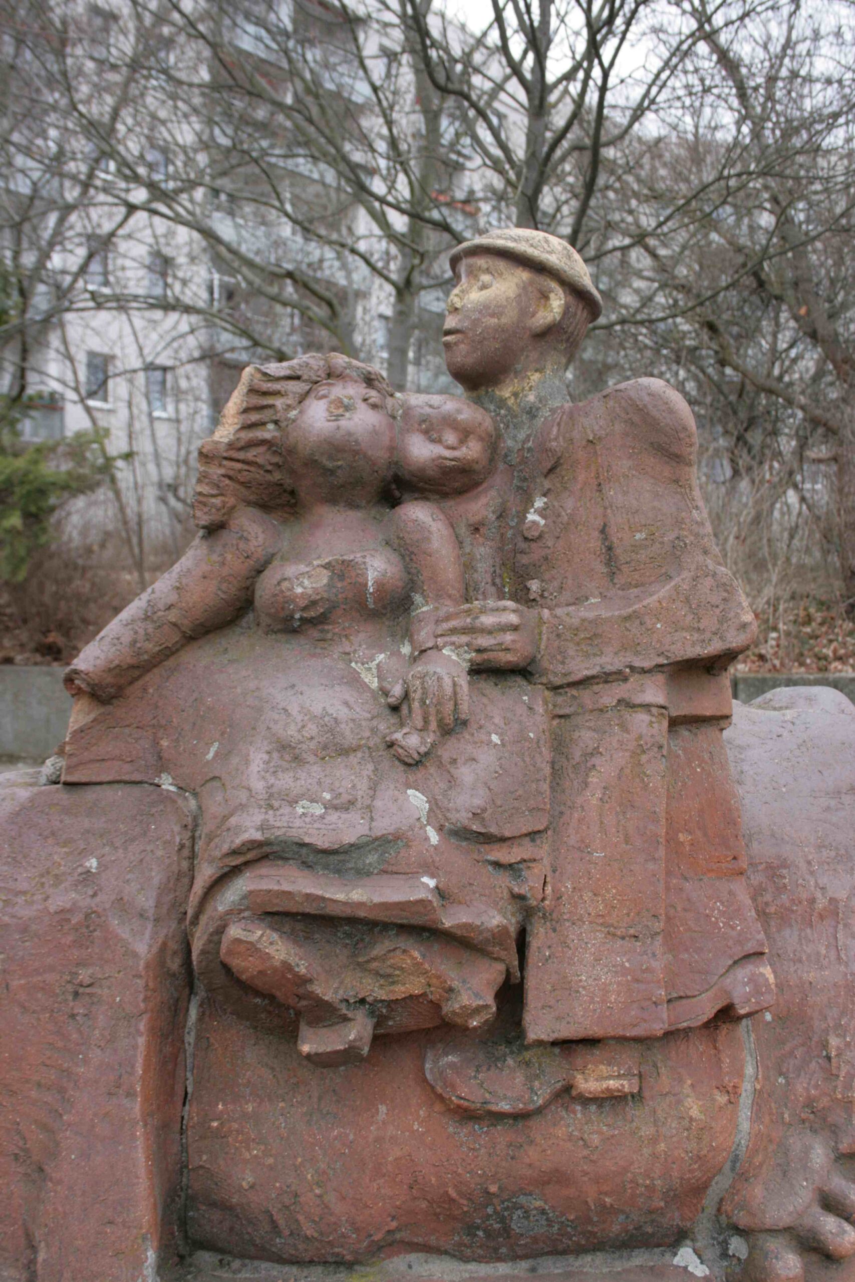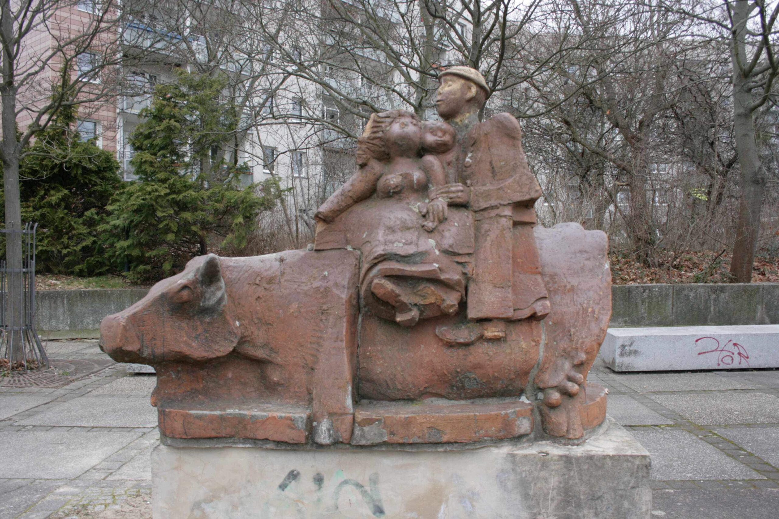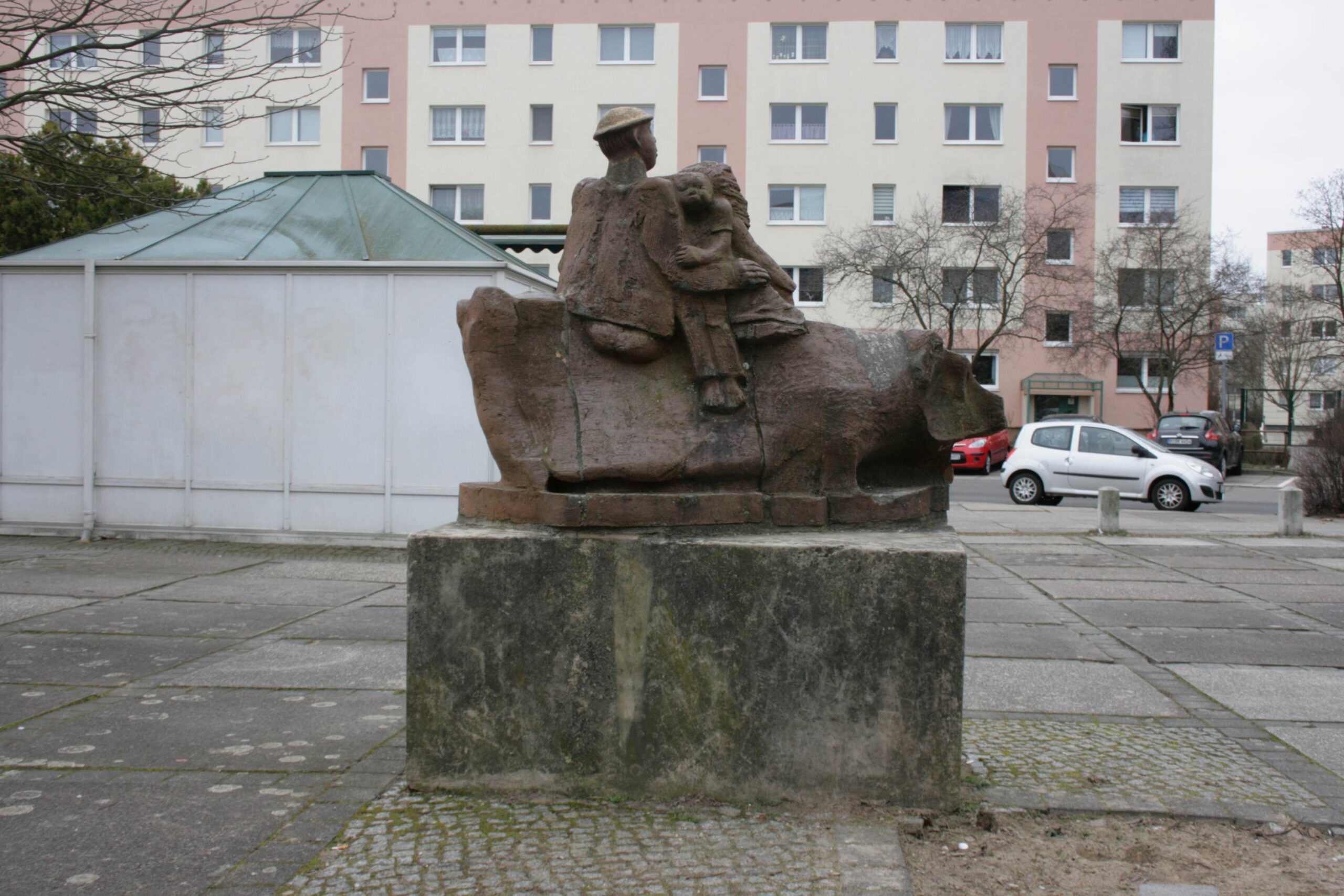 Die Terrakottaskulptur ist auf einem keramischen Unterbau montiert und verfugt. Sie bildet den dekorativen Mittelpunkt einer Platzfläche zwischen einer Kaufhalle und einer Gaststätte. In heiter-anekdotischer zeigt sie eine Familie (Mann, Frau, zwei Kinder) auf einer Kuh reitend. Die Darstellung steht in Tradition folkloristischer Motive des bäuerlichen Lebens und sollte in der Großsiedlung einen ländlichen Bezug herstellen. (Kunst in der Großsiedlung, 2008, S. 216)