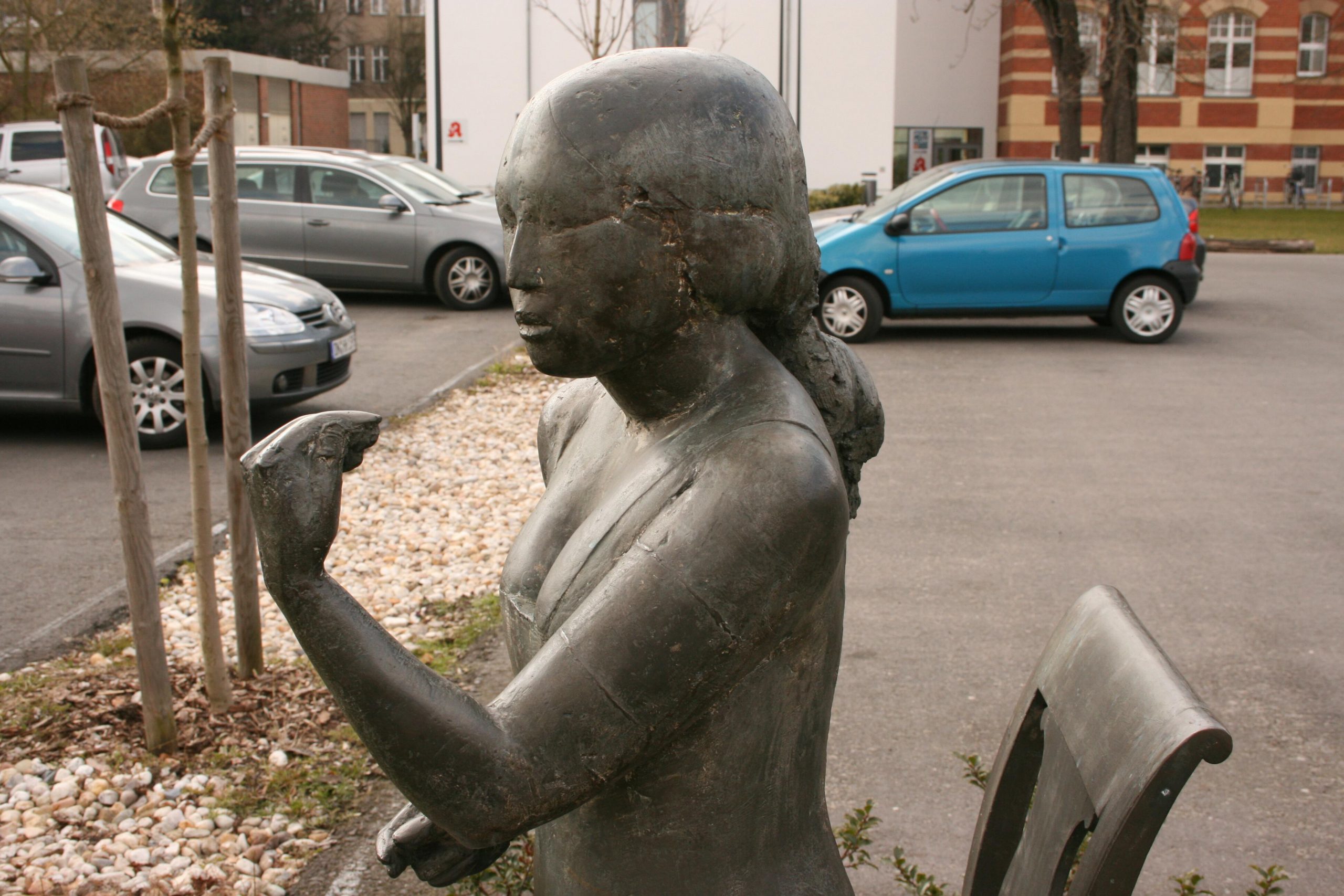 Auf einem quadratischen aus roten Ziegelsteinen gemauerten Sockel steht, mit einer flachen Plinthe versehen, die bronzene Sitzfigur der „Schönen“. Sie sitzt sehr aufrecht auf einem biedermeierlich geformten schlichten Stuhl, die Füße in hochhackigen Schuhen hat sie über Kreuz gestellt, sie trägt ein ärmelloses enganliegendes Kleid, die Haare sind auf dem Rücken zusammengebunden. Die dargestellte Frau hat ihren Blick auf die Fingerkuppen ihrer linken Hand gerichtet, die Geste weist eindeutig darauf hin, dass sie den Schliff ihrer Fingernägel überprüft. Die weibliche Figur ist vergleichsweise realistische dargestellt, die Detailformen sind nur leicht summarisch zusammengefasst. Sie ist eine präzise Beobachtung eitler Weiblichkeit und gleichzeitig ist sie spannungsreich komponiert (Jörg Kuhn, Susanne Kähler).