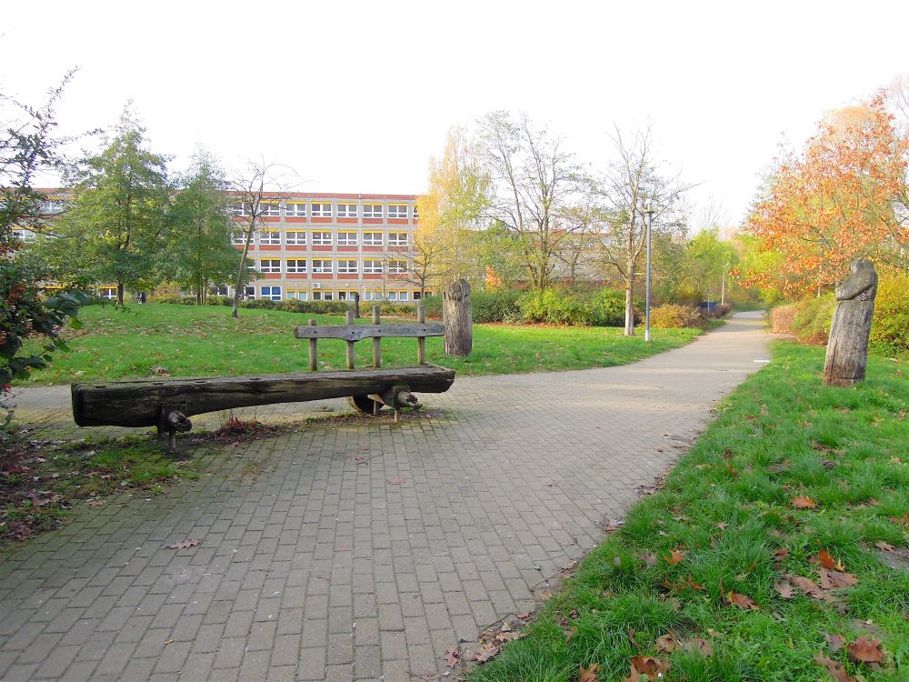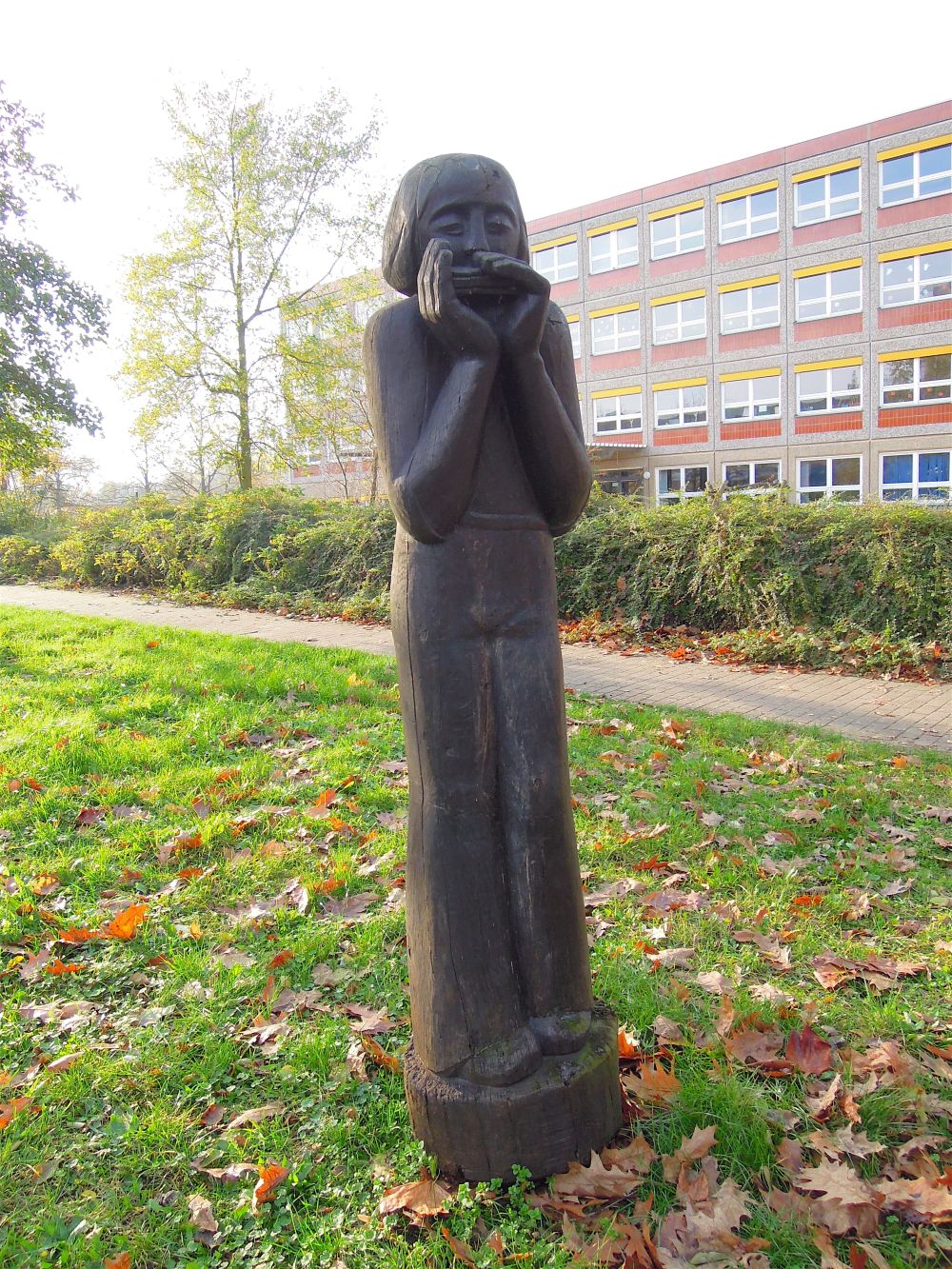 Von dem von Nikolas Bode und Günter Thüre geschaffenen Ensemble, das das Leben im Dorf symbolisiert, sind gegenwärtig nur noch Teile vorhanden. Sie stehen nicht mehr in ihrer ursprünglichen Konstellation: ein landwirtschaftlich traditioneller Leiterwagen (Bode), eine bäuerliche Frauenfigur (Bode) und eine Plastik mit Assoziationen an Dorfbauten, Korngarben und Backofen (Ährenblock von Thüre). Alle drei Plastiken stehen als Gruppe beieinander und veranschaulichen zeichenhaft einen Dorfkern. Der Leiterwagen ist eine schlichte Wiedergabe eines landwirtschaftlichen Transportmittels. Er ist in einem schlechten Zustand. Es fehlen wohl Räder und Teile der Leiterseitenwände. Die beiden anderen Plastiken sind jeweils aus einem baumstammartigen Werkstück – mal grob mal glatt – herausgearbeitet. Abseits davon steht der Mundharmonikaspieler von Günter Thüre. Eine langgestreckte Figur aus einem Holzstück, Kopf, Hände mit der Mundharmonika sind plastisch fein herausgearbeitet (Jürgen Tomisch).