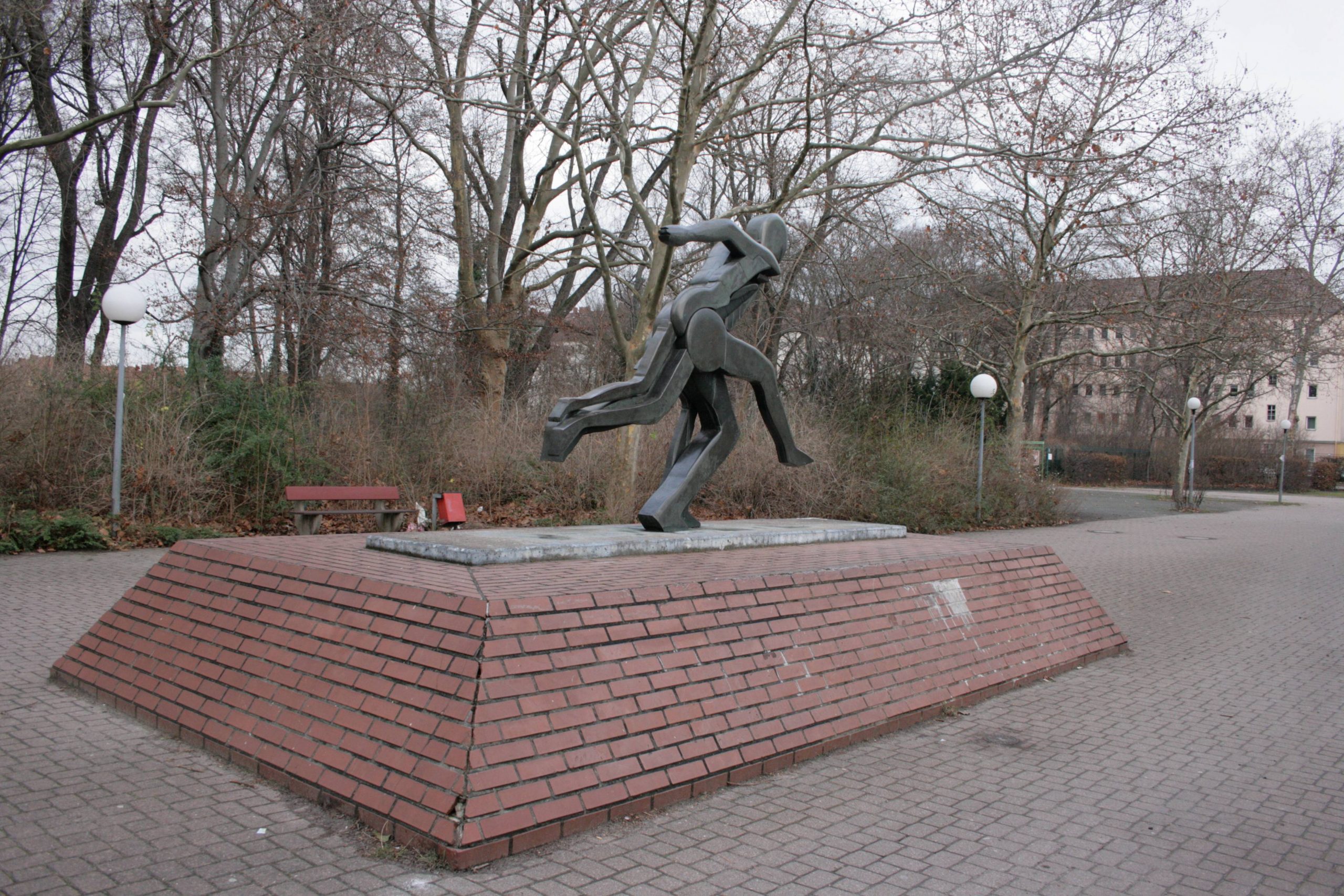 Die überlebensgroße Bronzefigur eines Läufers steht auf einer längsrechteckigen Betonplinthe, die wiederum auf einem großflächigen, zu allen vier Seiten abgeschrägten Sockel mit roter Klinkerverkleidung steht. In abstrahierter Form wird ein Läufer dargestellt, wobei die Laufbewegung durch die Schichtung des Körpers in mehreren Bewegungsstadien dargestellt wird. Der Läufer ist dabei nur von den Seitenansichten aus zu erkennen, von vorne und hinten sind nur die Kanten der Schichten zu erkennen – der Bildhauer vermied es offensichtlich bewusst, die Möglichkeiten des dreidimensionalen Gestaltens zu nutzen. Die Plastik steht für eine technizistische Auffassung des Bewegungsapparates eines Läufers. Die Flächen sind glatt, die Hüftgelenke wirken wie Maschinenteile. Bemerkenswert ist, dass Biederbick sich bei der Wiedergabe unterschiedlicher Bewegungsstadien die Armbewegung nicht miteinbezog. Die Bronze ist bezeichnet am rechten Fuß (Susanne Kähler).