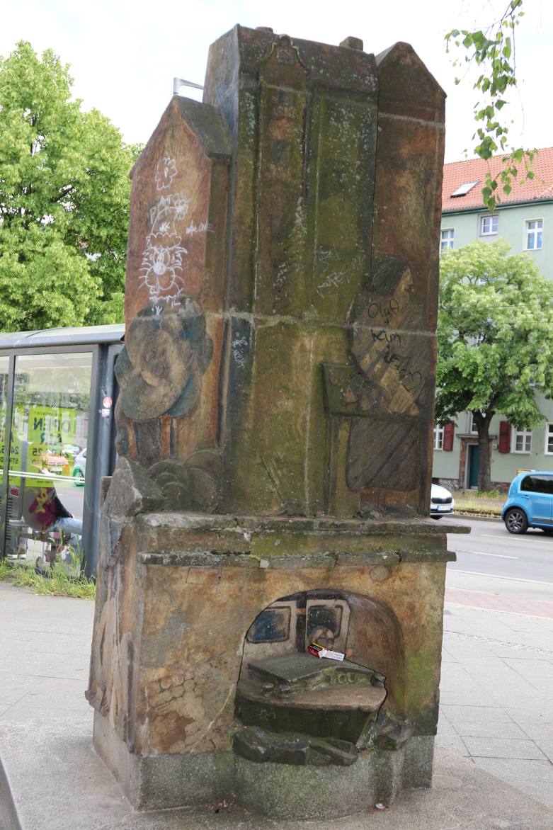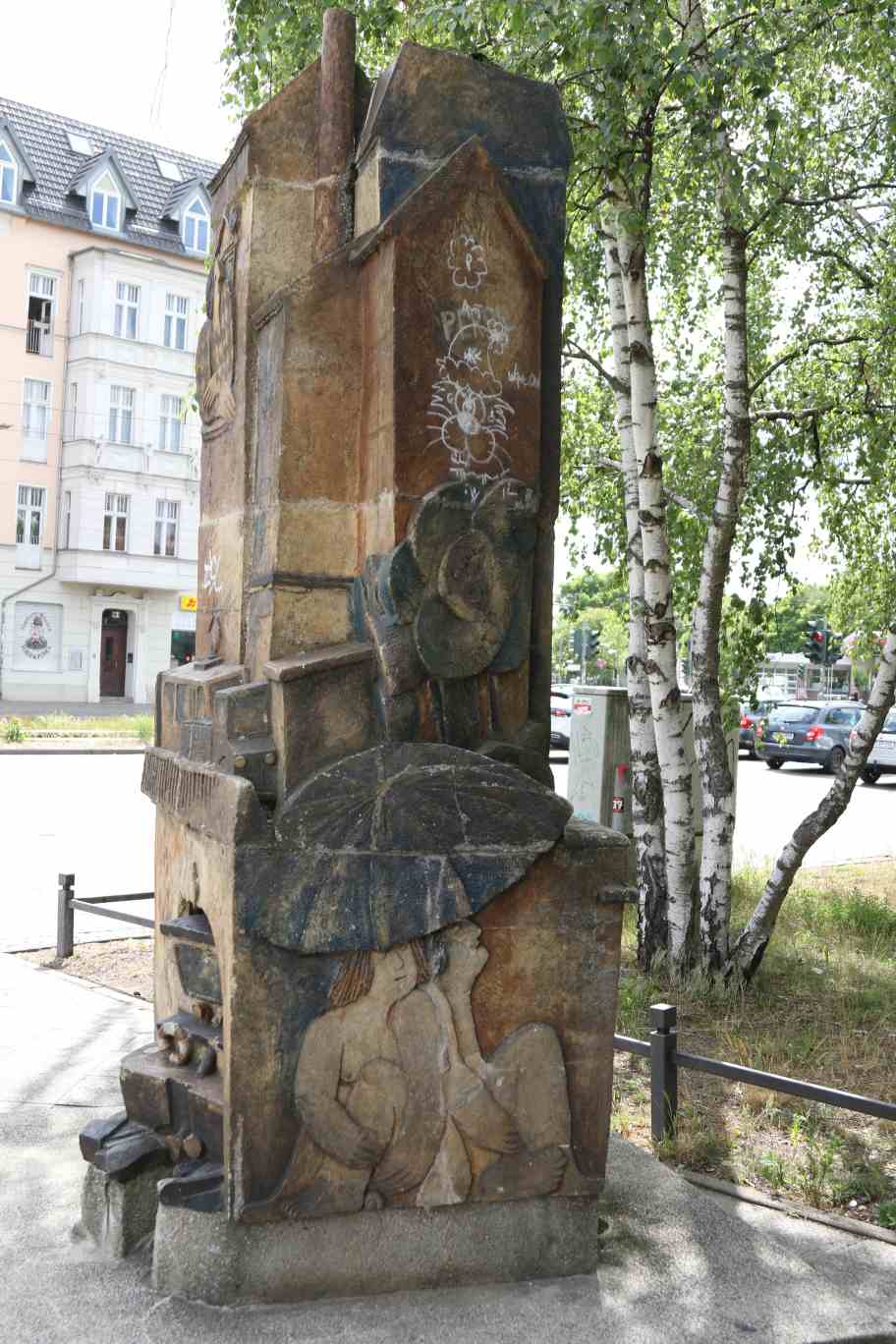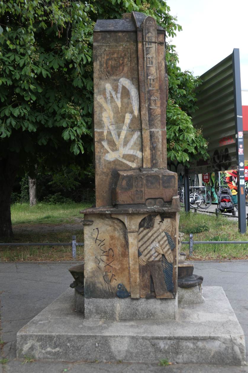 Spindlersfeld, nahe S-Bahnhof. 1993 lautet die Ortsangabe "Oberspreestraße, vor der Kaufhalle" (Plastiken, Denkmäler und Brunnen im Bezirk Köpenick, 1993, S. 29).