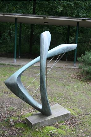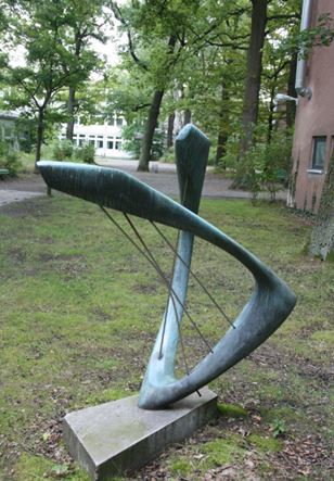 Die Plastik Leier und Bogen von 1958 wurde offenbar im Zusammenhang mit dem Bezug der zwischen 1954 und 1958 neu errichteten Schulgebäude erworben. Die Leier gilt als Attribut von Apoll, dem griechisch-antiken Gott der Vernunft, Führer der Musen usw. Nimmt man den Wunsch der Initiatoren der neuen Schule ernst, so sind die Zuständigkeitsbereiche Apolls mit der Funktion eines Gymnasiums eng verbunden. Das Werk scheint nach 1990 umgesetzt worden zu sein (vgl. Endlich, 1990, S. 109: „vor der Schule aufgestellt“) und zwar in den hinteren Gartenbereich auf eine Rasenfläche zwischen zwei Gebäudeteilen. Marc Wellmann, der es im Vorfahrtsbereich der Schule nicht mehr vorfand, wähnte es daher irrig 2012 in der historischen Fassung von Bildhauerei-in-Berlin als nicht mehr vorhanden (Susanne Kähler, Jörg Kuhn).