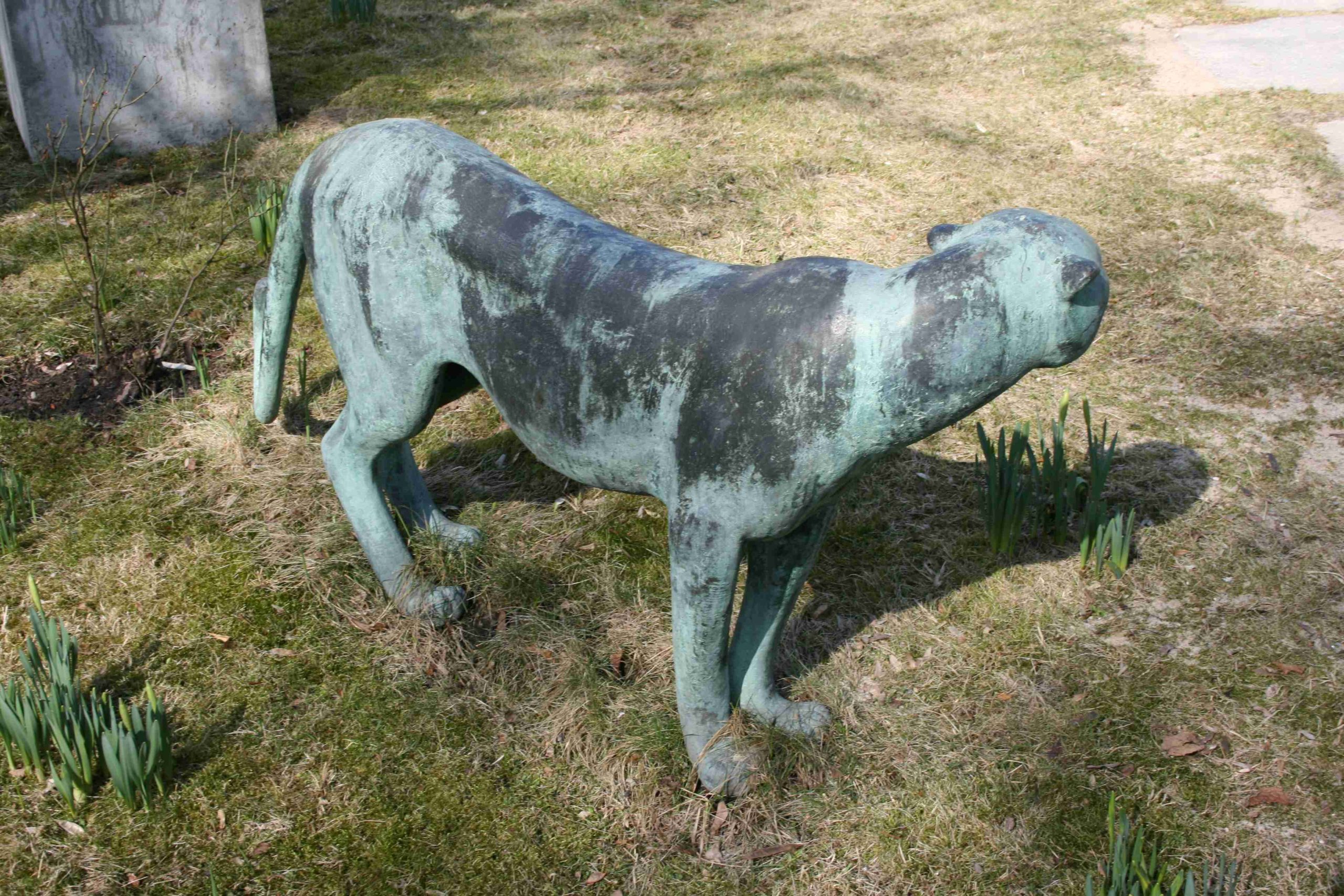 Lebensgroße, bei starker Naturnähe formal stilisierte Darstellung eines Leoparden mit nach links gewendetem Kopf und nach links gerundet ausschwenkendem Schweif. Eine Plinthe ist nicht vorhanden (Jörg Kuhn).