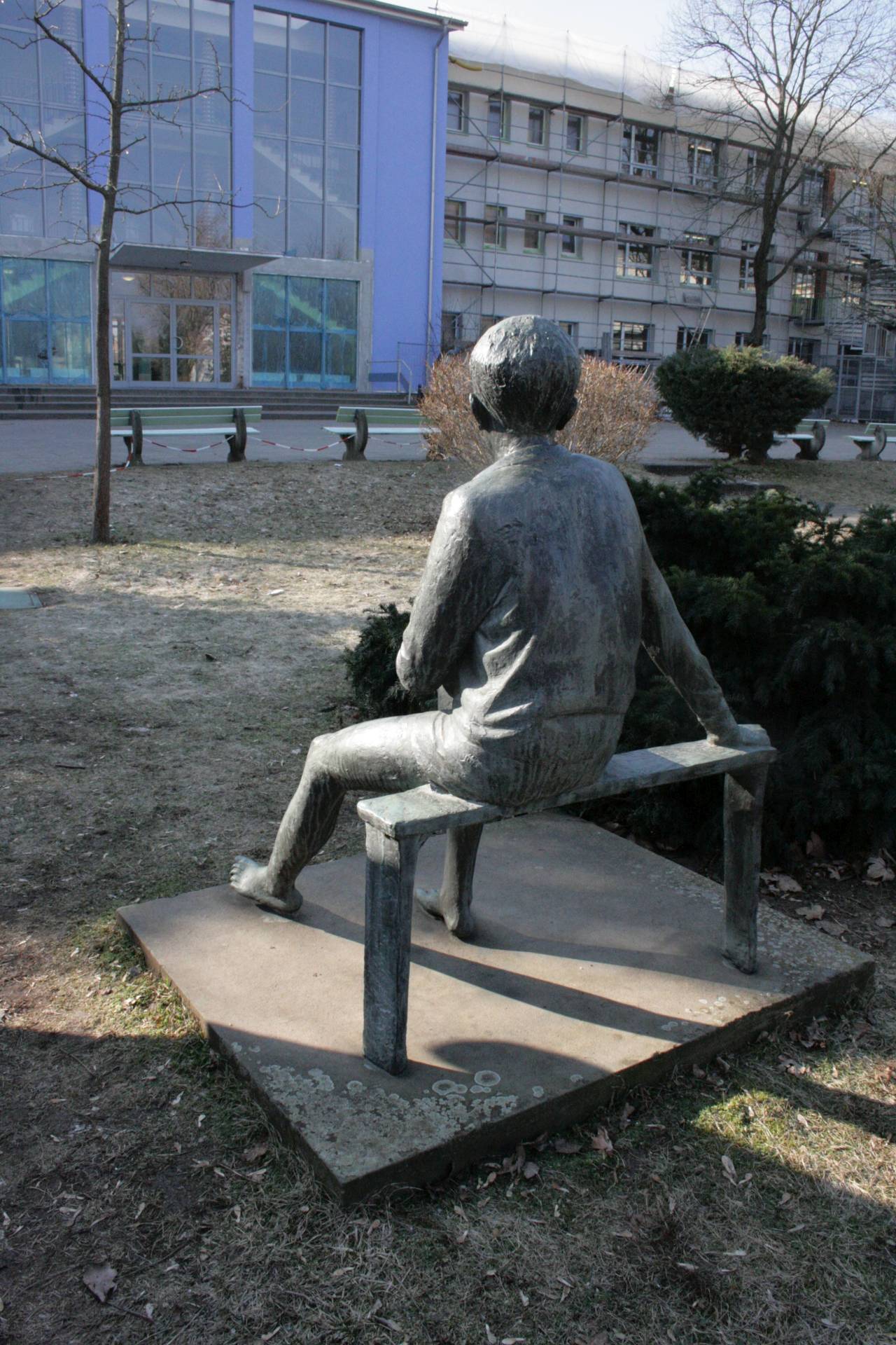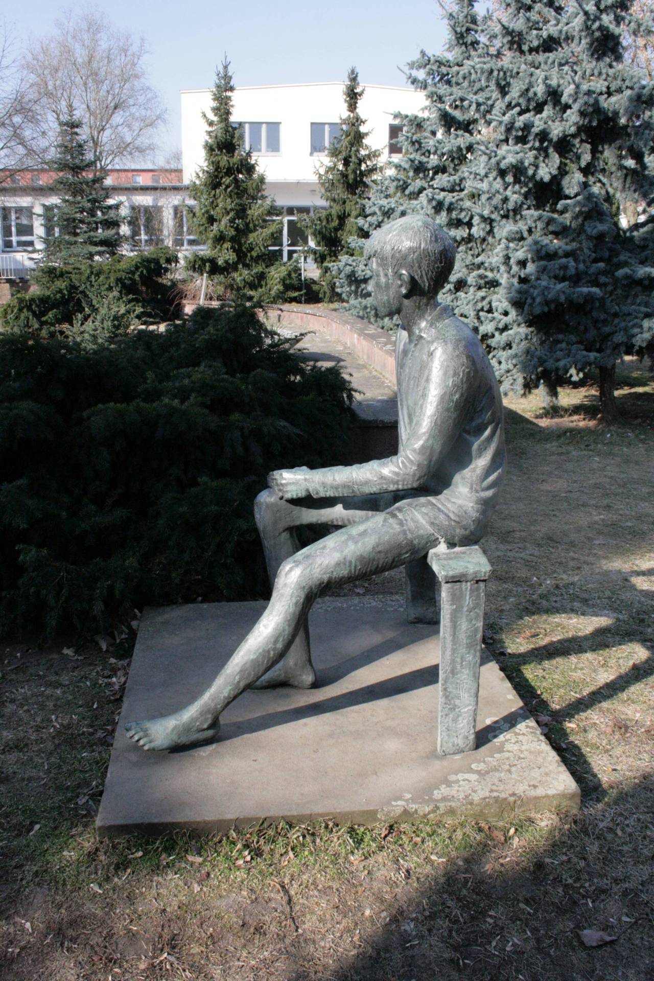 Auf einer rechteckigen, flachen Sandsteinplatte ist die relativ filigran gestaltete Bronzefigur eines auf einer schlichten Bank sitzenden Jünglings aufgestellt. Der Junge trägt eine kurze Hose und ein Hemd mit offenem Ausschnitt. Das linke Bein ist annähernd gestreckt, das rechte angewinkelt. Mit dem rechten Arm stützt er sich auf die Bank, gedankenverloren blickt er nach rechts, mit der linken Hand hält er ein auf seinem rechten Oberschenkel aufliegendes Buch, die Finger zwischen den Seiten. Eine Bezeichnung ist nicht erkennbar (Susanne Kähler, Jörg Kuhn).