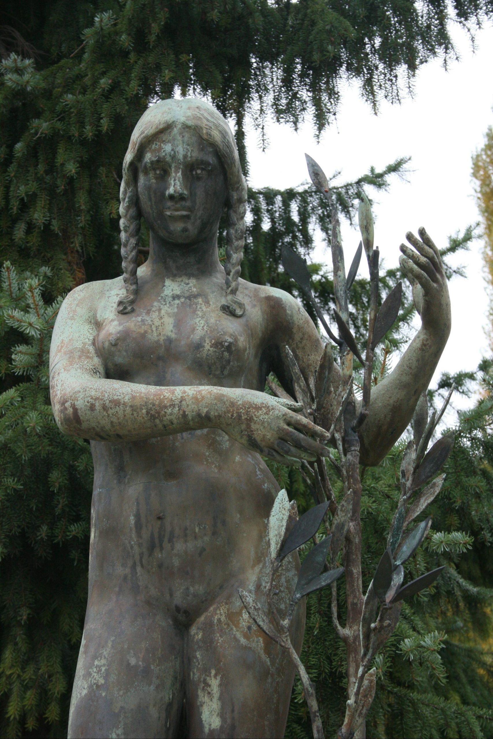 Auf einer architektonisch gestalteten Brunnenanlage steht die Figur eines unbekleideten junges Mädchens von etwa zwölf Jahren, dessen Beine im klassischen Kontrapost stehen und dessen Haartracht im merkwürdigen Kontrast zum griechisch-antik ideal gebildeten Körper steht und „Gretchenzöpfe“ zeigt. Das Mädchen hält mit beiden Händen ein Oleanderbäumchen, das ihr links (vom Betrachter aus rechts) zur Seite steht. Die Bronzeplastik auf quadratischer Plinthe.