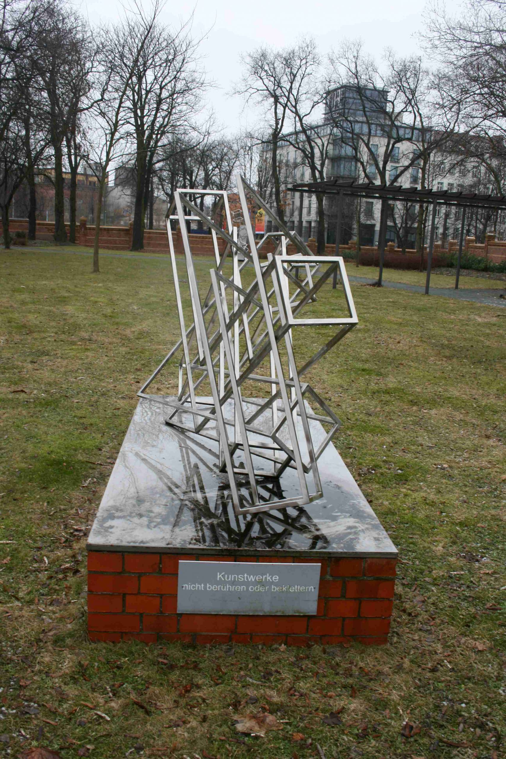 Die Plastik steht auf einem niedrigen, rechteckigen, aus roten Ziegelsteinen gemauerten Sockel, eine Stahlplatte deckt den Ziegelsockel ab und bildet die Plinthe des Kunstobjekts. Die Plastik selbst ist vollständig abstrakt. Sie besteht aus dünnen Vierkant-Edelstahl-Stäben, die in rechten Winkeln miteinander verschweißt sind. Die Stäbe sind zu vier Elementen zusammengefügt, jedes dieser vier Elemente hat wiederum die Form eines rechten Winkels. Diese Winkel oder „Quadergitter“ (wie der Künstler selbst sie nennt) greifen ineinander und bilden so ein geschlossen wirkendes Gebilde, bei dem erst bei genauerem Hinsehen die einzelnen Strukturen erkennbar werden (Susanne Kähler, Jörg Kuhn).