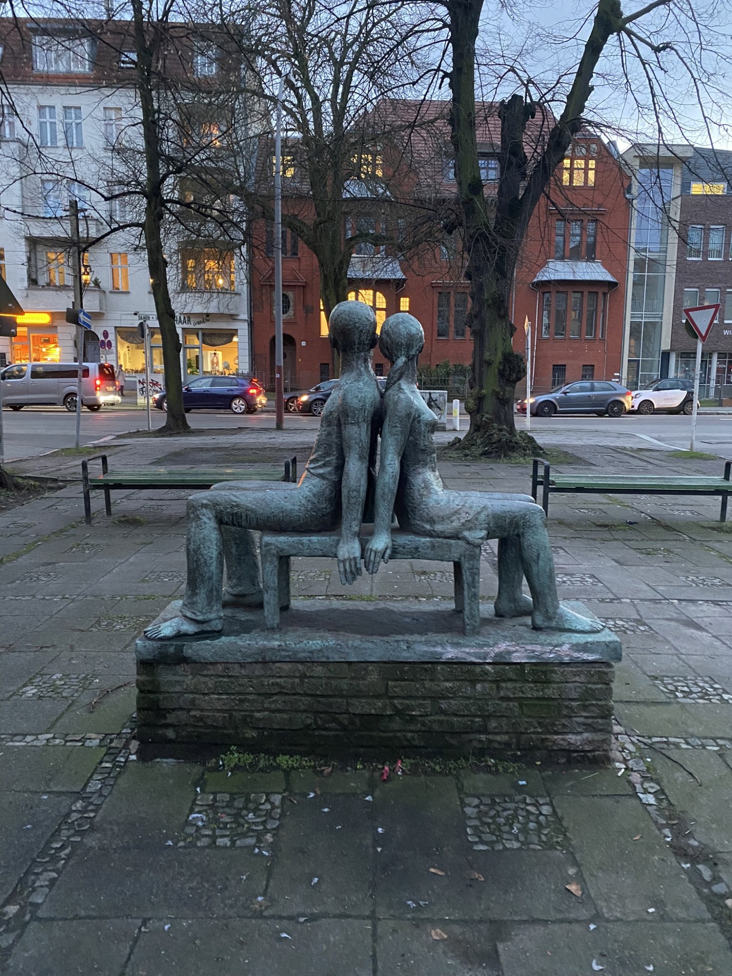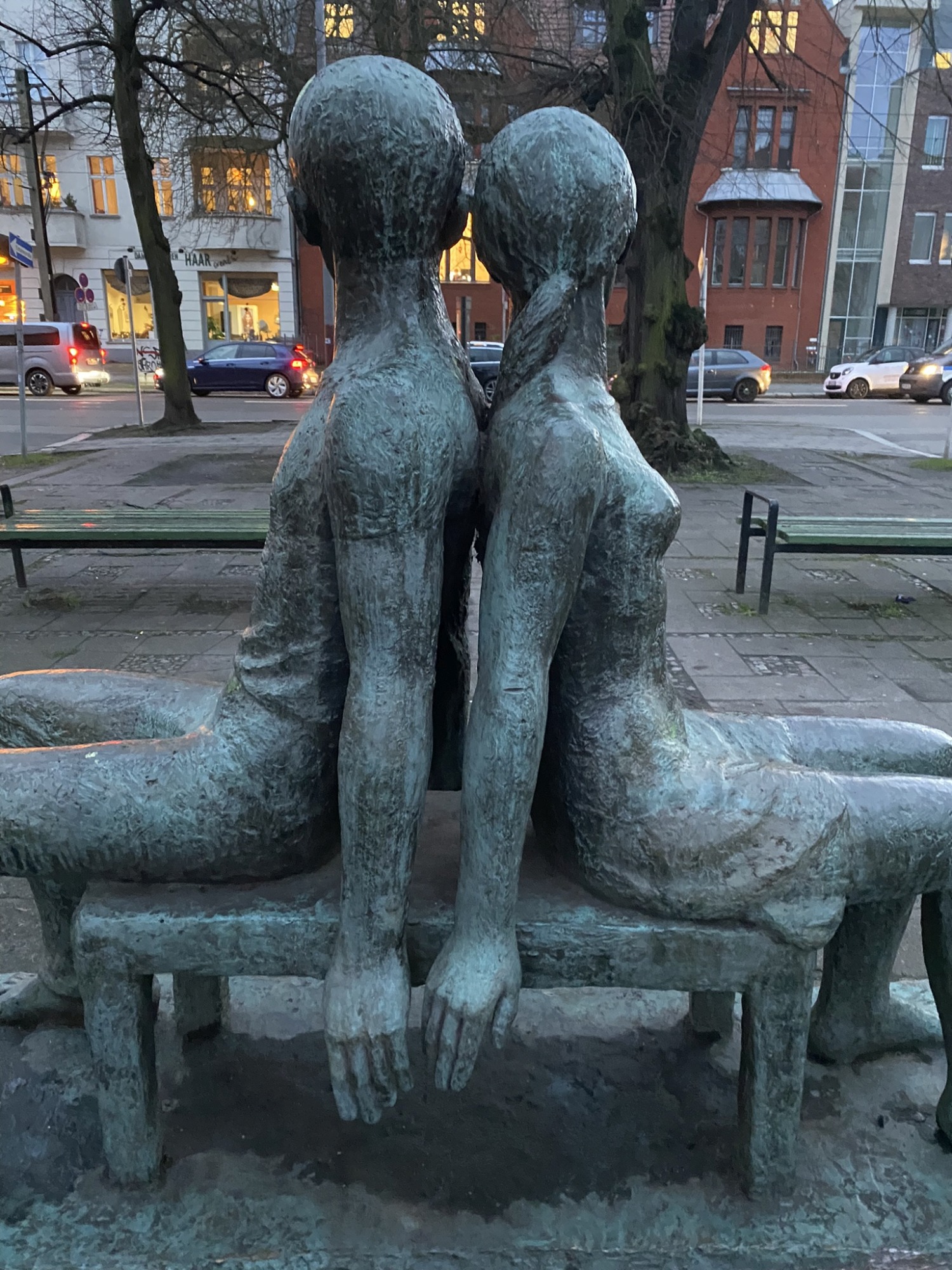 Ensemble einer Frau und eines Mannes, die auf einer Bank Rücken an Rücken sitzen (Endlich 1990, S. 318).