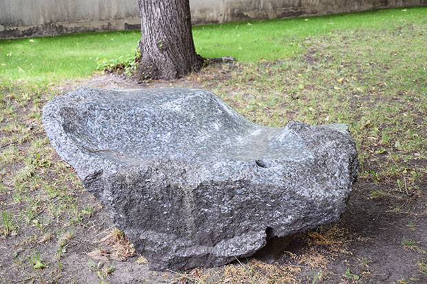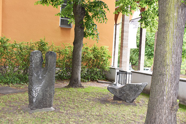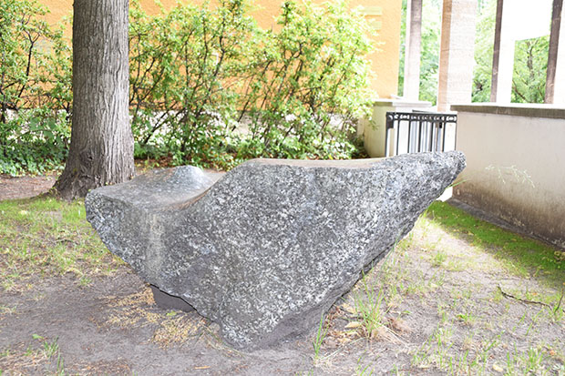 Sowohl die Skulptur von Rainer Fest, als auch die vier Jahre später gefertigte Figur von Monika Schnitzler sind schwarzem norwegischen Labradorgranit entstanden. Der liegende Stein von Monika Schnitzler hat eine gänzlich abstrakte, amorphe Form. Die relativ flache Oberseite ist zum Teil glatt poliert und weist einige Wellenformen auf. Im unteren, nur grob behauenen Bereich wurde eine raue Oberfläche belassen. Die Form erinnert entfernt an eine Kufe oder Schale, die Skulptur wird durch eine kleine unauffällige Stütze in seiner Position gehalten. Im unteren Bereich befindet sich zudem ein durchgehendes Bohrloch. Die titellose schlichte Gestaltung der recht unbekannten Künstlerin Monika Schnitzler bildet mit seiner flachen Form einen guten Kontrast oder Gegenpol zu der aufrechten Stele von Rainer Fest, das in beiden Fällen verwendete Material des Labradorgranits ist das verbindende Element.