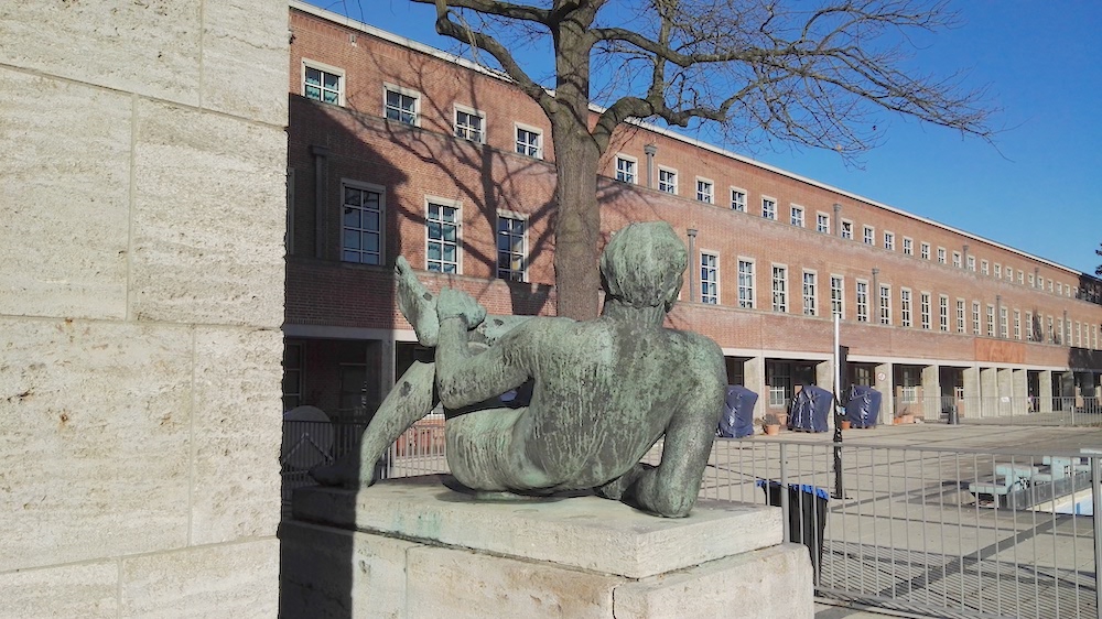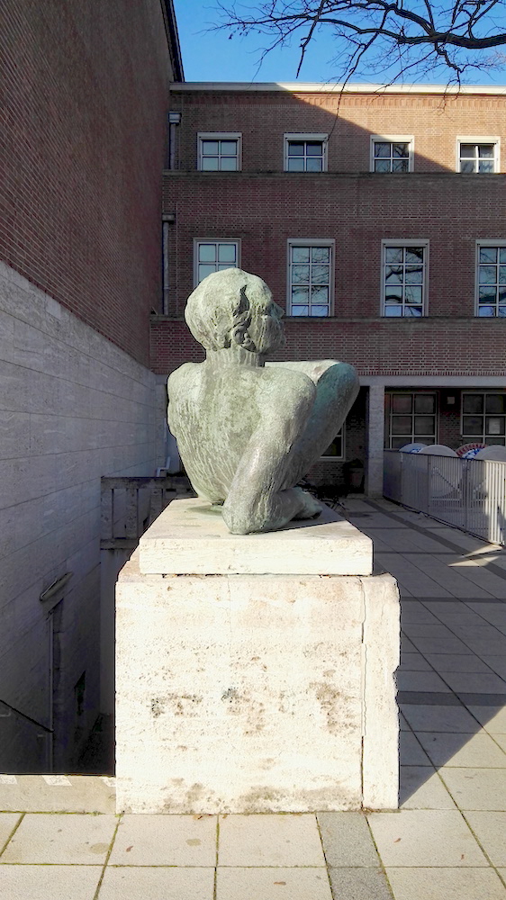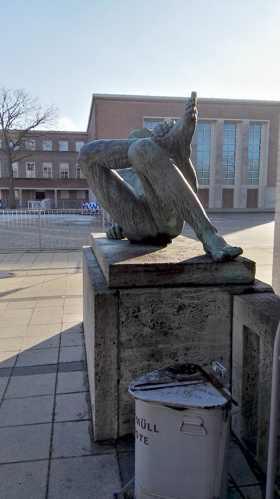 Ähnlich wie der „Ruhende Sportler“ in der Conrad-Blenkle-Straße ist hier ein nackter junger Mann in einer liegenden Haltung dargestellt. Den rechten Knöchel entspannt auf dem Knie des anderen Beines abgelegt und auf seinem rechten Unterarm aufgestützt, blickt er aufmerksam in einer halbaufrechten Position in seine Umgebung. Der „Sportler“ fügt sich thematisch gut in die Umgebung der Sportschule im Olympiapark ein. Platziert neben der Schwimmhalle, ist sein Blick auf die Startblöcke des Außenbeckens gerichtet. So erweckt es den Anschein, als beobachte er während einer Pause die jungen Sportler bei ihrem Training. (Matthias Gegner)