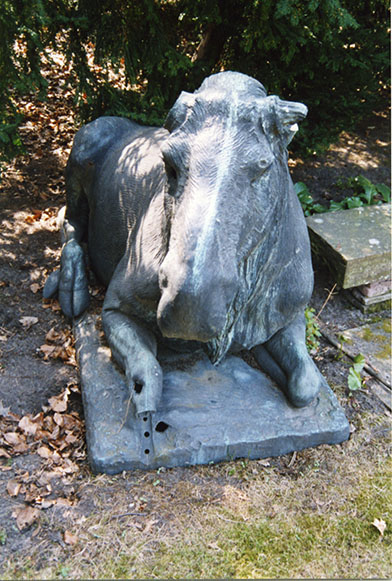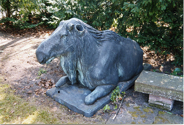 Auf einer rechteckigen Plinthe mit Naturrelief liegt die im Sinne des neubarocken Realismus gestaltete Figur einer Elchkuh. Der Kopf, ehemals von einem mächtigen Schaufelgeweih bekrönt, ist leicht zur Seite gewendet. Der rechte Vorderlauf hing ursprünglich über den Plinthenrand an der schmalen Vorderseite herab. (Susanne Kähler, Jörg Kuhn)
