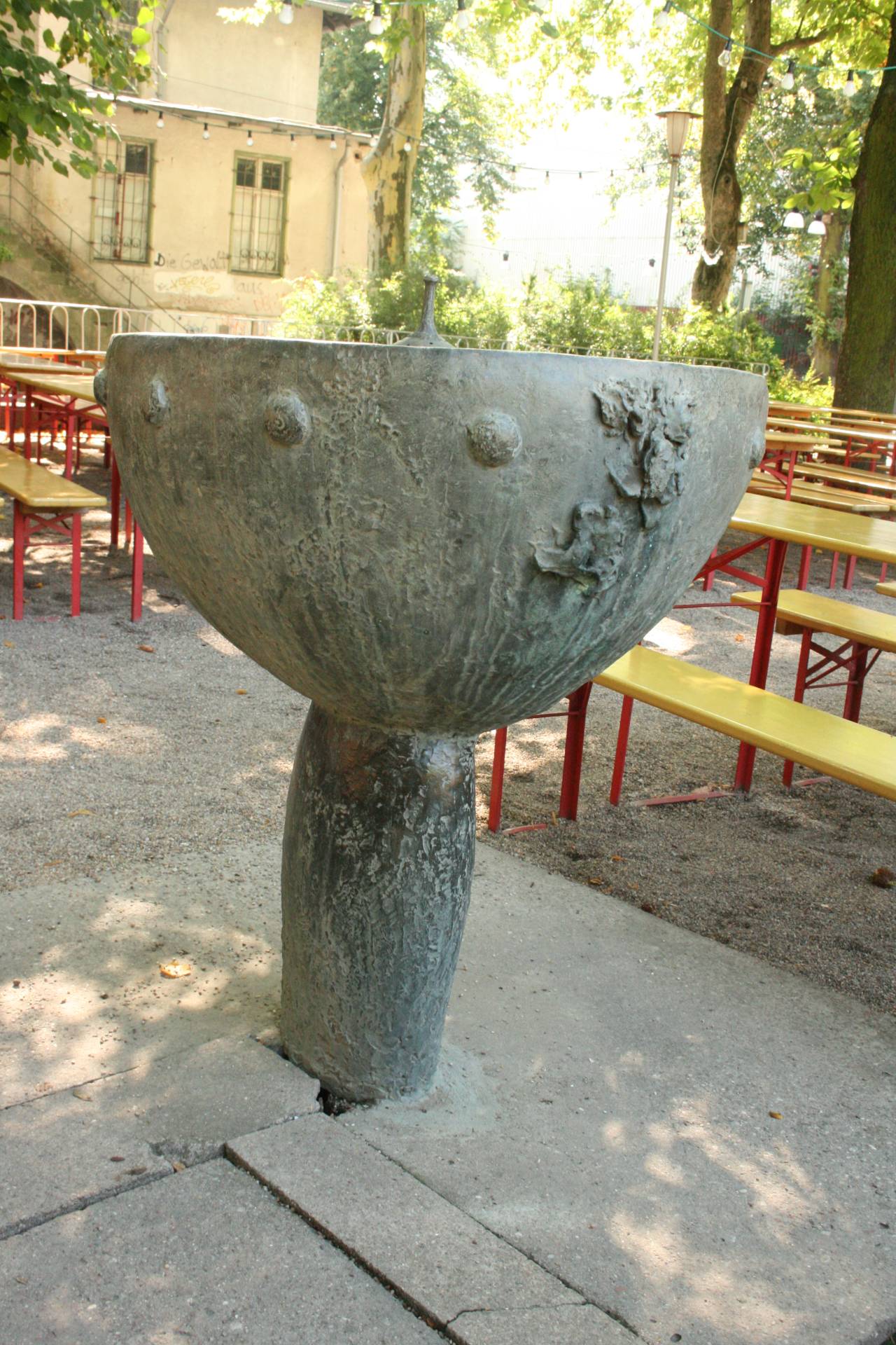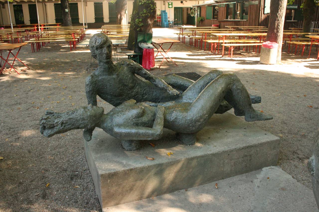Inmitten des Biergartens, unter alten Kastanien, Linden und Platanen steht auf rechteckigem Betonsockel die Plastik „Liegendes Paar“. Die beiden Figuren sind auf je zwei kleinen mitgegossenen Sockeln geradezu schwebend gelagert. Die Frau liegt auf dem Rücken, sie ist nackt, hat die Beine angewinkelt und die Hände auf den Bauch gelegt. Die Haare stehen in einer seltsam anmutenden Frisur vom Kopf ab. Der Mann ist rechts neben ihr auf der Seite liegend, aufgestützt und ebenfalls unbekleidet. Er schaut über sie hinweg in Richtung Brunnen. Die Bronzen haben eine bewegte, für Sabina Grzimek typische Oberfläche. Die Figuren sind leicht abstrahiert. Links des Betonsockels befindet sich die mit einer Betondecke versehene Brunnenkammer des links neben dem „Liegenden Paar“ stehenden Brunnens. Auf einem gedrückten ovalen Fuß ruht in der Anmutung eines Weinpokals die ovale Kuppa mit Noppen und abstrakten Reliefbildern (evtl. Baum und zwei sitzende Figuren unter einer Wolke). Die Bronze ist grünlich patiniert. Im Zentrum des Brunnenbeckens befindet sich ein Wasseraustritt, der helmartig gebildet ist, das Wasser tritt aus der Düse oben und dank unregelmäßig um den Mitteldorn angeordneten Löchern auch seitlich aus und tropft ins Becken (Jörg Kuhn, Susanne Kähler).