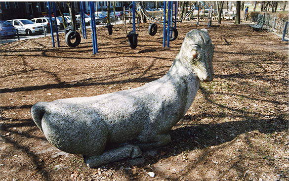 In formal stilisierter Form ist ein auf seinen untergeschlagenen Beinen liegendes Pferd dargestellt. Während bestimmte Details durchaus naturalistisch gebildet sind, wie der Ansatz des Pferdeschweifs und die Beine, ist doch der extrem gelängte Rücken und der proportional dazu zu kleine Kopf mit den übergroßen und zudem pferdefremd geformten Augen der Funktion des Kunstwerks als Kletterfigur und damit als „Spielzeug“ angepasst und gegenüber einer realistischen Pferdedarstellung verfremdet (Jörg Kuhn).