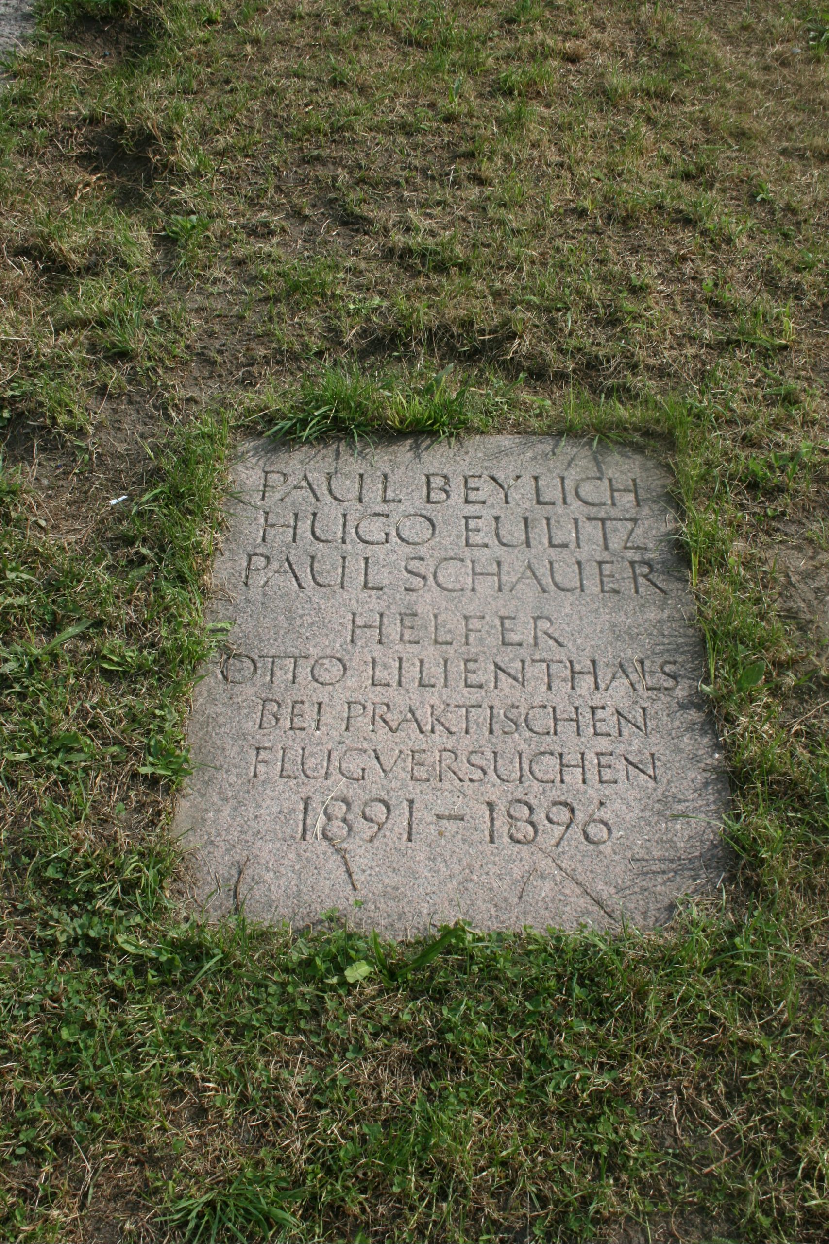 Rechts (vertieft): PAUL BEYLICH/HUGO EULITZ/HANS SCHAUER/HELFER/OTTO LILIENTHALS/BEI PRAKTISCHEN/FLUGVERSUCHEN/1891-1896.
