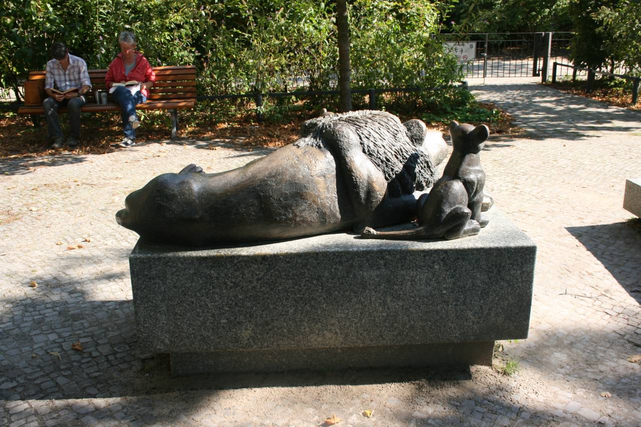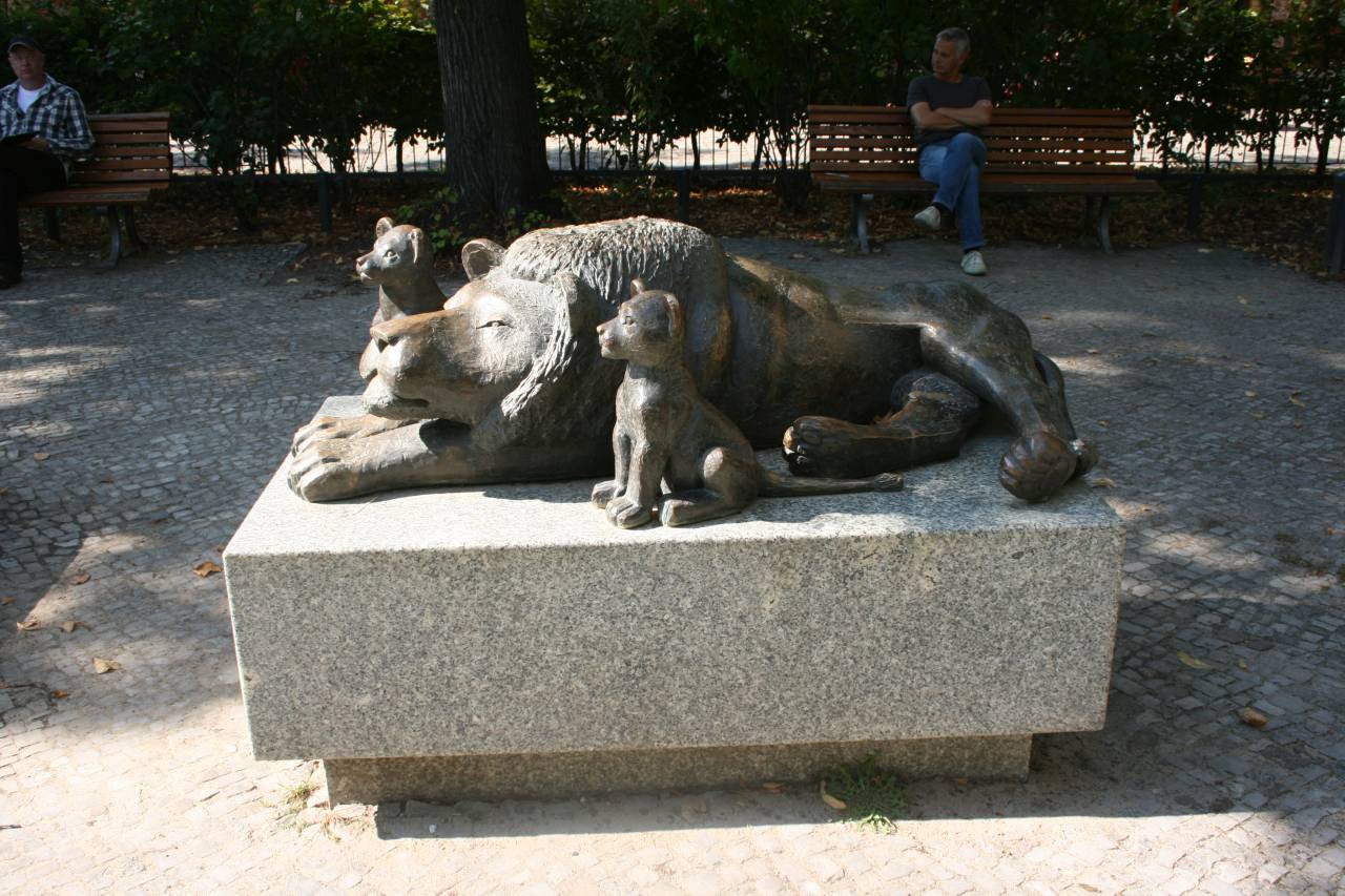 Das Kunstwerk besteht aus zwei selbständigen Elementen, nämlich einem Brunnen und einer Skulptur, die jedoch materialgleiche Ähnlichkeiten aufweisen und achsial auf einander bezogen sind, so dass von einer Einheit von Brunnen und Löwengruppe gesprochen werden kann etwa in Form von „Löwenbrunnen“ (vgl. Senatsverwaltung für Kultur; Brunnen). Die Löwenfigur ist unter an der Sohle der rechten Hinterbeintatze mit Stefan Horotas legiertem Monogramm H und S bezeichnet.