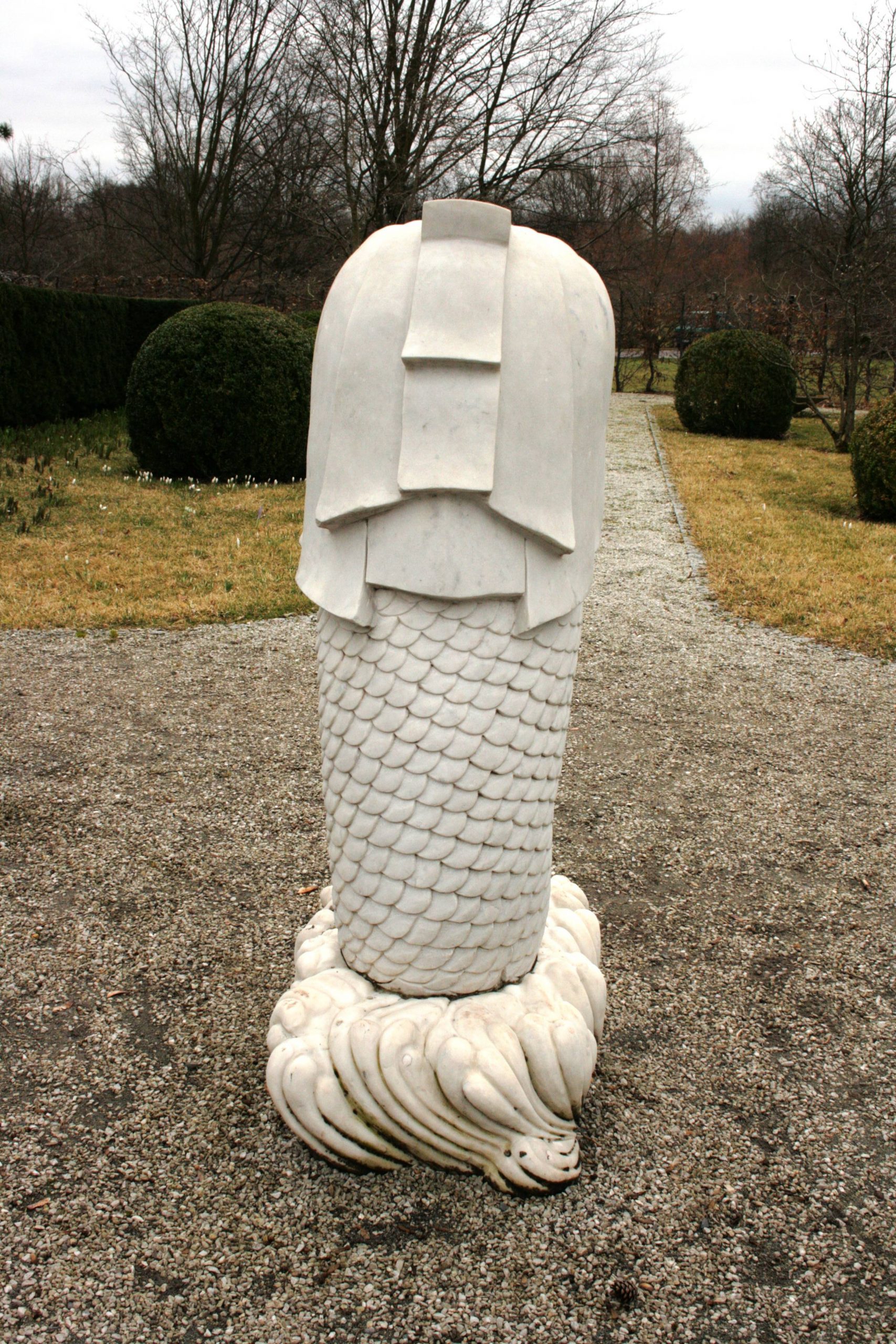 Die Marmorskulptur steht in einem der Themengärten des Britzer Gartens. Sie stammt aus den „Gärten der Welt“ in Berlin-Marzahn (Information Frau Kleuvers, Grün Berlin GmbH, Parkverwaltung Britzer Garten).