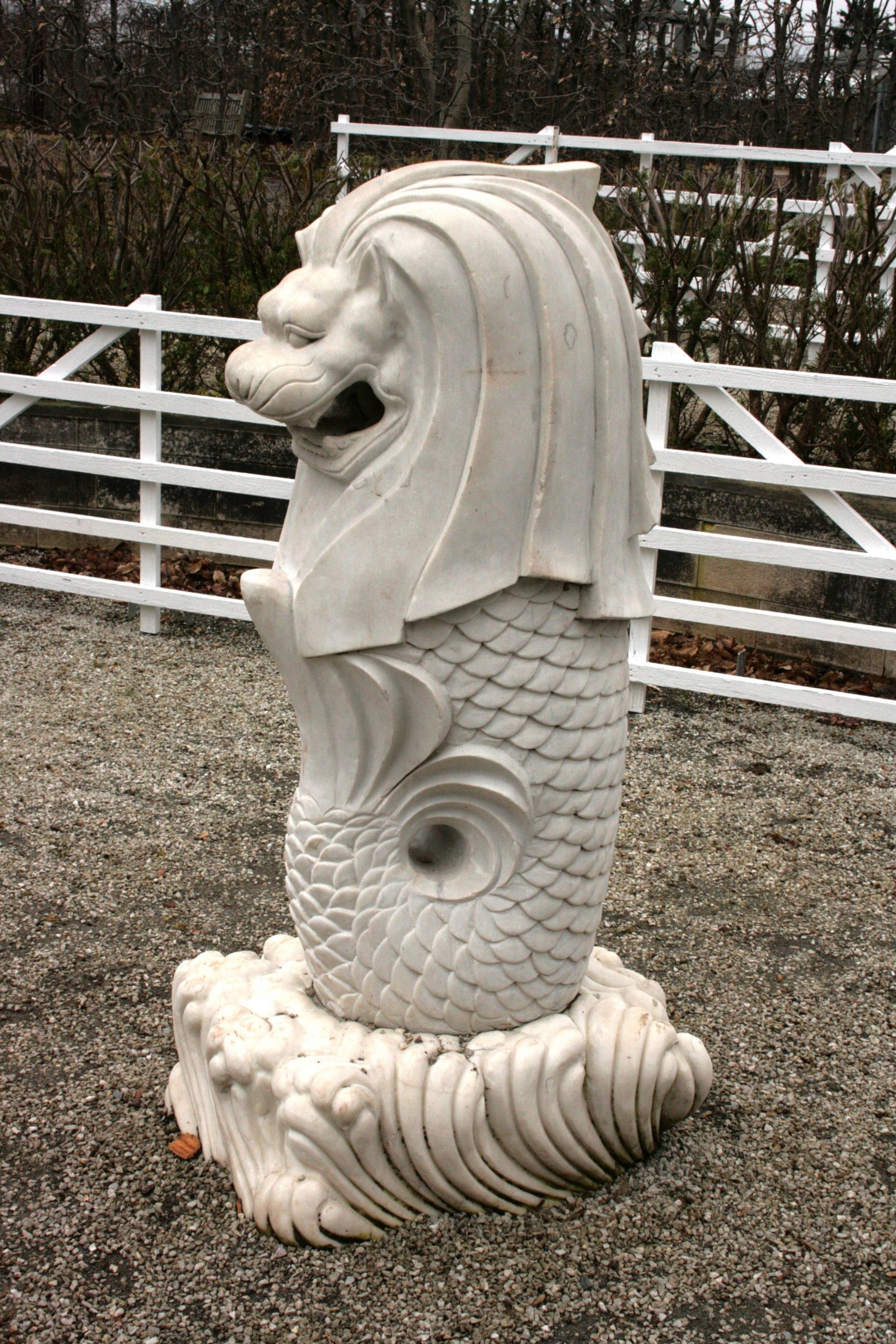 Dargestellt ist ein Fabel- oder Mischwesen aus Löwe und Fisch, gearbeitet aus weißem Marmor. Auf stark stilisiert wiedergegebenem, bewegtem Wasser steht der geschuppte Fabelfisch, den Schwanz mit der Schwanzflosse nach oben gebogen auf seinem im unteren Bereich biegsam gerundeten Körper. Der dem Fischkörper aufsitzende Kopf zeigt das Gesicht eines Löwen, während der restliche Kopf mit einem gestuften Helm oder Tuch bedeckt ist. Die Helm- oder Tuchform erinnert stark an asiatische Kampfhelme. „Wasser“ und „Fisch“ sind separat gearbeitet. Insgesamt eine dem asiatischen Raum zuzuordnende Arbeit (Jörg Kuhn).