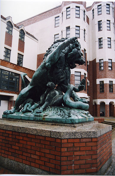 1883 präsentierte Albert Wolff auf der Ausstellung der Königlichen Akademie der Künste den kleinformatigen Gips einer mehrfigurigen Tiergruppe, den Kampf eines Löwen gegen eine seine Jungen bedrohende Riesenschlange darstellend. Noch in den alten Werkstatträumen im ehemaligen Alten Lagerhaus entstand danach bis 1887 der großformatige Ausführungsgips. Nach Wolffs Tod 1892 erwarb die Stadt Berlin von den Erben das große Gipsmodell und ließ es in Lauchhammer gießen. Am 15. Juni 1895 wurde das Bildwerk auf hohem Sandsteinsockel auf dem Vorplatz vor dem 1881 fertiggestellten Kriminalgericht in Moabit eingeweiht. Dort sollte die Gruppe „als Sinnbild des siegreichen Kampfes der Gerechtigkeit gegen das Schlangengezücht der Lüge“ (Hermann Müller-Bohn, 1905) dienen. Ein interessantes Beispiel der Rezeption der Löwengruppe stellt ihre zwischen 1923 und 1926 belegte Verwendung als Emblem im Titelkopf der Zeitschrift „Die Freundschaft. Monatsschrift für den Befreiungskampf andersveranlagter Männer und Frauen“ dar (vgl. Ausst.-Kat. Eldorado. Homosexuelle Frauen und Männer in Berlin 1850-1950, hrsg. vom Berlin Museum, Berlin 1984, S. 39). Das reine Motiv des Kampfes zu Zwecken der Verteidigung lässt sich im Zusammenhang mit seiner Verwendung als Emblem der Zeitschrift, die als eines der wichtigen Publikationsorgane des von Dr. Magnus Hirschfeld 1897 in Berlin begründeten „Wissenschaftlich-Humanitären Komitees“, einer bis 1933 in Berlin-Tiergarten ansässigen Institution, deren eines bedeutende Ziel die Abschaffung des §175 war, als Verbildlichung des Kampfes homosexueller Männer und Frauen gegen Unterdrückung und Verfolgung und für Freiheit und gesellschaftliche Anerkennung interpretieren (vgl. Jörg Kuhn: Der „Moabiter Löwe“ als Emblem der Zeitschrift „Die Freundschaft“, in: Capri. Zeitschrift für schwule Geschichte, hrsg. von Manfred Herzer/Freunde und Förderer eines Schwulen Museums Berlin, Berlin 1994). Der repräsentative Kopfbau des Alten Kriminalgerichts an der Rathenower Straße, Ecke Alt-Moabit wurde im Zweiten Weltkrieg beschädigt und 1953 abgerissen. Die Löwengruppe wurde 1962 im Innenhof des 1902-1906 errichteten Gerichtsgebäudes (ehem. Neues Kriminalgericht, Heute Landes- und Amtsgericht Tiergarten) an der Turmstraße 89-93, Wilsnacker Straße 3-5 aufgestellt. 1990 wurde die Löwengruppe während der Ausstellung "Ethos und Pathos. Die Berliner Bildhauerschule 1786-1914" im "Hamburger Bahnhof" in Berlin gezeigt. Im Zuge des Umbaues, beziehungsweise der 1991/92 erfolgten Erstellung eines Neubaues für das Amtsgericht Tiergarten an der Wilsnacker Straße 3-5 wurde die Löwengruppe auf einem neuen, der Fassadengestaltung in Form und Material angeglichen gestalteten Sockel neu aufgestellt. Ob der 1962 geschaffene Waschbetonsockel bei dieser Gelegenheit vollständig ersetzt worden, oder nur neu verkleidet worden ist, konnte nicht in Erfahrung gebracht werden (Jörg Kuhn).
