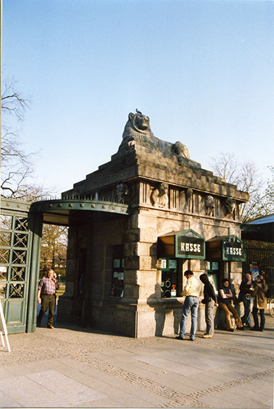 Der Zooeingang gegenüber der Stadtbahn, am heutigen Hardenbergplatz, war in anderer Form 1881 angelegt worden, um der neuen Verkehrsverbindung gerecht zu werden. Der Zoo musst damals einen 11 Meter breiten Geländestreifen an die Stadt abtreten. Zunächst stellte man 1881 provisorische Kassenhäuser auf, zwei Jahre später ersetzte man diese durch zwei Kassenhäuser aus Ziegelstein. Schließlich entwarfen die Zaar & Vahl im Auftrag des von 1888 bis 1931 amtierenden Zoodirektors Ludwig Heck künstlerisch gestaltete Kassenhäuser. Die rechteckigen Kassenhäuser mit pyramidenartigen Aufbauten und Löwenbekrönung und Tierkopfreliefs waren 1909 fertiggestellt. Der Bildhauerarbeiten übernahm vermutlich Robert Schirmer mit seiner Werkstatt. Das dazwischenliegende Tor wurde ursprünglich aus drei paar Flügeltüren gebildet, wobei das mittlere Flügeltor, die Wagendurchfahrt, in der Mitte durch stilisierte Pfauen bekrönt wurde. 1925 ergänzte man drei Kassenschalter. Das Löwentor erlitt im Zweiten Weltkrieg nur geringe Beschädigungen und konnte 1948 bereits wieder instandgesetzt werden. Aufgrund einer erneuten Geländeabtretung 1956 am Hardenbergplatz wurde das Tor abgetragen. Die Löwen wurden vorübergehend eingelagert. 1987-1988 wurde das Tor unter Verwendung der alten Löwenfiguren weitgehend in der ursprünglichen Form wieder aufgebaut (Susanne Kähler).