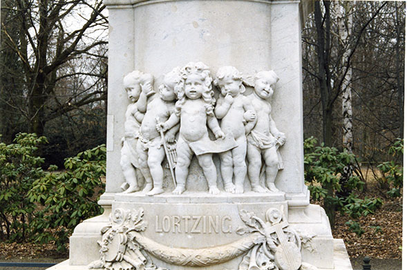 Das Standbild Lortzings steht auf einem Sockel auf einem zweistufigen Marmorpodest. Der Sockel weist an der Vorderseite eine apsisförmige Ausbuchtung auf. Den Komponisten stellte Eberlein in zeitgenössischer Tracht mit Weste und Rock dar. Der rechte Arm ist angewinkelt, in der Hand hält er die Feder. Mit seiner Linken präsentiert Lortzing einen Stapel als Notenblätter zu deutende Papiere. Die durch einen Baumstumpf gebildete Stütze wird teilweise von dem links herabhängendem Mantel bedeckt. Vor dem Rundung des Sockels sind fünf annähernd vollplastische Putten gruppiert, die als Hinweise auf die Hauptwerke Lortzings zu deuten sind. Der erste Putto (von links) stellt, stellvertretend für die Oper „Der Waffenschmied“ einen Schmied mit Hammer und Lederschürze dar, daneben steht die Figur des Bacchus mit Kellerschlüsselbund und Kelch (gemeint ist der Kellermeister Hans aus der Oper „Undine“), ein Putto als Bürgermeister mit Kette, Allongeperücke, Zeremonienstab und Blattrolle steht im Zentrum der Gruppe (aus „Zar und Zimmermann“), rechts von ihm befindet sich ein Putto mit Feder hinter dem Ohr und rechtem Zeigefinger im Mund (die Stimme der Natur aus der Oper der „Wildschütz“) und (ganz rechts) ein Putto als Corpsstudent mit Kappe und Degen (Hans Sachs?). (Susanne Kähler/Jörg Kuhn)
