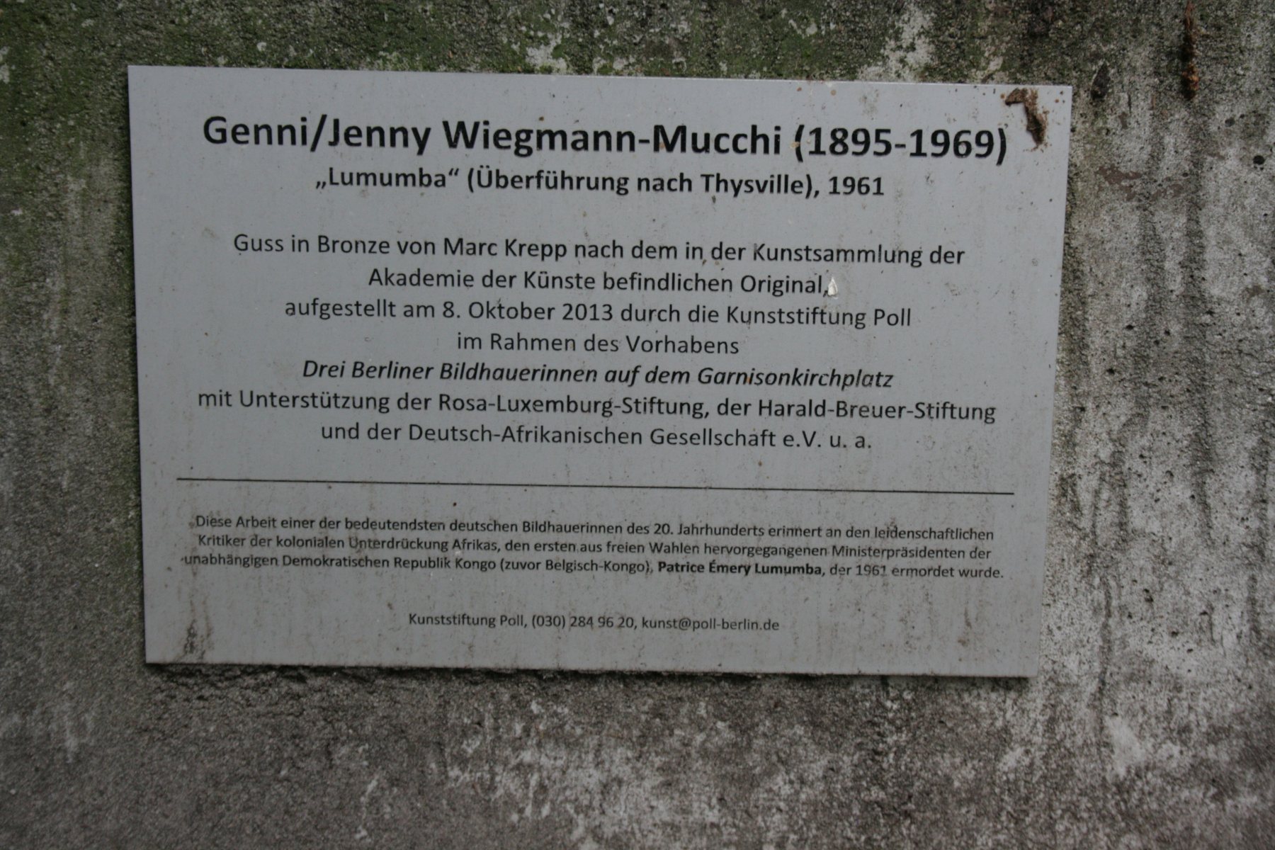 Die Darstellung Lumumbas von Jenny Wiegmann Mucchi ist als unmittelbare Reaktion auf die Ermordung des Politikers am 17. Januar 1961 und den dazugehörigen Presseberichten zu verstehen. Sie greift eine Szene aus der Geschichte heraus, die nur wenige Wochen vor seinem Tod stattgefunden hat: Am 1. Dezember 1960 wurde er nach seiner Verhaftung durch die Truppen von Oberst Mobutu in die Stadt Thysville verbracht. Der erste Guss der Figur erfolgte im Material Zement und befindet sich in der Sammlung der Akademie der Künste. Am 8. Oktober 2013 konnte der mit Unterstützung u.a. der Rosa-Luxemburg-Stiftung, der Harald-Breuer-Stiftung und der Deutsch-Afrikanischen Gesellschaft e.V. realisierte Bronzeguss durch die Kunststiftung Poll im Rahmen des Vorhabens "Drei Berliner Bildhauerinnen auf dem Garnisonkirchplatz" aufgestellt werden. (Genni. Jenni Wiegmann-Mucchi. Übersicht der Skulpturen im öffentlichen Raum in Berlin und Umgebung. Zur Ausstellung in der Galerie der Kunststiftung Poll "Le Ciel est triste et beau", 2016)