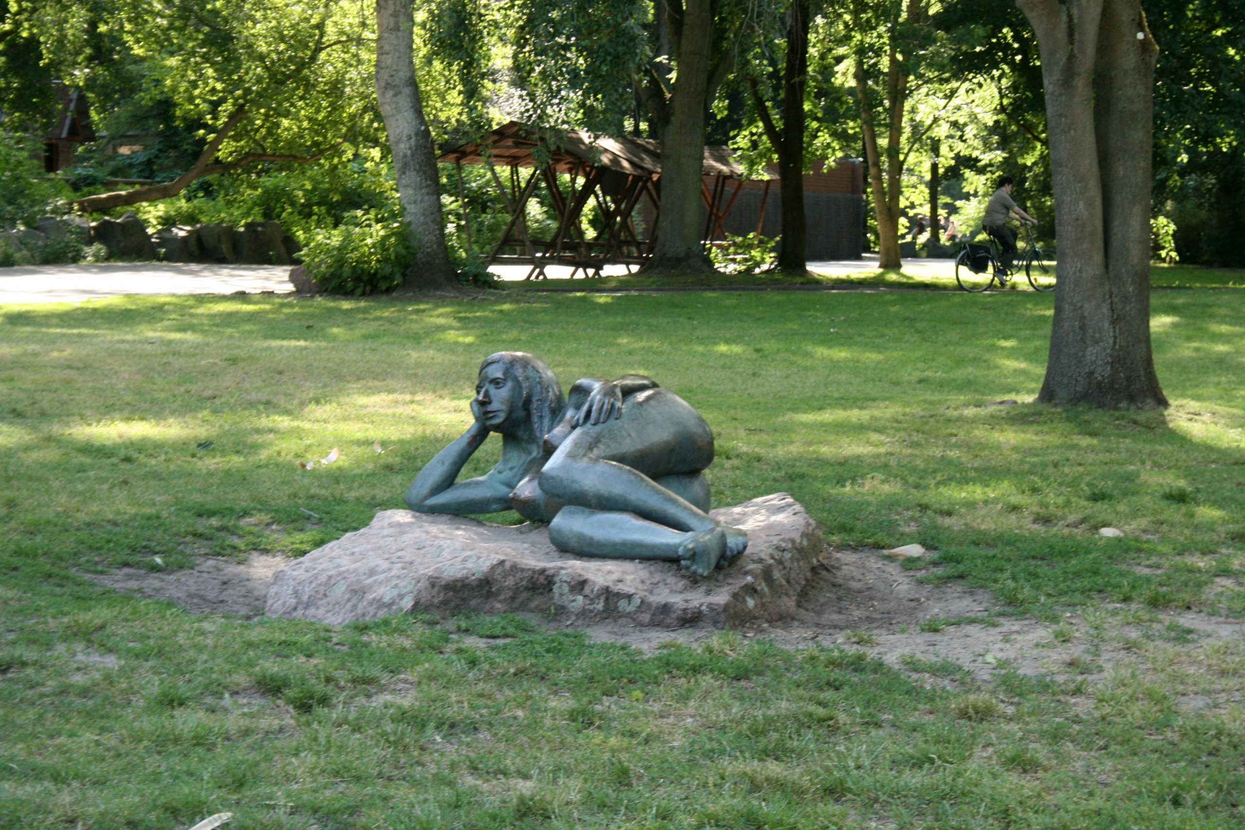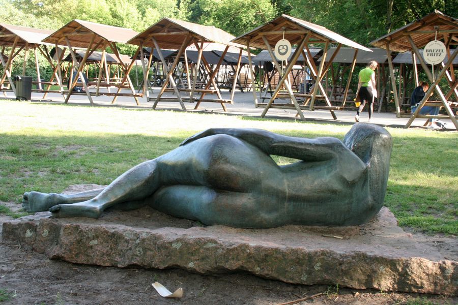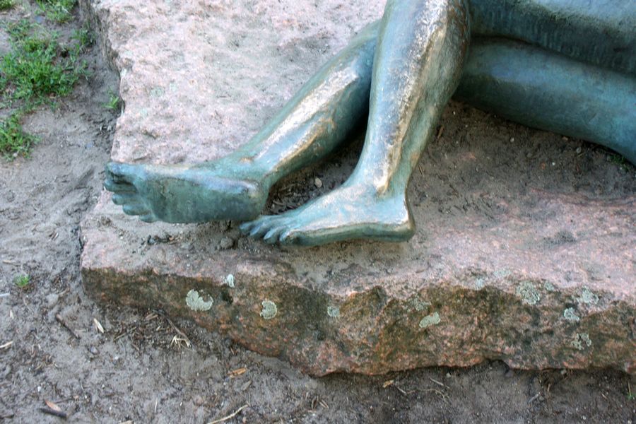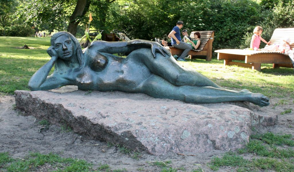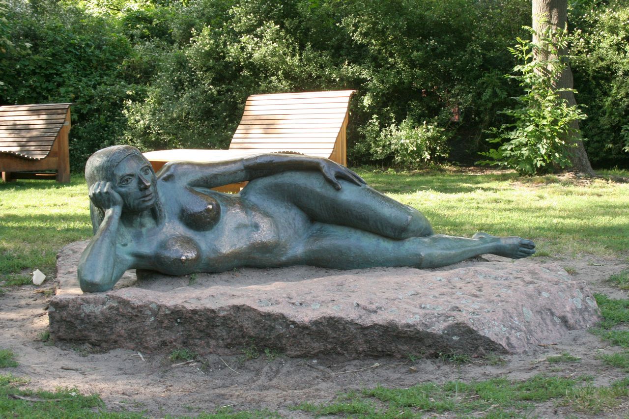 Weiblicher Akt, liegt auf irregulär, grob geglätteter Granitplatte. Die junge Frau hat den Kopf auf den rechten Arm gestützt, die linke Hand hat sie auf ihren linken Oberschenkel gelegt. Sie hält beide Beine leicht angewinkelt, wobei das linke Bein im Oberschenkel- und Kniebereich über das darunterliegende rechte Bein gelegt ist, wodurch ein ansprechendes, verschränktes Haltungsmotiv formuliert wurde (Jörg Kuhn).