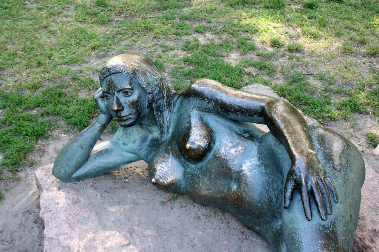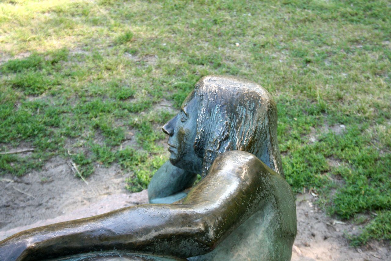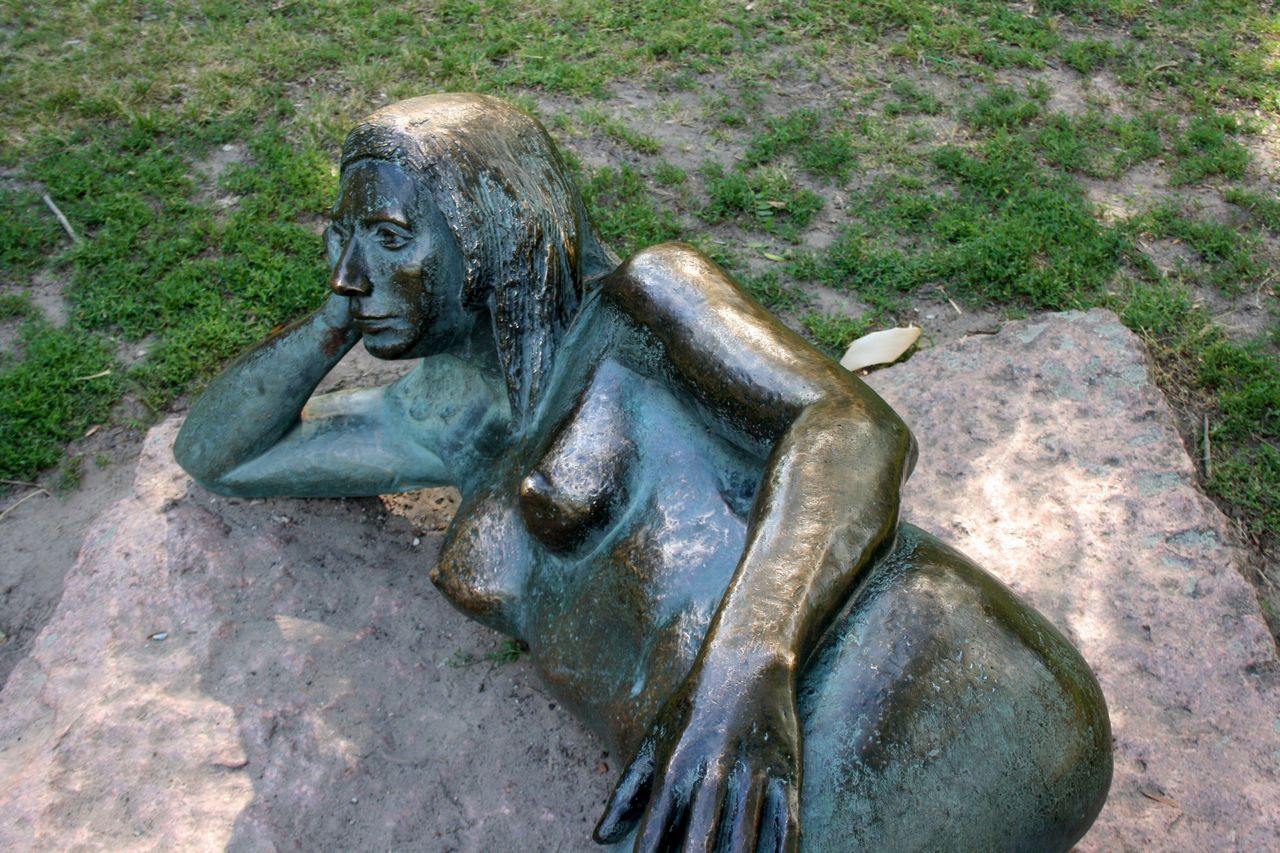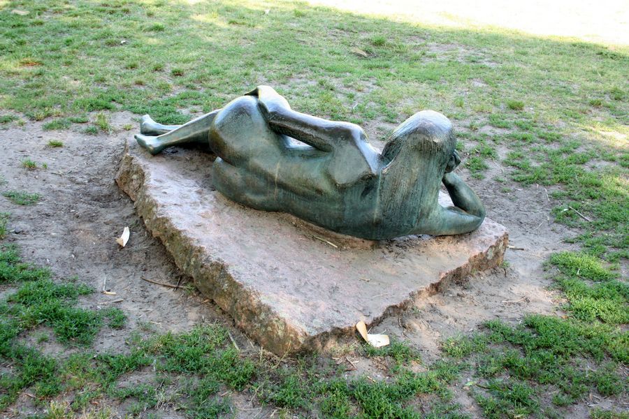 Weiblicher Akt, liegt auf irregulär, grob geglätteter Granitplatte. Die junge Frau hat den Kopf auf den rechten Arm gestützt, die linke Hand hat sie auf ihren linken Oberschenkel gelegt. Sie hält beide Beine leicht angewinkelt, wobei das linke Bein im Oberschenkel- und Kniebereich über das darunterliegende rechte Bein gelegt ist, wodurch ein ansprechendes, verschränktes Haltungsmotiv formuliert wurde (Jörg Kuhn).