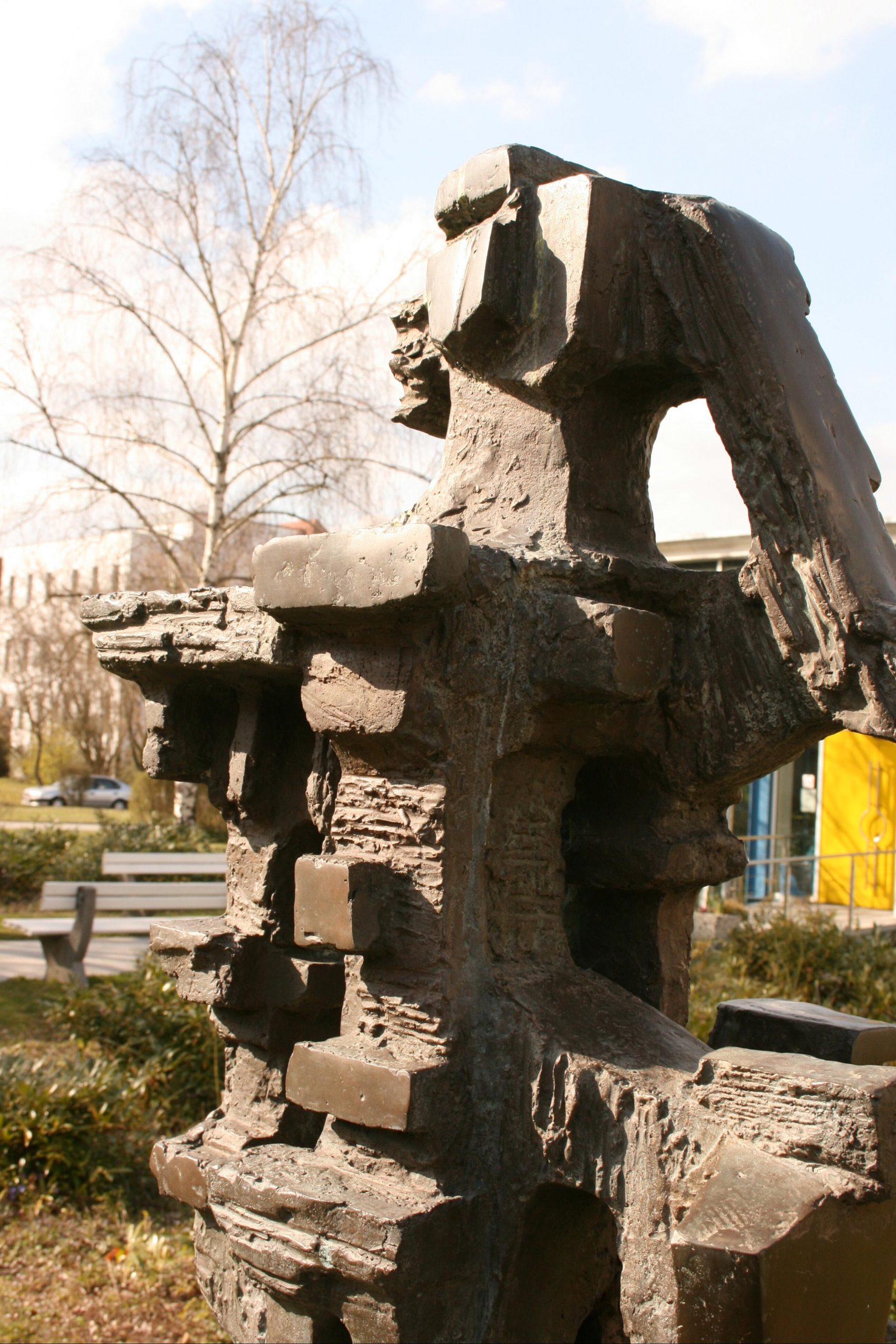 Bronzefigur über rechteckiger sehr flacher Plinthe, aufgestellt auf einem rechteckigen Betonsockel. Die Figur ist nahezu abstrakt, ist aber hauptsächlich anhand des Kopfes mit langem Pferdeschwanz als stark stilisierte menschliche Figur zu erkennen. Sie hat eine betont aufrechte Haltung. Der Körperaufbau, dessen Struktur zahlreiche Durchbrechungen aufweist, ist alternierend aus glatten und rauen Flächen aufgebaut. (Jörg Kuhn).