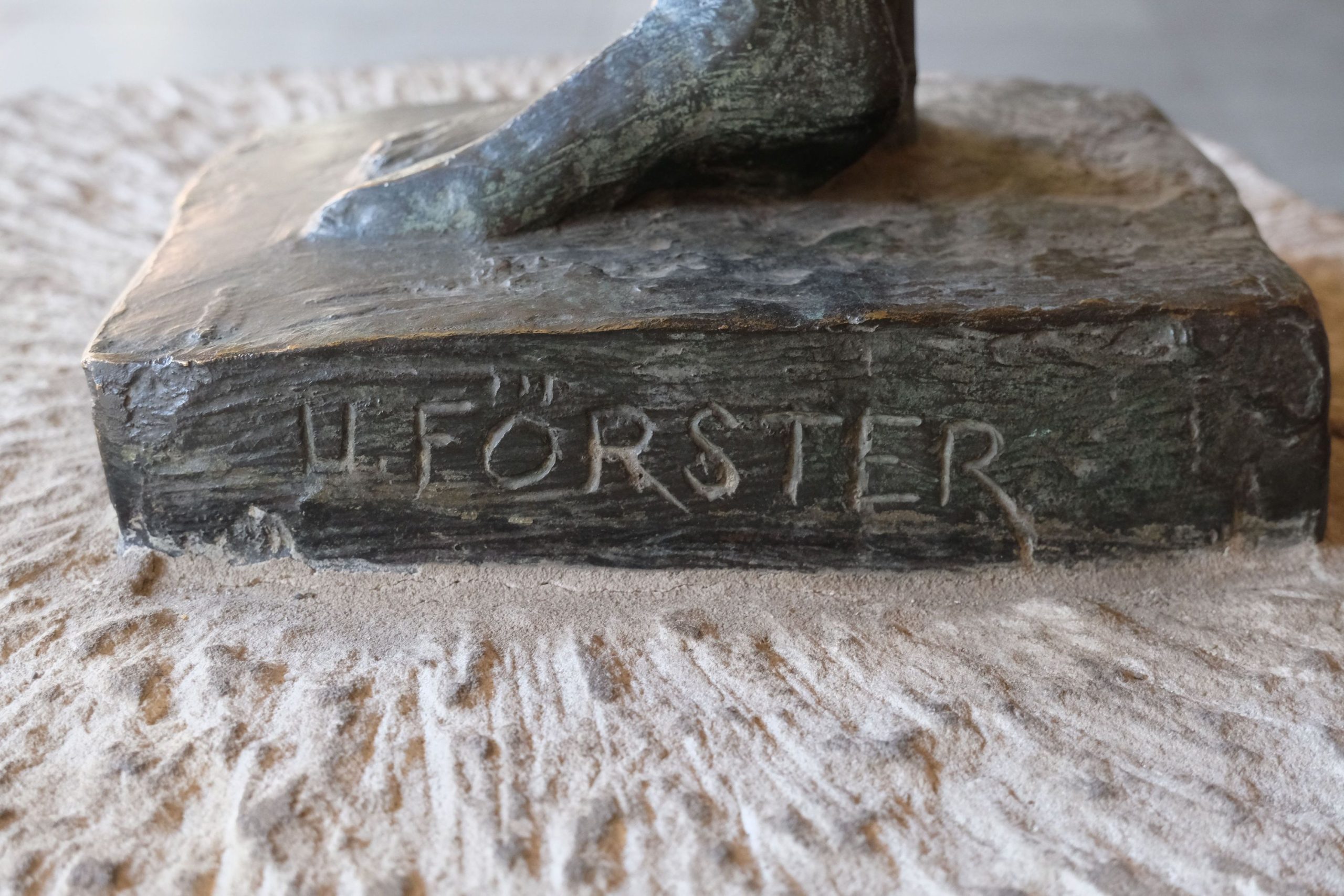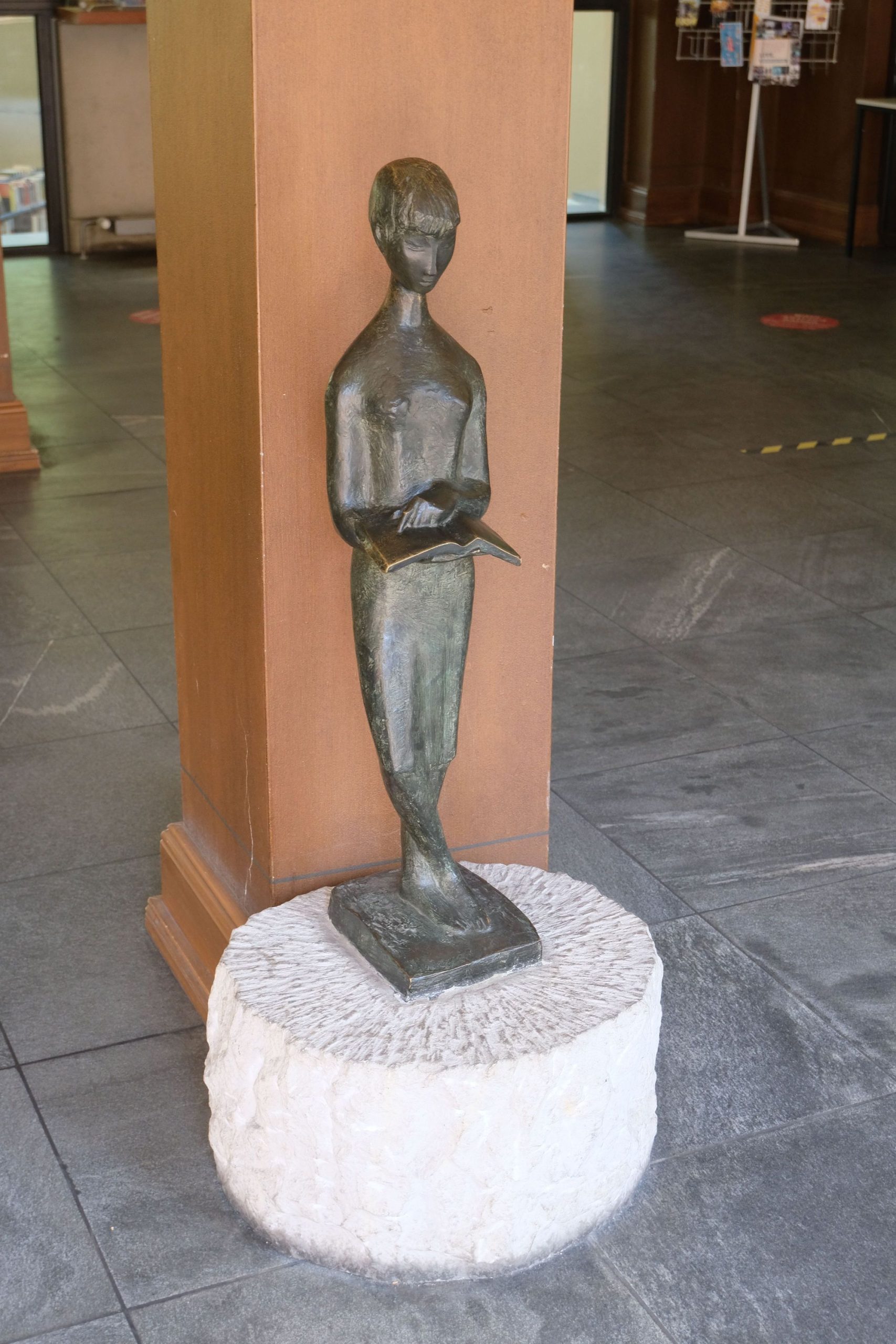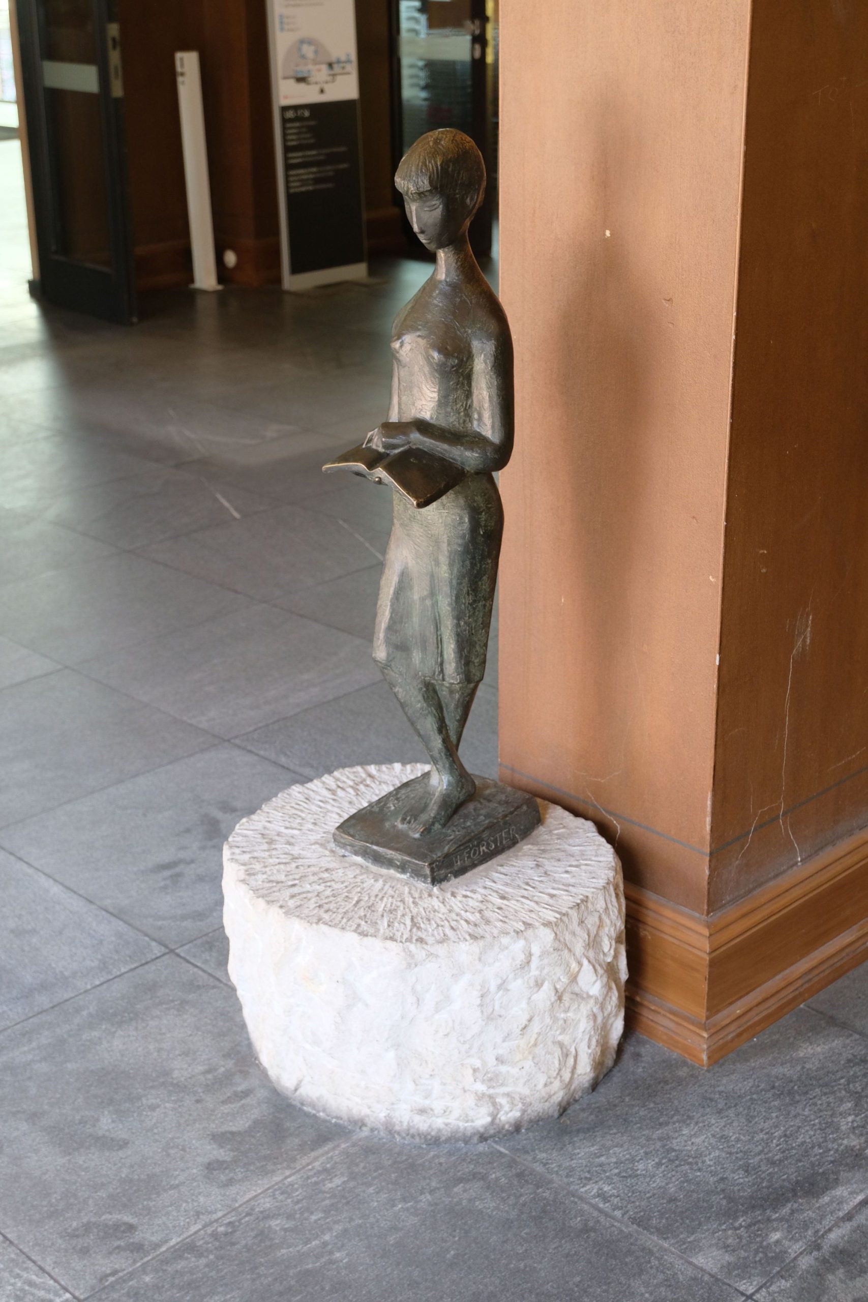 Auf einem grob gehauenen zylinderförmigen Sockel mit strukturierter Oberfläche steht die Freiplastik eines jungen Mädchens, die im Stand ein Buch liest. Sie steht locker mit gekreuzten Beinen und aufrecht. In der rechten Hand hält sie das aufgeklappte Buch und fährt mit dem Zeigefinger der linken Hand über die Zeilen, welche nicht detalliert dargestellt sind. Sie trägt ein langes Kleid und hat kurze Haare (Pauline Ahrens).