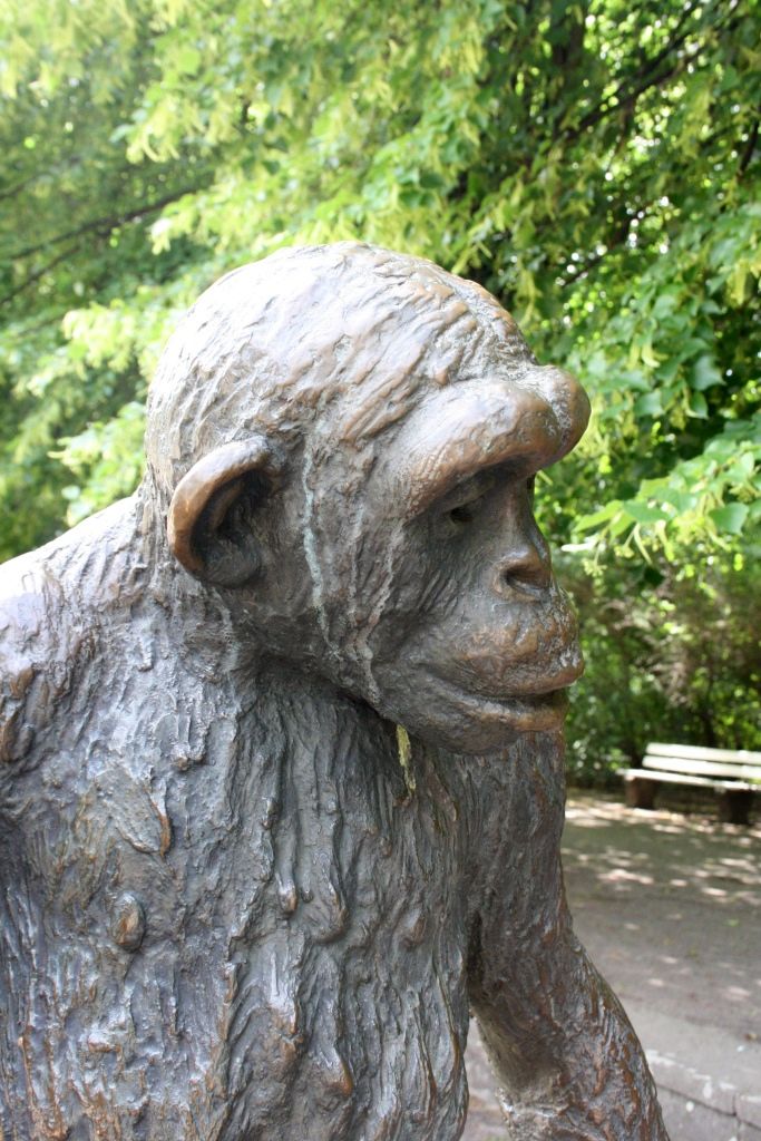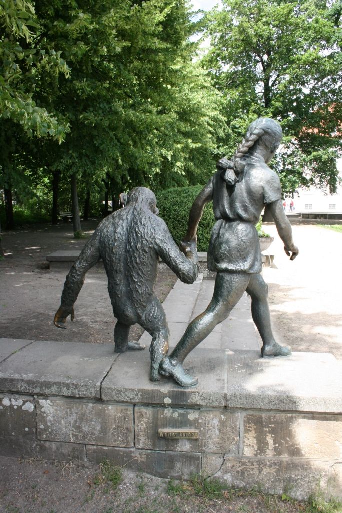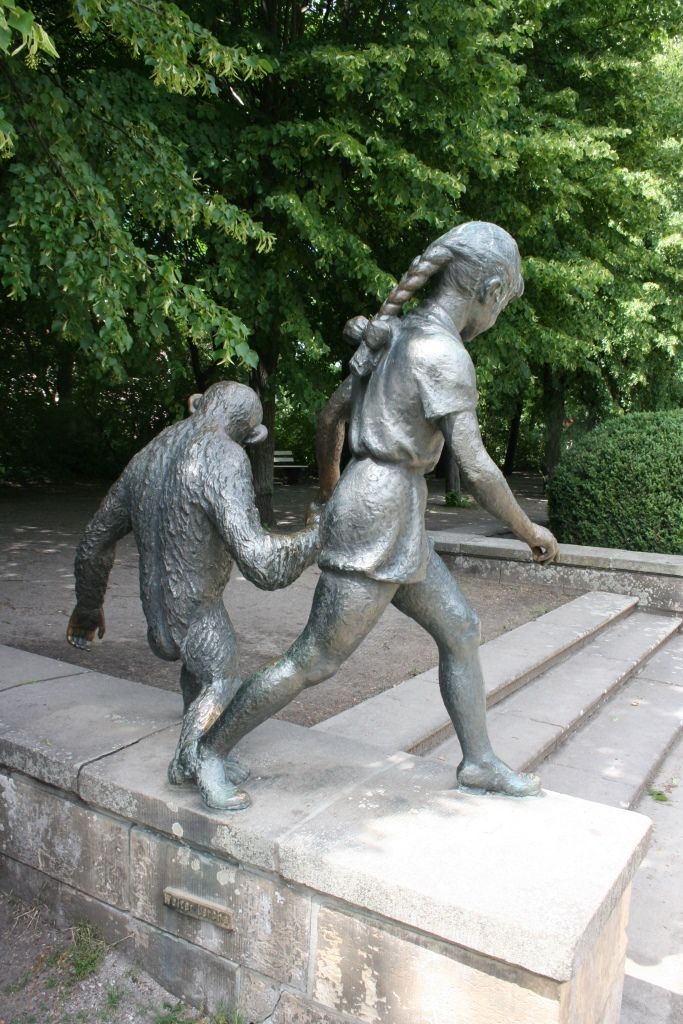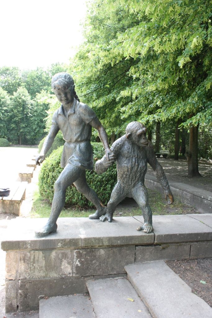 Auf der rechteckigen Sandsteinplatte, die die Treppenwange deckt, ist die Zweiergruppe eines Mädchens in gegürteter, kurzer Sommerbekleidung und einem von ihr an der linken Hand geführten, sich umwendenden Schimpansen montiert. Der Affe steht auf charakteristisch krummen, weit auseinander gestellten Beinen. Beide scheinen von einem imaginären Ereignis, dem sie sich zuwenden, überrascht worden zu sein, ohne ihr Vorwärtsschreiten zu unterbrechen (Jörg Kuhn).