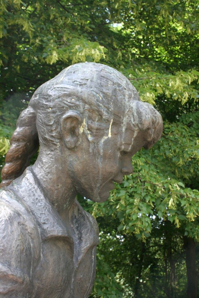 "Aus gleicher Künstlerhand (wie die Figuren von Adam und Eva) stammen die vier Gruppen, die jeweils ein Kind im Kontakt mit einem Tier zeigen, die von 1965-1968 ihre standorte im Südparterre des Schlosses in folgender Reihenfolge - jedes Jahr eine - erhielten: Junge mit Widder, Mädchen mit Schimpansen (das unzählige Besucher zu neckischen Fotoaufnahmen verleitet), Teenager mit Pelikan, Knabe auf Esel. Es werden Kinder in verschiedenen Lebensaltern dargestellt" (Heinrich Dathe, 1980, S. 11-12).