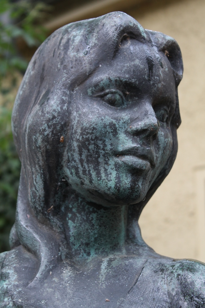 Bei der Freiplastik mit dem Titel „Mädchen mit Taube“ handelt es sich um eine aus Bronze hergestellte, und auf einem rechteckigen Kalksteinsockel aufgestellte, unterlebensgroße Vollplastik einer stehenden weiblichen Ganzfigur. Die Plastik ist vor der Fassade eines flachen Gebäudes, welches als „Keramik Kreativ Werkstatt“ ausgeschildert ist, positioniert.