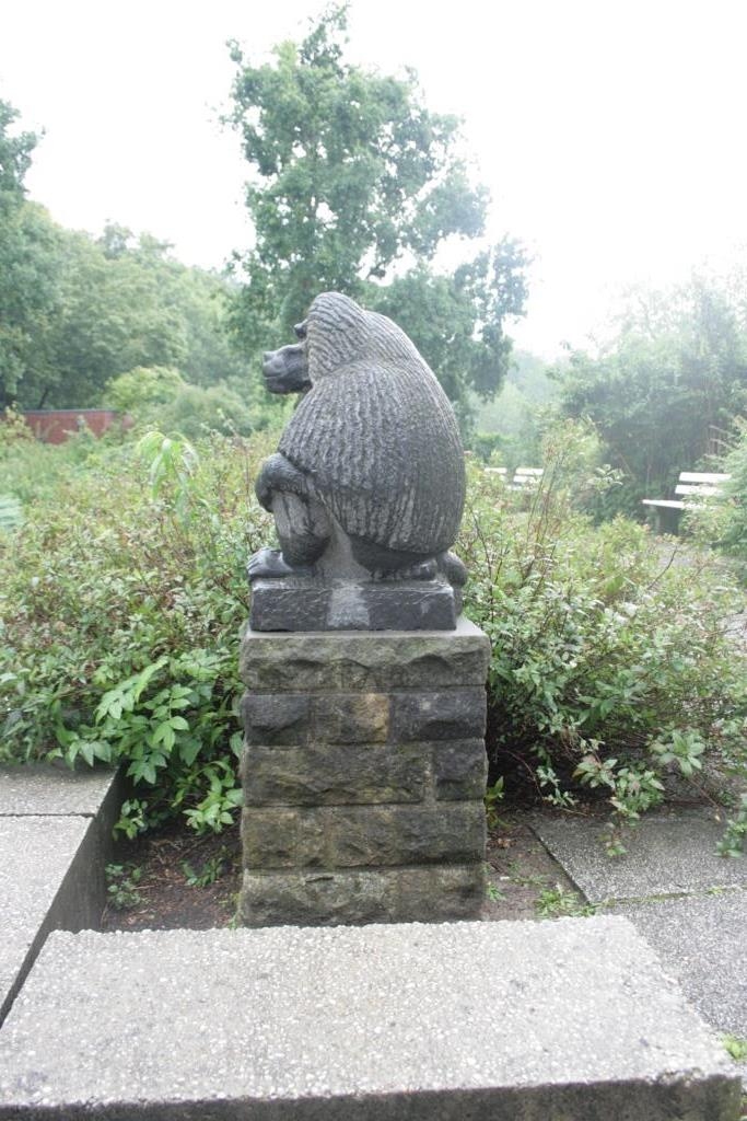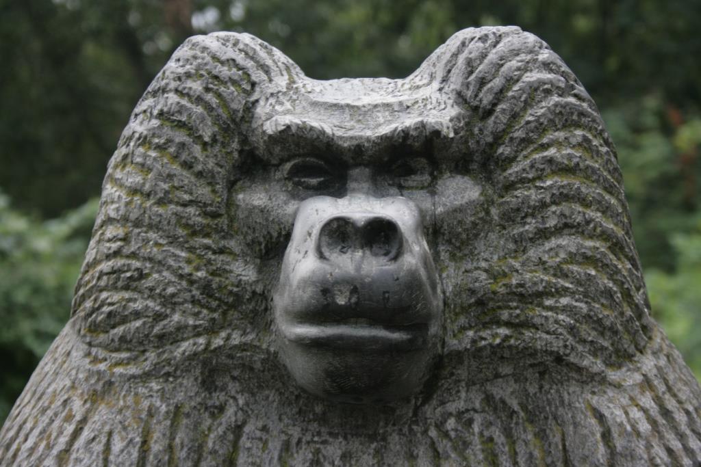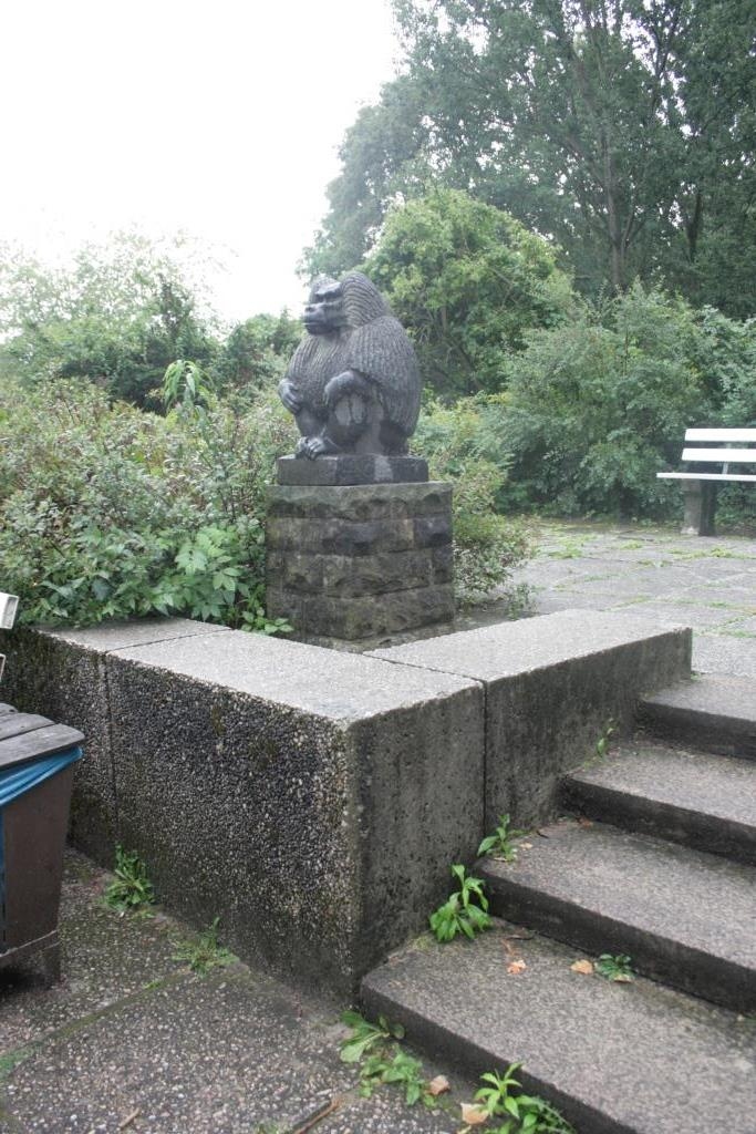 Dargestellt ist ein sitzendes Tier, ein männlicher Mantelpavian. Der Schwanz überragt die sonst rechteckige Plinthe und ruht auf einem gerundeten Element auf. Die blockhafte Figur steht auf einem rechteckigen Kunststeinsockel im Zusammenhang mit einer Sitzterrasse (Jörg Kuhn).