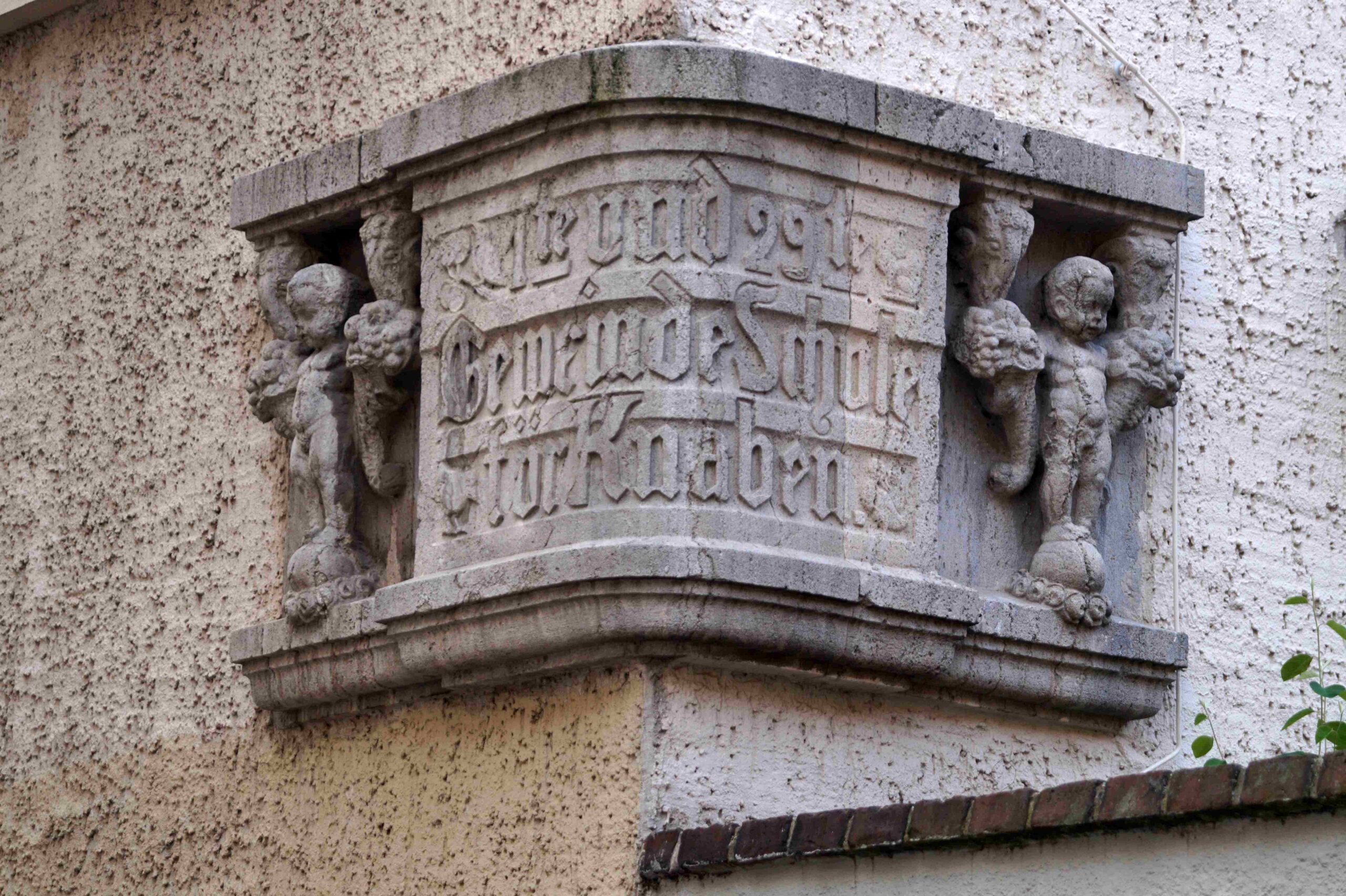 An der rechten Gebäudeecke ein weiteres um die Ecke geführtes Relief mit der Darstellung von zwei Putten. Zwischen Ihnen die ursprüngliche Benennung dieses Gebäudeteils als „1te und 29te Gemeinde-Schule für Knaben“ (Nicola Vösgen).