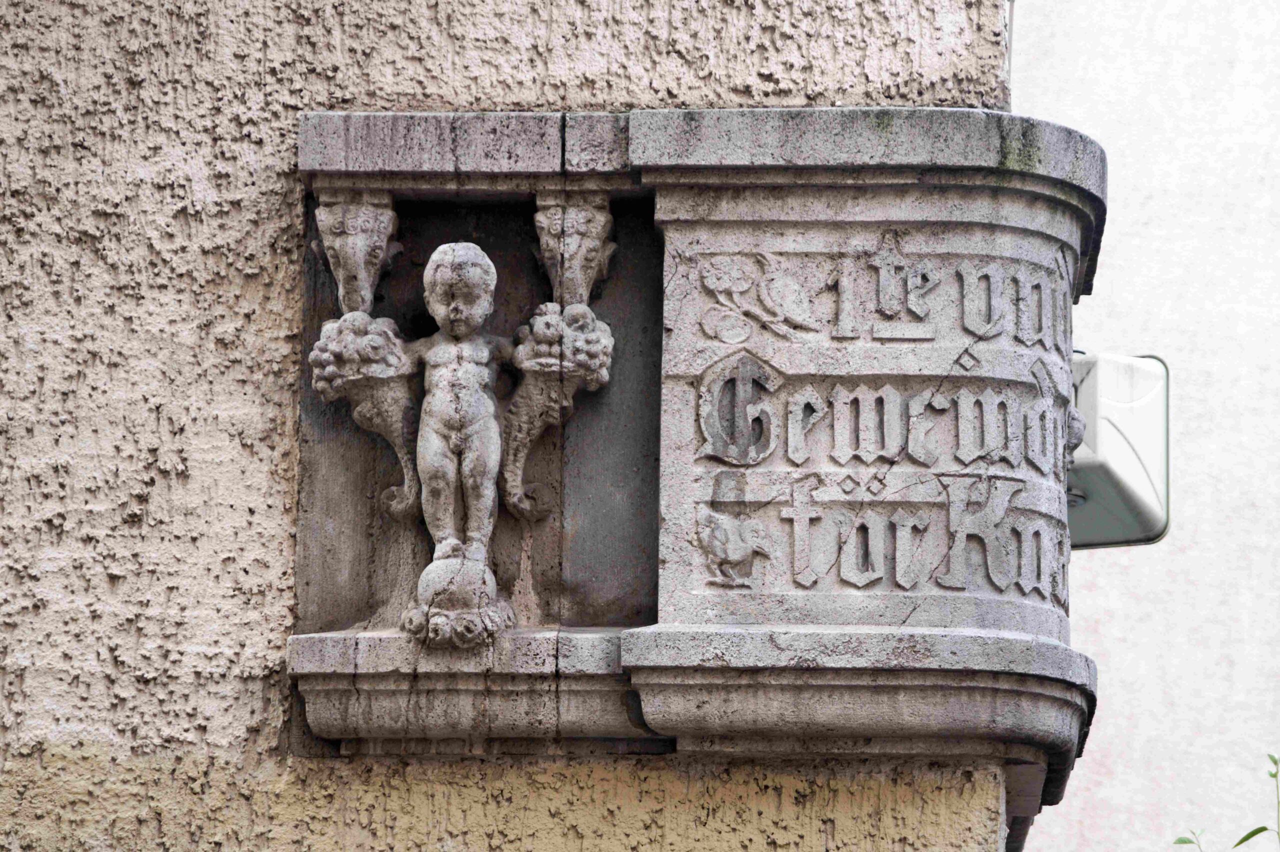 An der rechten Gebäudeecke ein weiteres um die Ecke geführtes Relief mit der Darstellung von zwei Putten. Zwischen Ihnen die ursprüngliche Benennung dieses Gebäudeteils als „1te und 29te Gemeinde-Schule für Knaben“ (Nicola Vösgen).