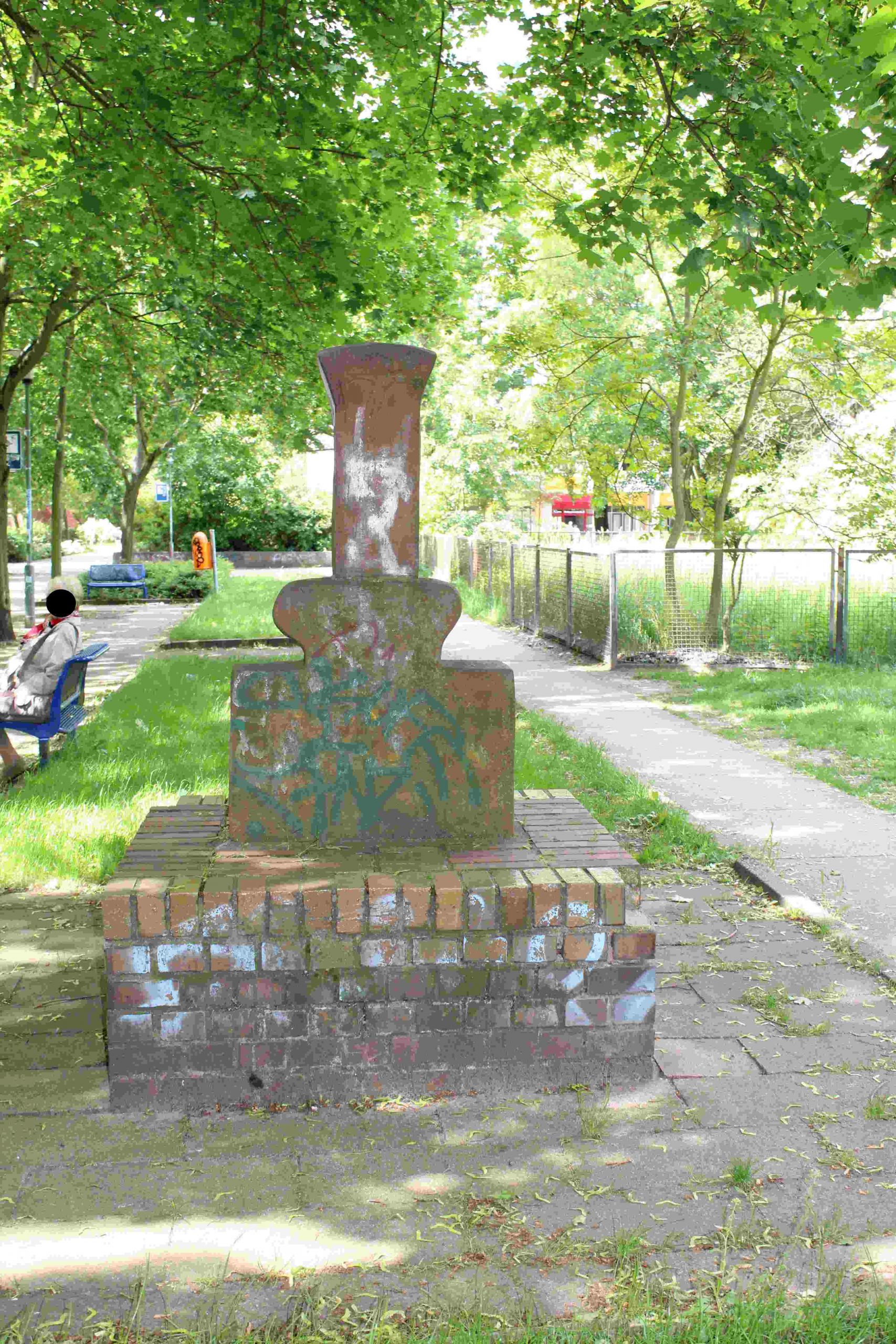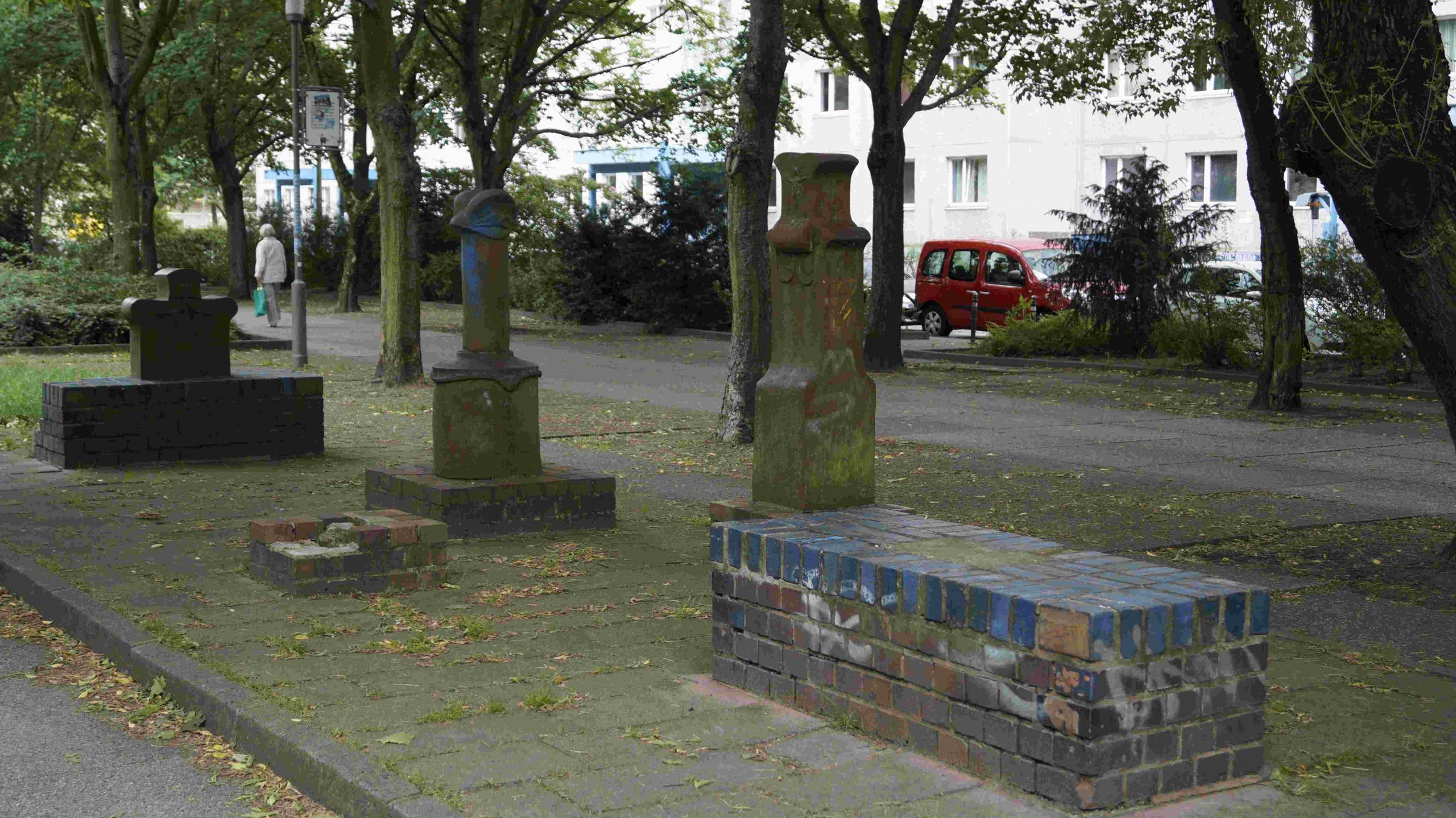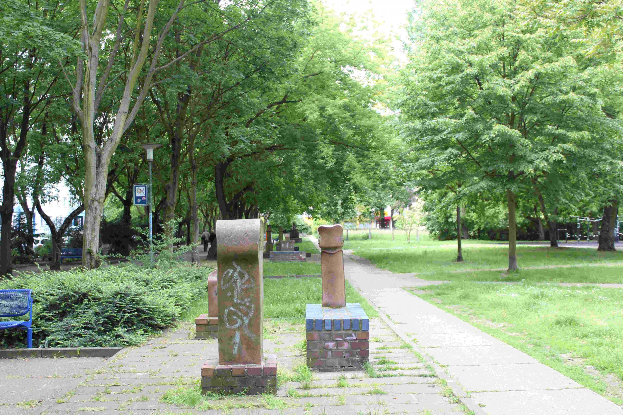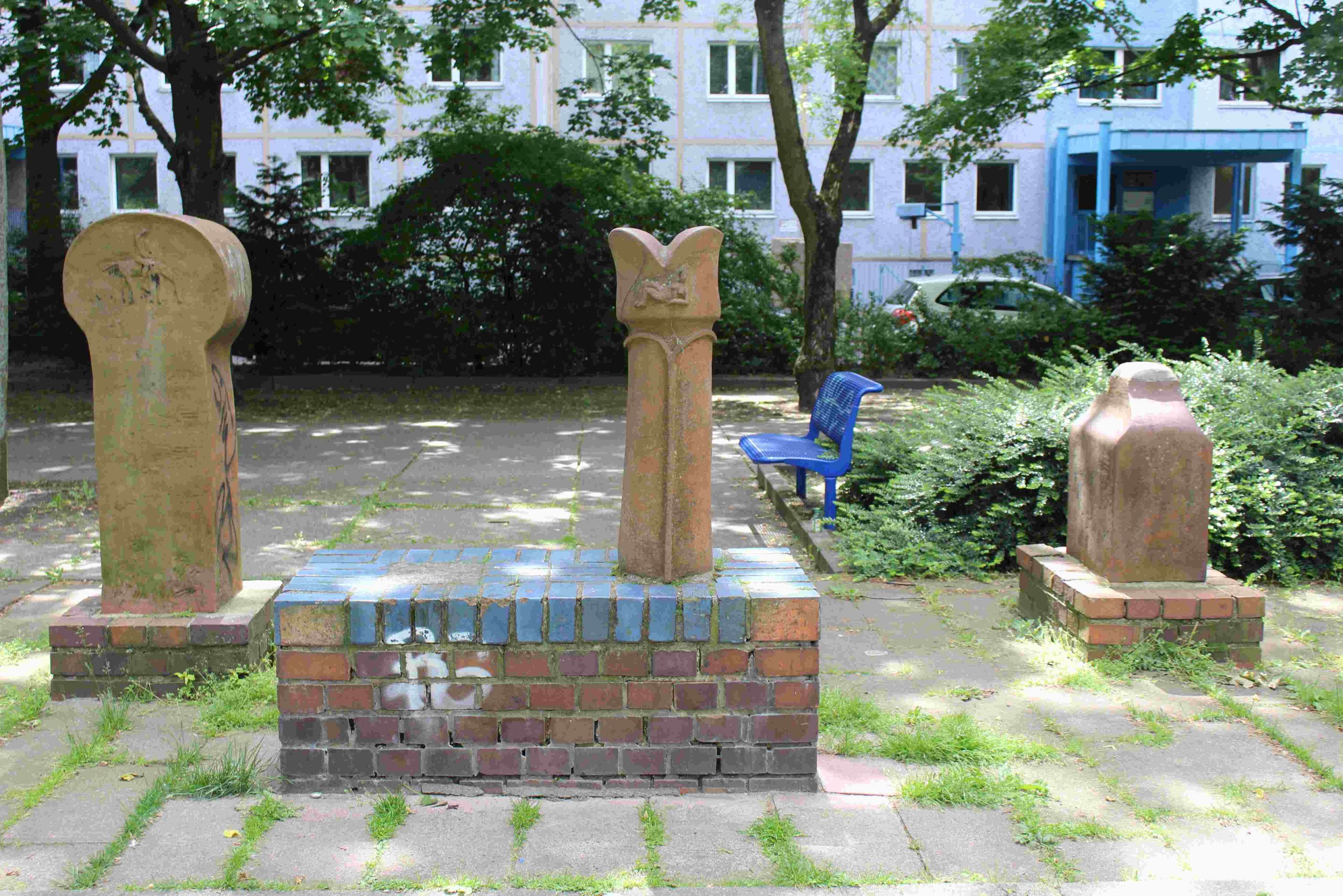Das Objekt-Ensemble besteht aus rotem Klinker, der zum Teil grün und blau glasiert wurde. Das Objekt-Ensemble besteht aus drei Objektgruppen, welche wenige Meter voneinander getrennt positioniert sind. Die erste Objektgruppe gesehen von der Treskowallee, besteht aus drei Skulpturen, welche jeweils auf einem Sockel stehen. Ihre großen Formen sind abstrakt und zwei von ihnen zeigen kleine Menschen- und Pferdereliefs. Die zweite Objektgruppe bestand ursprünglich aus fünf Skulpturen, zwei von ihnen sind jedoch nicht mehr vorhanden. Die Sockel jedoch, wenn auch beschädigt, sind noch vorhanden. Auch diese Skulpturen bestehen aus organischen abstrakten Formen. Der dritte Teil des Ensembles besteht aus einer organischen abstrakten Figur. Sie ist mit 1,88 Metern, inklusive Sockel die Größte. Die Form zeigt an ihren beiden Hauptansichten (Vor-und Rückansicht) je eine kleine Relieffigur. In jeder Objektgruppe gibt es mindestens eine Figur, welche die Signatur von Christiane Wartenberg, inklusive Datierung, trägt (Frauke B. I. Bialas).