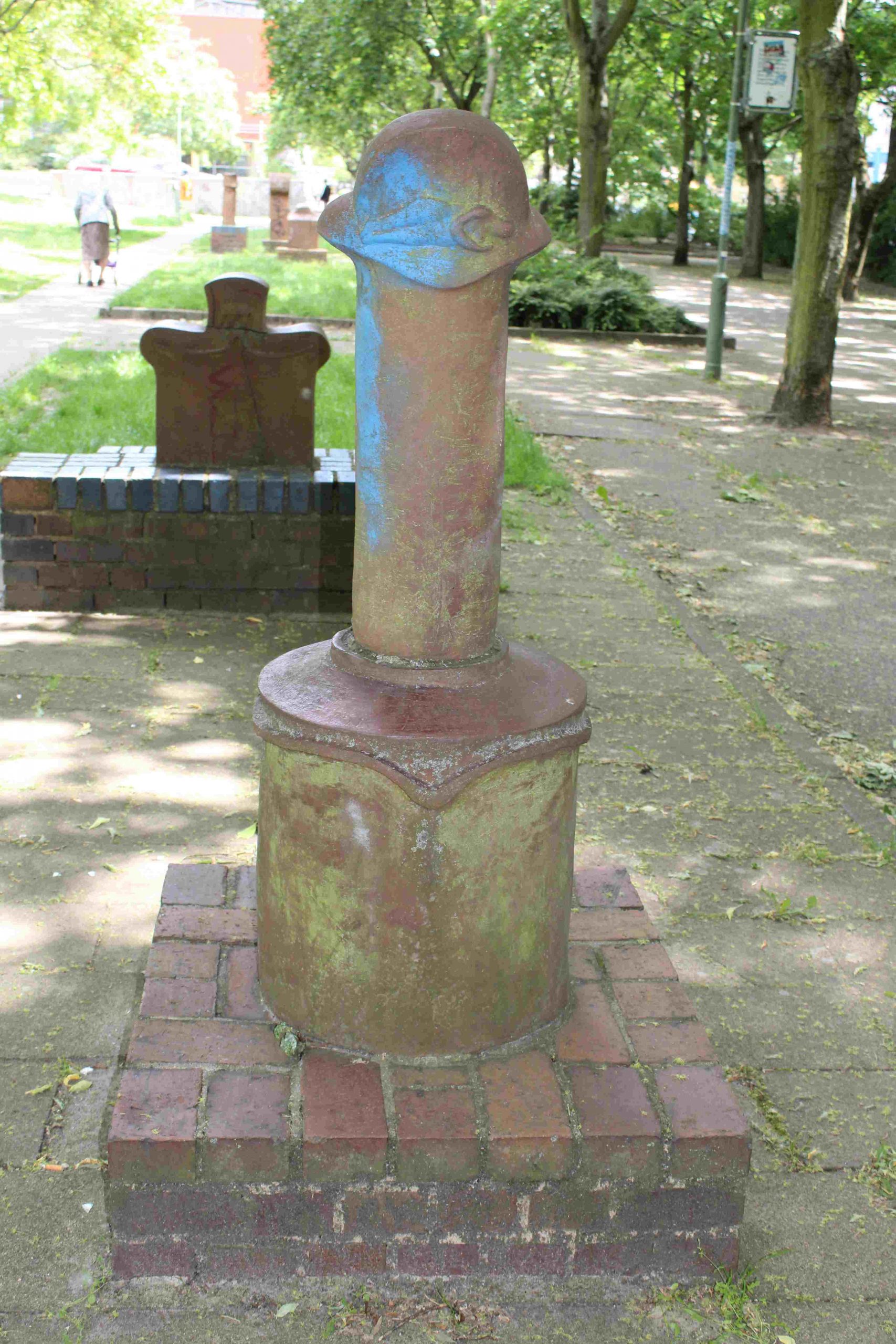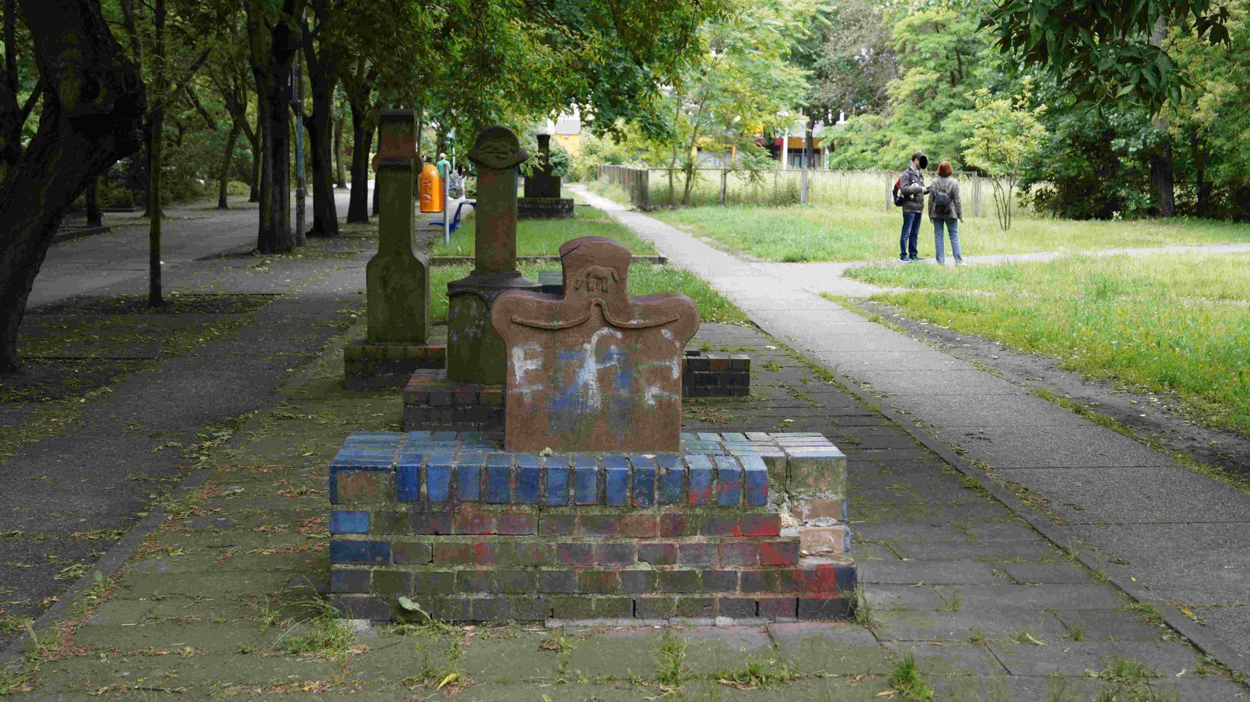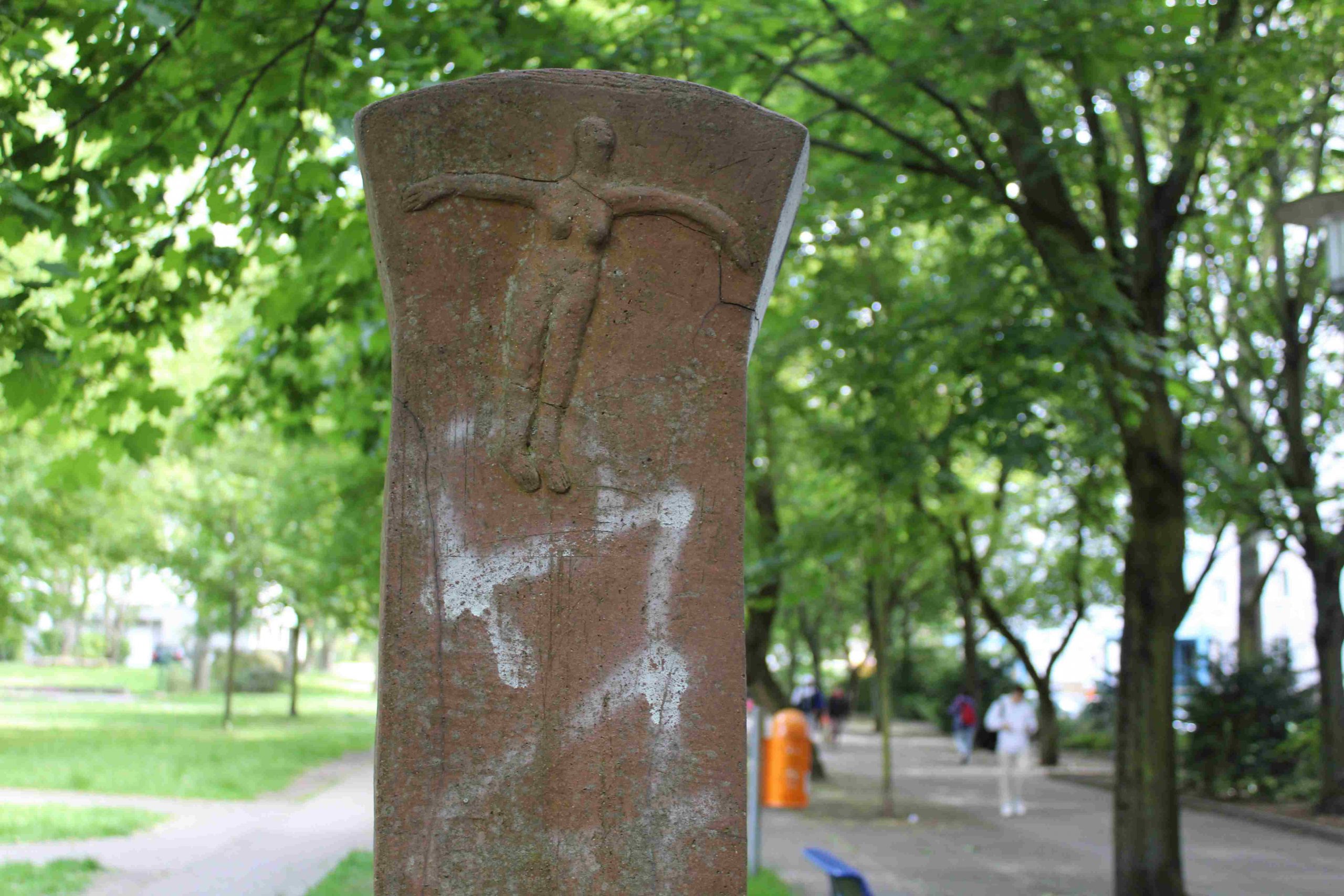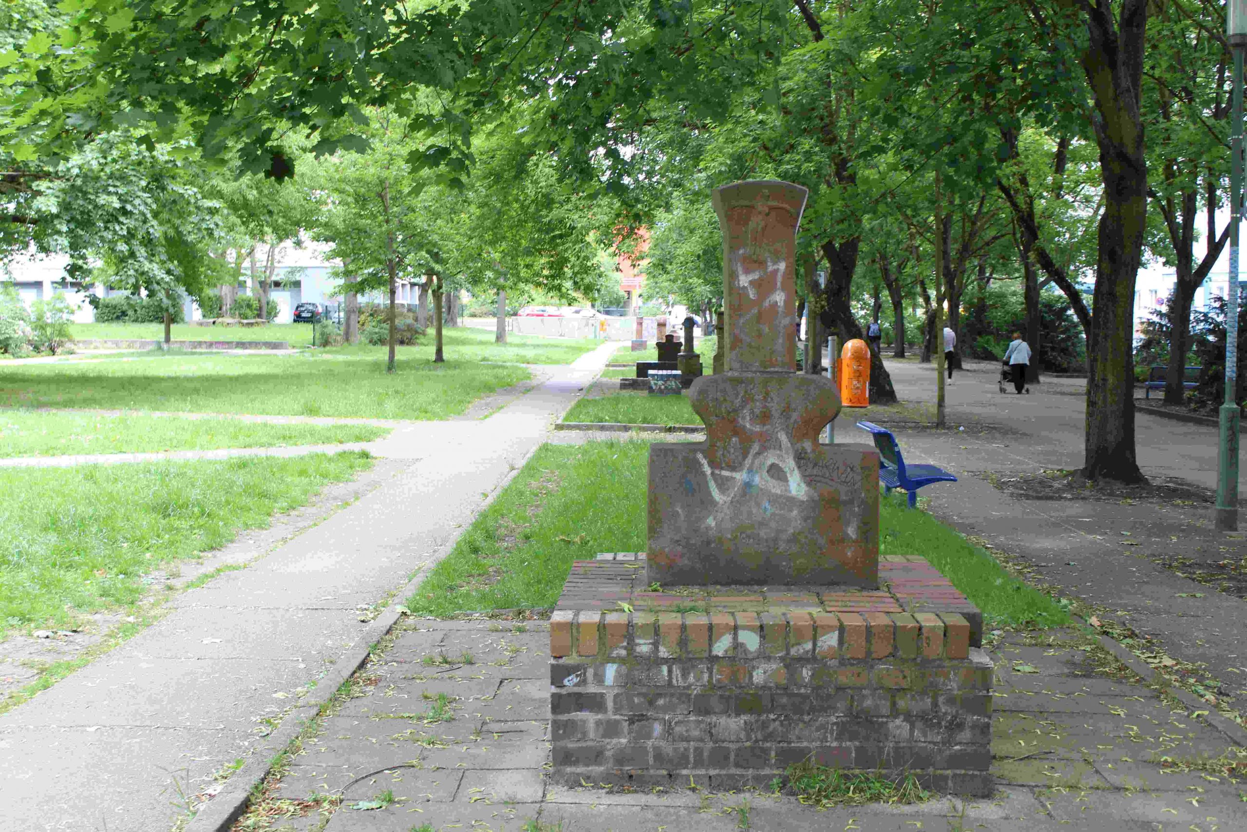 Das Objekt-Ensemble besteht aus rotem Klinker, der zum Teil grün und blau glasiert wurde. Das Objekt-Ensemble besteht aus drei Objektgruppen, welche wenige Meter voneinander getrennt positioniert sind. Die erste Objektgruppe gesehen von der Treskowallee, besteht aus drei Skulpturen, welche jeweils auf einem Sockel stehen. Ihre großen Formen sind abstrakt und zwei von ihnen zeigen kleine Menschen- und Pferdereliefs. Die zweite Objektgruppe bestand ursprünglich aus fünf Skulpturen, zwei von ihnen sind jedoch nicht mehr vorhanden. Die Sockel jedoch, wenn auch beschädigt, sind noch vorhanden. Auch diese Skulpturen bestehen aus organischen abstrakten Formen. Der dritte Teil des Ensembles besteht aus einer organischen abstrakten Figur. Sie ist mit 1,88 Metern, inklusive Sockel die Größte. Die Form zeigt an ihren beiden Hauptansichten (Vor-und Rückansicht) je eine kleine Relieffigur. In jeder Objektgruppe gibt es mindestens eine Figur, welche die Signatur von Christiane Wartenberg, inklusive Datierung, trägt (Frauke B. I. Bialas).