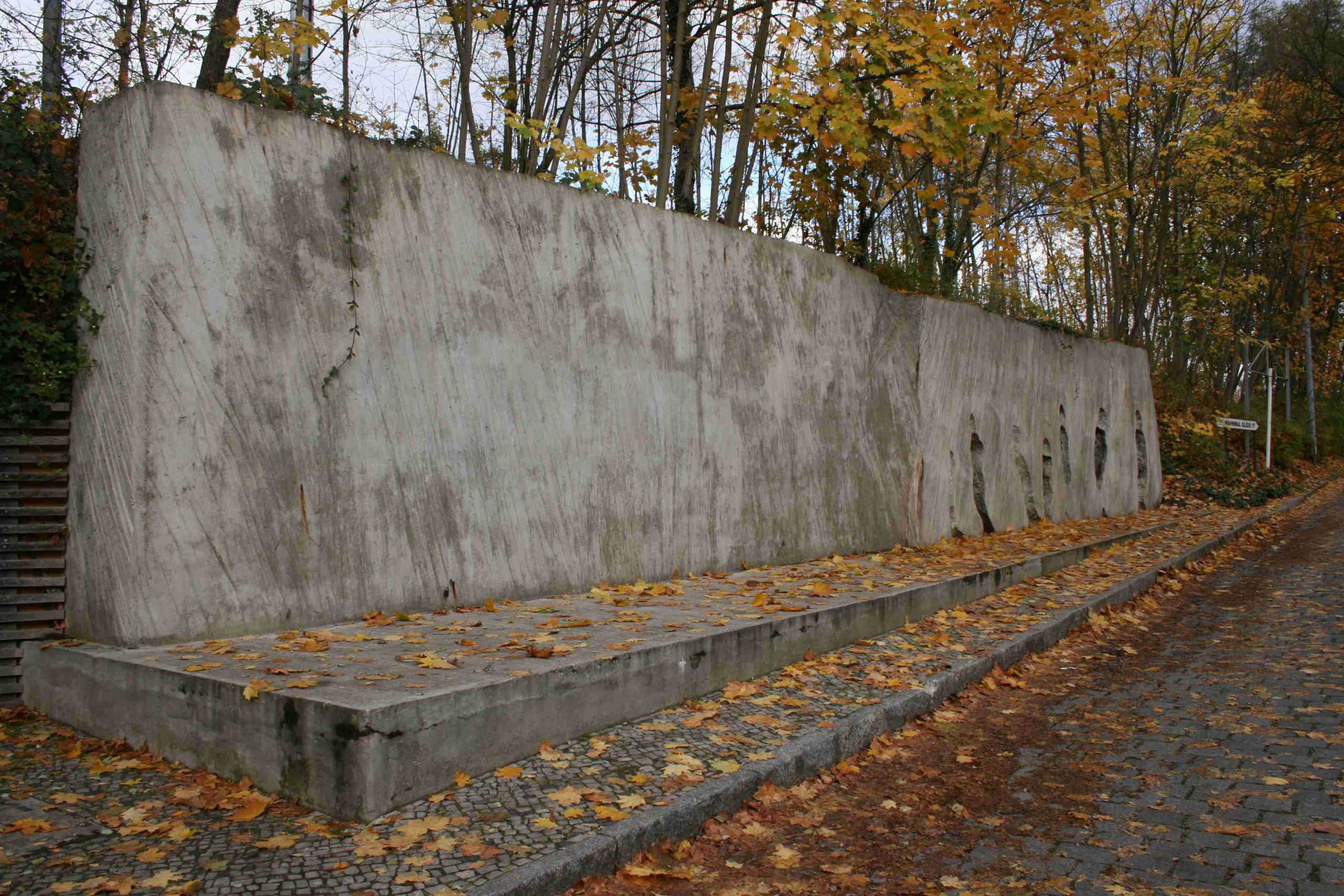 Mahnmal des Berliner Senats, Enthüllt am 18.10.1991. Der S-Bahnhof Grunewald (1899 nach Entwurf von Karl Cornelius errichtet) entstand im Bereich eines seit dem 19. Jahrhundert bestehenden Güterbahnhofs an der Strecke Berlin-Wetzlar. Während des Zweiten Weltkrieges, konkret zwischen dem 18. Oktober 1941 bis Februar 1945, wurden vom Güterbahnhof Grunewald Berliner Juden und so genannte „Nichtarier“ an die Todesstätten im Osten deportiert. Eine erste Gedenktafel von 1953 wurde zu einem unbekannten Zeitpunkt entfernt, eine 1973 angebrachte Gedenktafel mehrfach gestohlen. 1987 lobte der Senator für Bau- und Wohnungswesen (heute: Senator für Stadtentwicklung und Umweltschutz) einen Wettbewerb zur Errichtung einer Gedenkstätte am Güterbahnhof Grunewald aus. 149 Beiträge wurden eingereicht. Der in Berlin lebende polnische Künstler Káról Broniatowski erhielt 1988 einstimmig den 1. Preis. Kosten der Realisierung: ca. 770.000 DM (aus dem Fonds „Kunst im Stadtraum“). Am Straßenseitigen Fuße des Bahndamms wurde ein Betonfundament errichtet, das nicht nur den Höhenunterschied der hier bereits ansteigenden Straße ausgleicht und der eigentlichen Skulptur als Basis dient, sondern auch in der Anmutung eines Bahnsteigs Teil der Inszenierung geworden ist. Das eigentliche Kunstwerk, eine in der Oberfläche stark strukturierte Betonwand mit den abstrakten Umrissen von Menschen, wurde im Atelier des Künstlers fertig gestellt und in zwei Teilen von je 26 Tonnen zum Aufstellungsort gebracht und hier vor dem Bahndamm aufgestellt. In den Bahndamm vertieft wurde eine Nische links vor dem Denkmal (im Jahr 2000 von der Deutschen Bahn AG ohne Abstimmung mit dem Künstler und der Senatsbauverwaltung eine Betonstützmauer errichtet, die den Eindruck des Denkmals stark beeinträchtigt hat. Um die Stützmauer zu kaschieren wurde sie mit einer berankungsfähigen Holzverkleidung verblendet). Hier wurde eine Gedenkstele aufgestellt, deren Bronzetafel einen prägnanten Text enthält, der auch dem Ortsunkundigen das Denkmal und den Hintergrund seiner Entstehung erläutert. Der eigentliche Ort der Deportation, das Gleis 17, war zum Zeitpunkt des Wettbewerbes noch nicht in das Projekt einziehbar, da das Grundstück unter Verwaltung der Reichsbahn / DDR stand. Dies ist 1998 mit der Umsetzung des Mahn- und Gedenkmals „Gleis 17“ geschehen. Obgleich beide Gedenkmale inhaltlich zusammen gehören, stellen sie doch zwei grundsätzlich unterschiedliche Werke dar, da das eine stärker Skulptur ist, das andere eine Objektkollage zwischen historischem Ort des zu Erinnernden und seiner überfassenden Stilisierung. Im Übrigen hat die Deutsche Bahn AG ohne Absprache mit dem Künstler ein zum authentischen Ort und damit zur Gedenkstätte gehörendes Schild mit der Aufschrift „Deutsche Reichsbahn/Güterbahnhof Berlin-Grunewald“ entfernen lassen. Das Schild, das bereits 1941 vorhanden war, gilt nun als verschollen (Jörg Kuhn, Susanne Kähler).