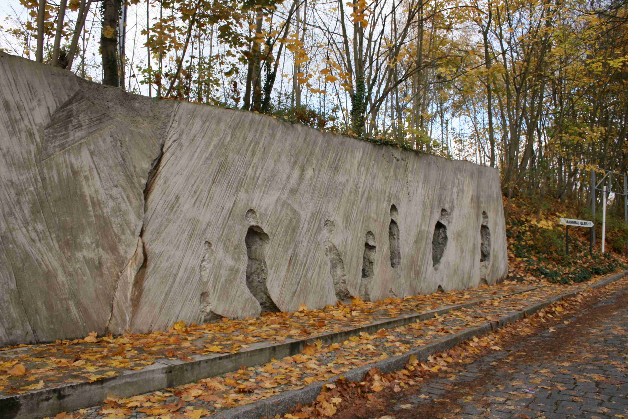 Mahnmal des Berliner Senats, Enthüllt am 18.10.1991. Der S-Bahnhof Grunewald (1899 nach Entwurf von Karl Cornelius errichtet) entstand im Bereich eines seit dem 19. Jahrhundert bestehenden Güterbahnhofs an der Strecke Berlin-Wetzlar. Während des Zweiten Weltkrieges, konkret zwischen dem 18. Oktober 1941 bis Februar 1945, wurden vom Güterbahnhof Grunewald Berliner Juden und so genannte „Nichtarier“ an die Todesstätten im Osten deportiert. Eine erste Gedenktafel von 1953 wurde zu einem unbekannten Zeitpunkt entfernt, eine 1973 angebrachte Gedenktafel mehrfach gestohlen. 1987 lobte der Senator für Bau- und Wohnungswesen (heute: Senator für Stadtentwicklung und Umweltschutz) einen Wettbewerb zur Errichtung einer Gedenkstätte am Güterbahnhof Grunewald aus. 149 Beiträge wurden eingereicht. Der in Berlin lebende polnische Künstler Káról Broniatowski erhielt 1988 einstimmig den 1. Preis. Kosten der Realisierung: ca. 770.000 DM (aus dem Fonds „Kunst im Stadtraum“). Am Straßenseitigen Fuße des Bahndamms wurde ein Betonfundament errichtet, das nicht nur den Höhenunterschied der hier bereits ansteigenden Straße ausgleicht und der eigentlichen Skulptur als Basis dient, sondern auch in der Anmutung eines Bahnsteigs Teil der Inszenierung geworden ist. Das eigentliche Kunstwerk, eine in der Oberfläche stark strukturierte Betonwand mit den abstrakten Umrissen von Menschen, wurde im Atelier des Künstlers fertig gestellt und in zwei Teilen von je 26 Tonnen zum Aufstellungsort gebracht und hier vor dem Bahndamm aufgestellt. In den Bahndamm vertieft wurde eine Nische links vor dem Denkmal (im Jahr 2000 von der Deutschen Bahn AG ohne Abstimmung mit dem Künstler und der Senatsbauverwaltung eine Betonstützmauer errichtet, die den Eindruck des Denkmals stark beeinträchtigt hat. Um die Stützmauer zu kaschieren wurde sie mit einer berankungsfähigen Holzverkleidung verblendet). Hier wurde eine Gedenkstele aufgestellt, deren Bronzetafel einen prägnanten Text enthält, der auch dem Ortsunkundigen das Denkmal und den Hintergrund seiner Entstehung erläutert. Der eigentliche Ort der Deportation, das Gleis 17, war zum Zeitpunkt des Wettbewerbes noch nicht in das Projekt einziehbar, da das Grundstück unter Verwaltung der Reichsbahn / DDR stand. Dies ist 1998 mit der Umsetzung des Mahn- und Gedenkmals „Gleis 17“ geschehen. Obgleich beide Gedenkmale inhaltlich zusammen gehören, stellen sie doch zwei grundsätzlich unterschiedliche Werke dar, da das eine stärker Skulptur ist, das andere eine Objektkollage zwischen historischem Ort des zu Erinnernden und seiner überfassenden Stilisierung. Im Übrigen hat die Deutsche Bahn AG ohne Absprache mit dem Künstler ein zum authentischen Ort und damit zur Gedenkstätte gehörendes Schild mit der Aufschrift „Deutsche Reichsbahn/Güterbahnhof Berlin-Grunewald“ entfernen lassen. Das Schild, das bereits 1941 vorhanden war, gilt nun als verschollen (Jörg Kuhn, Susanne Kähler).