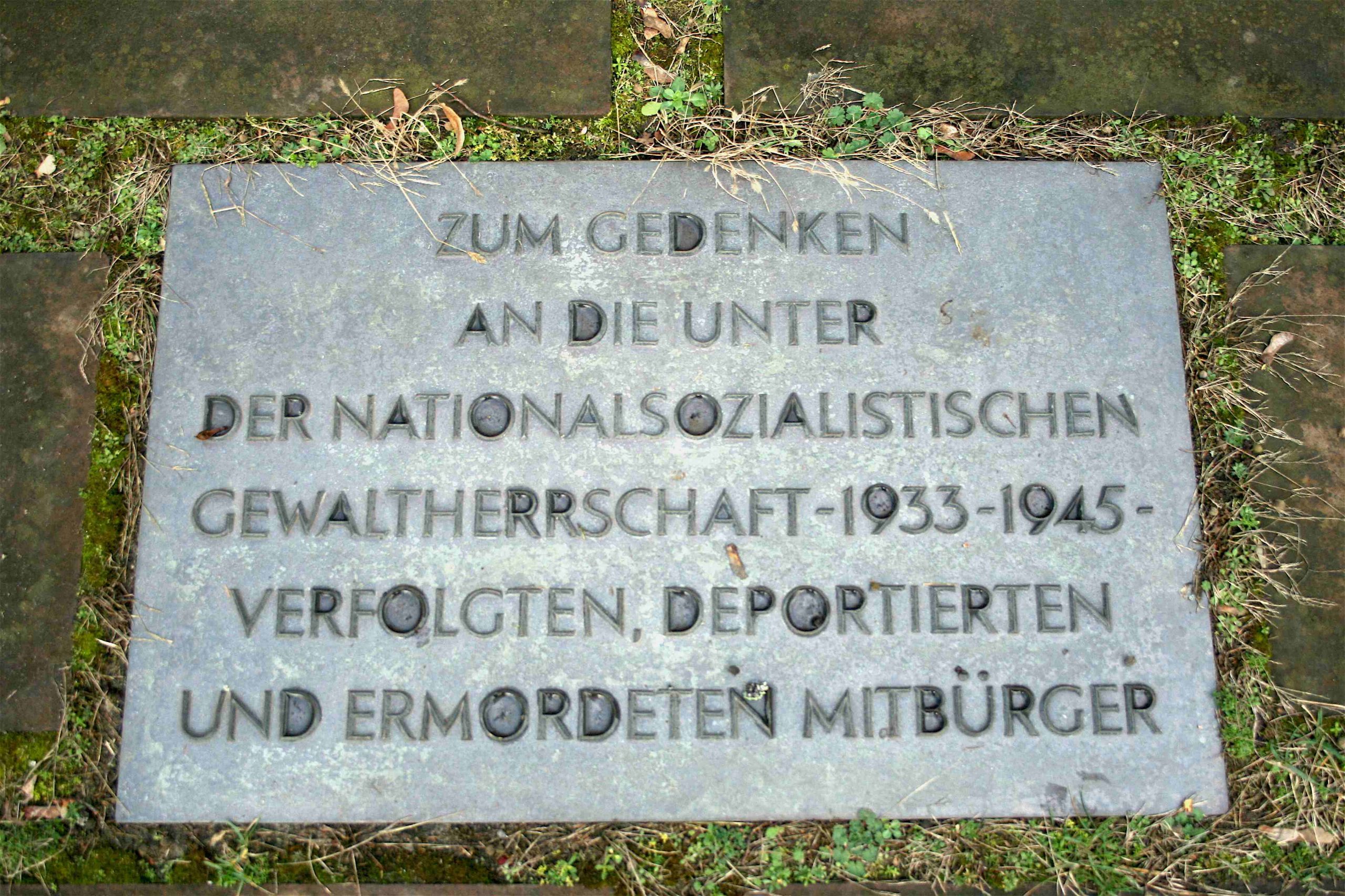 »ZUM GEDENKEN / AN DIE UNTER / DER NATIONALSOZIALISTISCHEN / GEWALTHERRSCHAFT – 1933-1945 – / VERFOLGTEN, DEPORTIERTEN / UND ERMORDETEN MITBÜRGER«