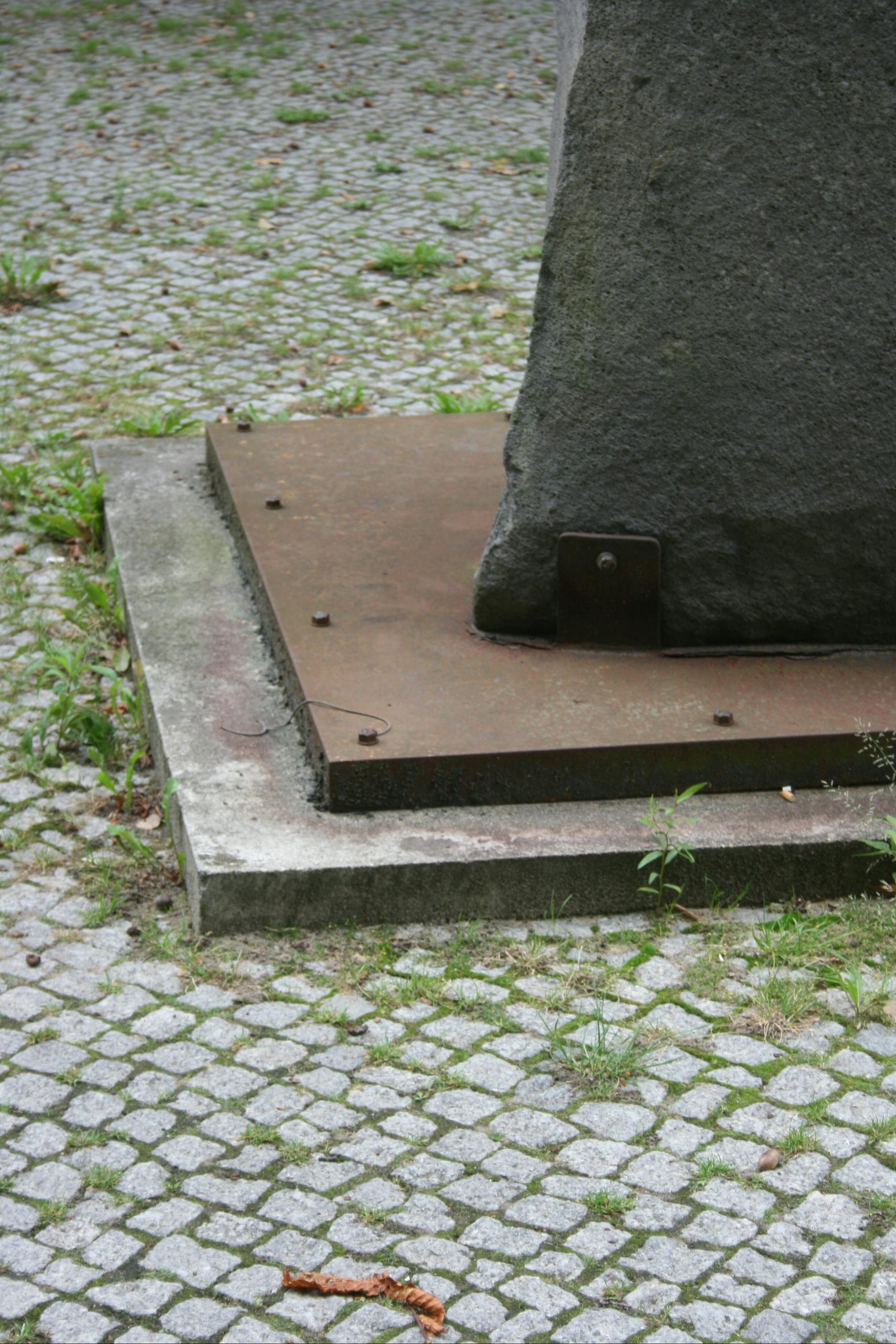 An der Wismarer Straße, neben der Brücke über den Teltowkanal, weist heute ein Denkmal darauf hin, dass sich an dieser Stelle in den Jahren 1942 bis 1945 Konzentrations-Außenlager befunden hat. Das Denkmal ist in die Bürgersteiganlage integriert. Eine quadratische Betonplatte bildet die Grundfläche. Darauf aufgeschraubt wurde Gussstahlplatte mit Montierungslaschen zur Fixierung eines irregulären behauenen Basaltstelensteins mit im oberen Teil stark stilisiert und dunkel hinterlegten Ritzungen von Kopfprofilen. Dargestellt wird eine eng aneinander gepresste Gruppe von Menschen. Eine um die Stele gelegte Eisengliederkette unterstreicht nachdrücklich den Eindruck, dass die hier angedeutete Menschengruppe gefesselt ist. Vor dem Mahnmal ist in das Granitpflaster eine rechteckige bronzene Tafel mit erhabenen Lettern eingelassen. Die 15-zeilige Inschrift berichtet über das KZ Außenlager Lichterfelde. (Susanne Kähler)