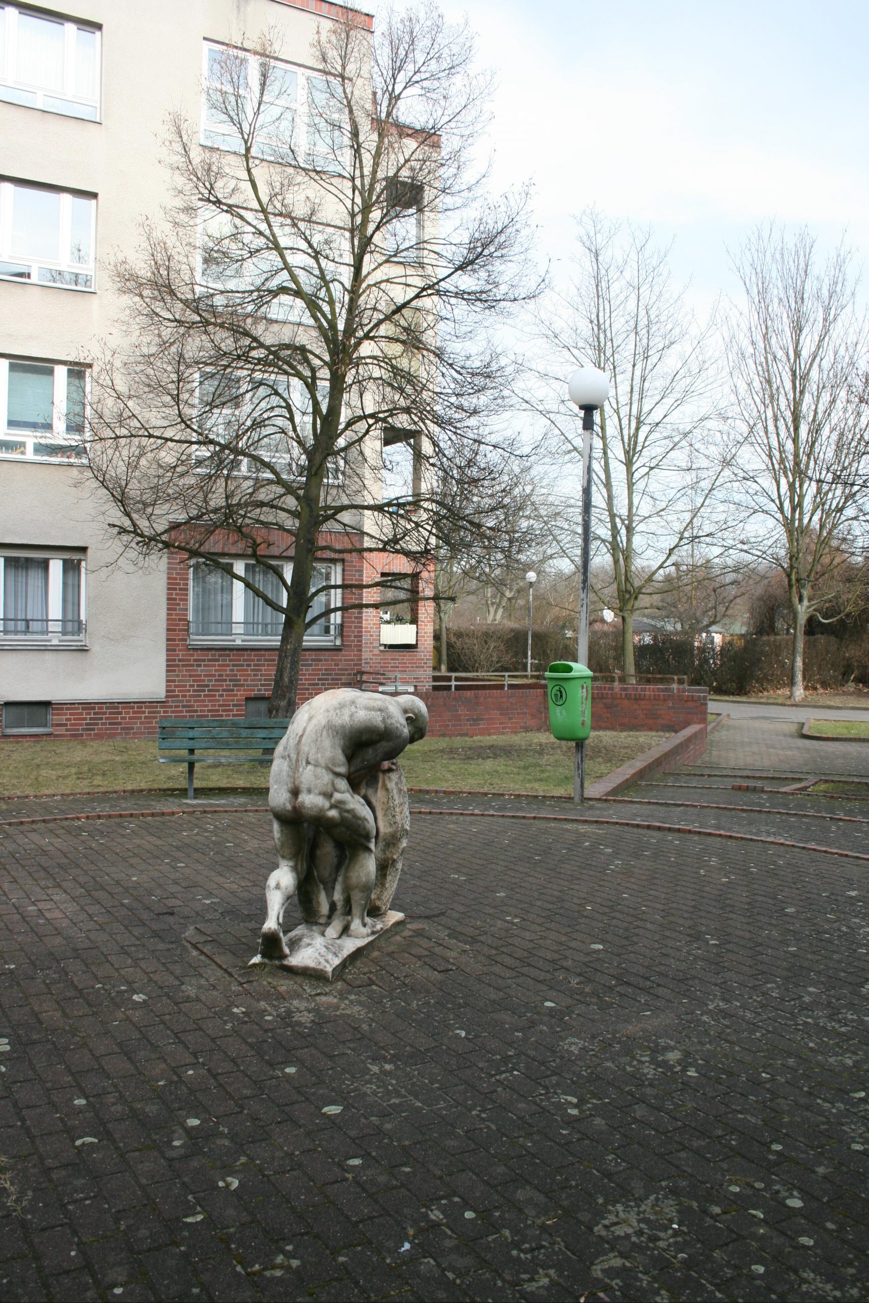 Auf annähernd rechteckiger Plinthe mit Naturrelief steht, sich mit dem linken Fuß abstützend, ein unbekleideter muskulöser Mann, der sich mit beiden Händen an angewinkelten Armen gegen einen mächtigen vor ihm stehenden Felsblock stemmt und ihn zu bewegen trachtet (Jörg Kuhn).