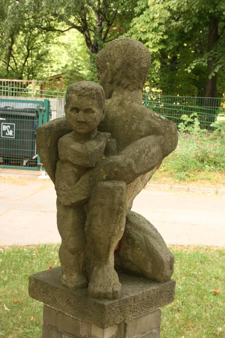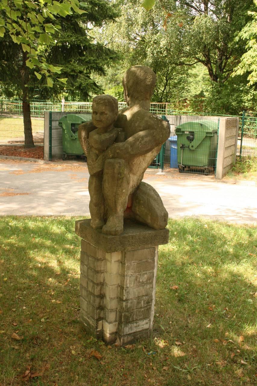 Auf einem rechteckigen, vertikal gestuften Sockel aus weiß geschlämmten Klinkersteinen ruht über schraffiert gestalteter, rechteckiger Plinthe die blockhafte Skulptur eines unbekleideten Mannes und eines ebenso unbekleideten Kindes. Die beiden Figuren sind stark ineinander verschränkt. Der Mann hockt und kniet zu gleichen Teilen, sein Körper ist anatomisch unnatürlich verdreht. Der Mann hält den mit einem vollen Haarschopf bedeckten Kopf nach hinten gewendet. Mit seinen beiden nach hinten gelegten Armen umfängt er das Kind, das sich seinen rechten Arm um den Hals gelegt hat und mit der rechten Hand seine linke Schulter berührt. Um die Gruppe zu erfassen, muss man um die Skulptur herumgehen. Die Formen sind recht grob. Die deutliche erkennbare Form des Steinblocks verleiht der Gruppe etwas beängstigend Bedrängtes und Bedrücktes (Jörg Kuhn, Susanne Kähler).