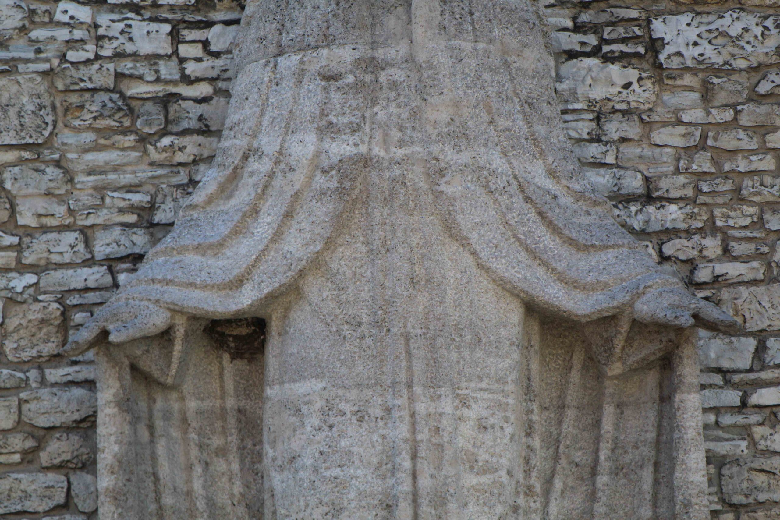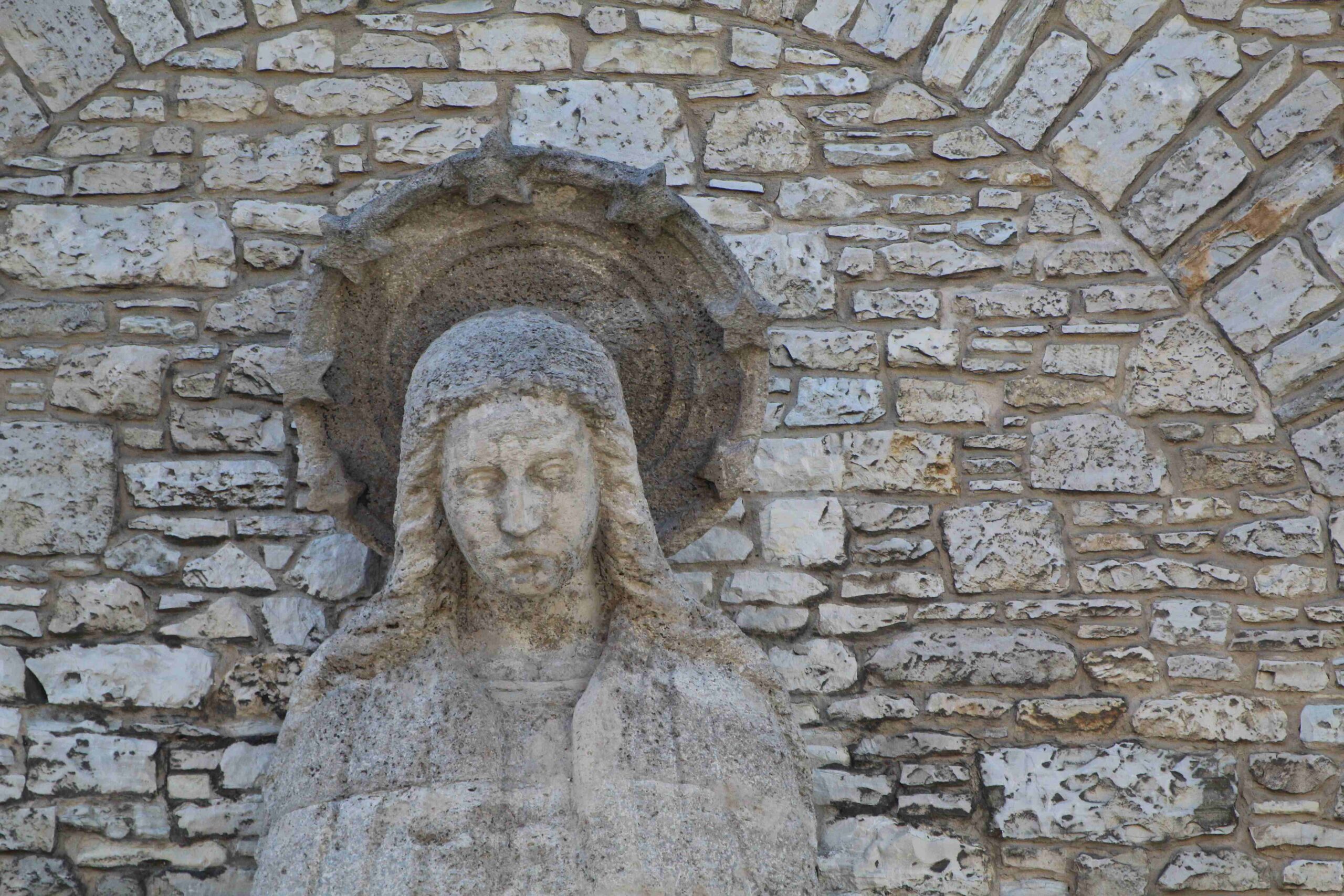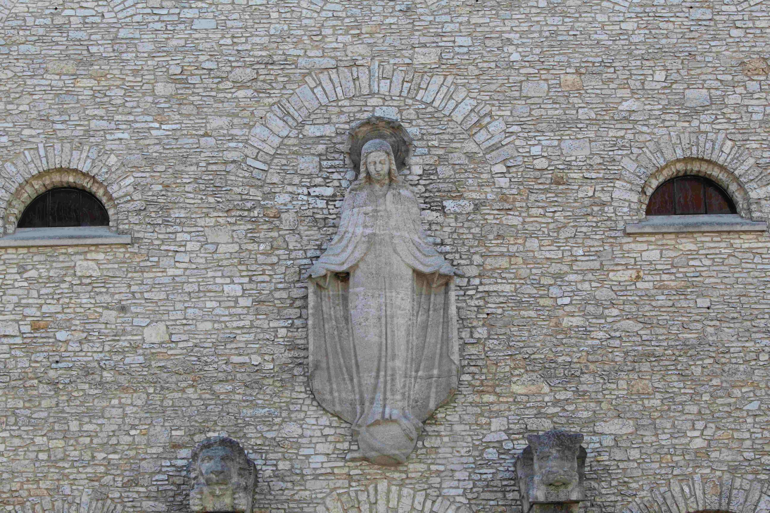 Über dem mittleren Portal des Haupteingangs der St. Marien-Kirche begrüßt eine Marienfigur mit weit ausgebreiteten Armen, auf der von einer Schlange umschlungenen Weltkugel stehend, die Besucher der Kirche (Nicola Vösgen).