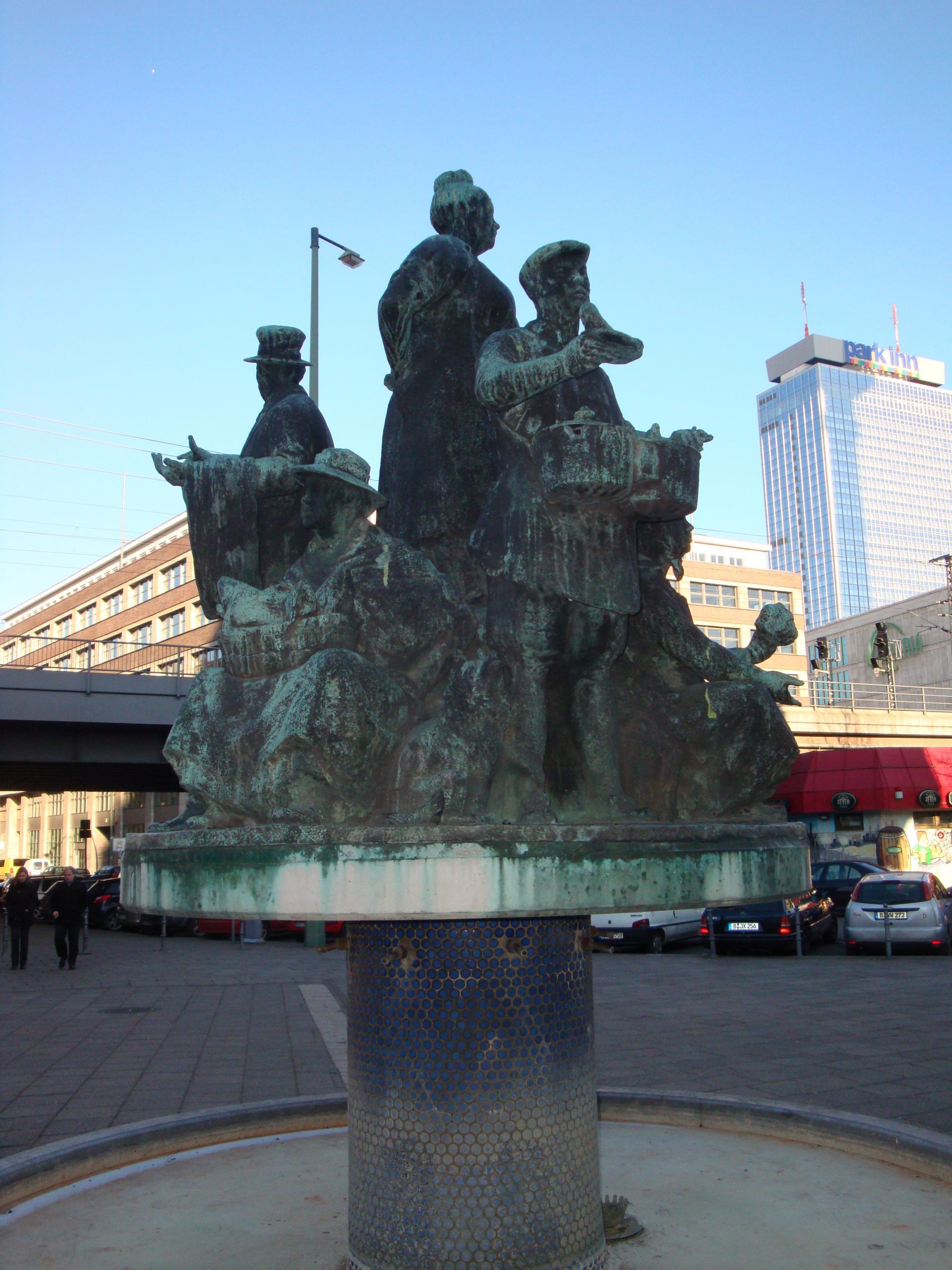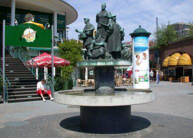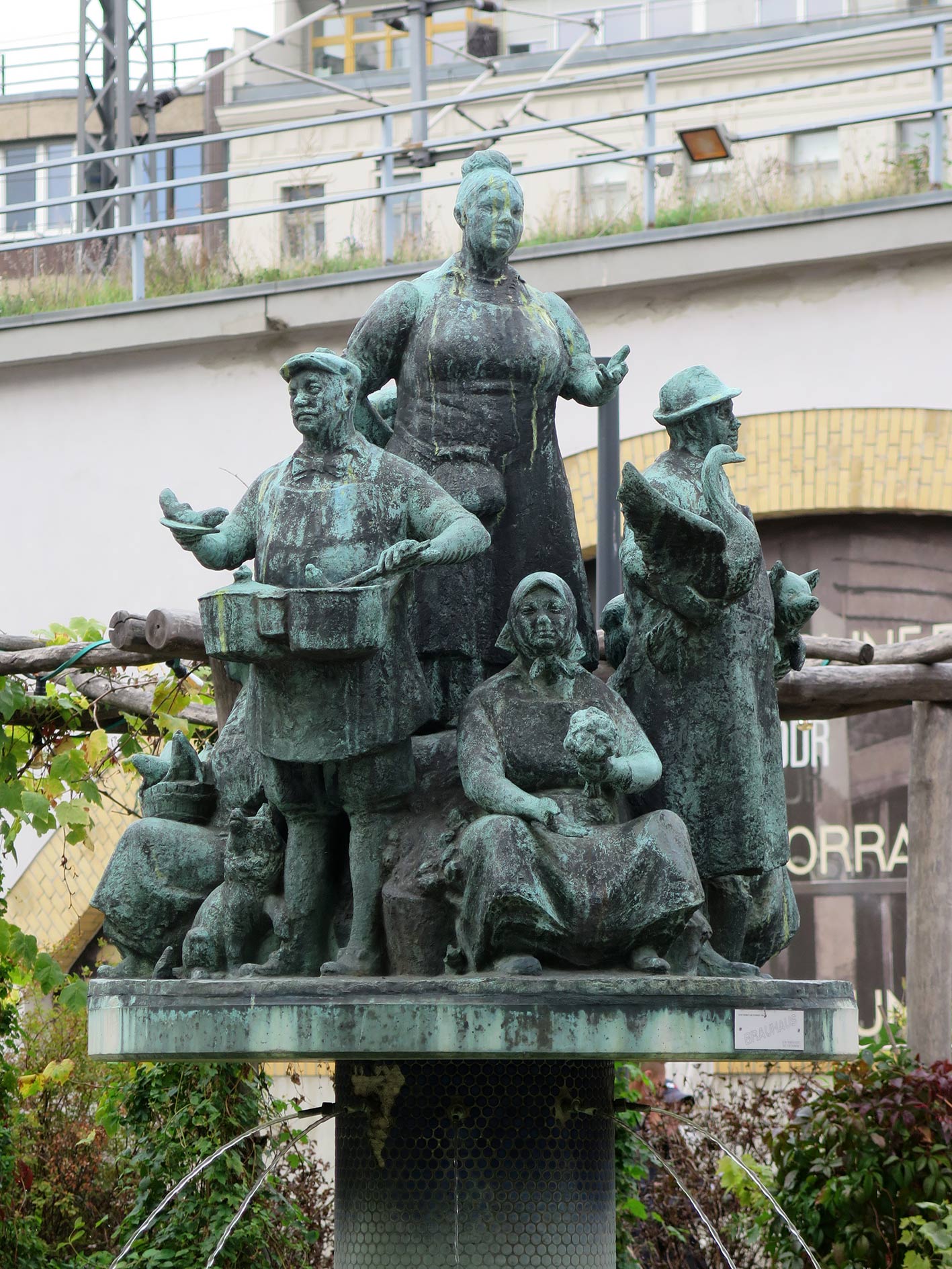 An der alten Markthalle steht auf einem durch dunkle Pflastersteine in kreisrunder Anordnung besonders markiertem Platz ein an historischen Marktbrunnen orientierter Schmuckbrunnen auf rundem Grundriss. Der runde Betongusssockel trägt in bequem mit Händen erreichbarer Höhe eine runde Brunnenschale. Im Zentrum dieser Schale setzt sich, verschlankt, der runde, mit Mosaik verzierte Brunnenstock fort und trägt eine Scheibe aus Kunststein. Sie dient einer vielfigurigen Bronzegruppe als Standplatte. Auf einer gering starken Plinthe stehen hier in kreisförmiger, zur Mitte hin ansteigender, Anordnung so genannte „Berliner Typen“, die charakteristische Anbieter auf einem traditionellen Markt darstellen (Marktschreierin, Blumenfrau, Wurstmaxe, Gemüsefrau, Fischhändlerin, Schneider, Bauer). Sitzfiguren und Standfiguren und auch ein Hund sind zu entdecken. Der Brunnenstock birgt sechs kleine Wasseraustrittröhrchen, aus denen dünne Wasserstrahlen in das große Schalenbecken fließen (Jörg Kuhn).
