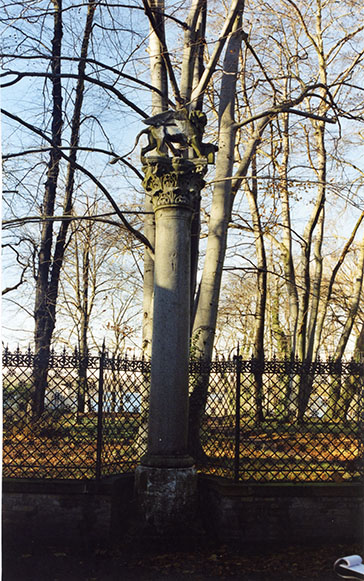 Der ab 1850 nach Plänen von Friedrich Wilhelm IV. (gest. 1861), Friedrich August Stüler (gest. 1865) und Ferdinand von Arnim (gest. 1866) aus den 1844 durch Prinz Carl von Preußen (gest. 1883) angekauften Spolien des ehemals berühmten venezianischen Kartäuserklosters S. Andrea della Certosa (des wohl nach 1805 weitgehend abgerissenen St.-Andreas-Klosters auf der Insel La Certosa) und neuen Materialien errichtete Klosterhof am westlichen Ende der Orangerie in Klein-Glienicke ist noch heute mit kostbaren bauplastischen Spolien venezianischer Herkunft oder auch mit Abgüssen nach heute nicht mehr vorhandenen wertvollen Originalen ausgestattet. Da von Zuchold eine Monographie zum Glienicker Klosterhof vorliegt, kann auf eine Einzel-Untersuchung aller hier noch erhaltener Ausstattungsteile – etwa des aus der 1. Hälfte des 11. Jahrhunderts stammenden Taufbeckens im Atriumshof - verzichtet werden. Um jedoch einen Einblick in die Vielfalt des im Klosterhof gezeigten Kunstschatzes zu geben, ist von den Autoren Jörg kuhn und Susanne Kähler beispielhaft die als Einzeldenkmal verstehbare Markuslöwensäule zur näheren Betrachtung ausgewählt worden. Die Markuslöwensäule steht in der mittleren von drei die westliche Begrenzung des Klosterhofs gliedernden halbkreisförmigen Ausbuchtungen. Die beiden flankierenden Ausbuchtungen zeigen nur noch große Plinthen, auf denen einst kostbare Säulen mit Cosmatenarbeit standen. Die Markuslöwensäule zitiert Säulen mit dem Herrschaftszeichen der Stadt Venedig, dem Symboltier des von den mittelalterlichen Venezianern in Gestalt von Reliquien „erworbenen“ Apostel Markus (Jörg Kuhn, Susanne Kähler).