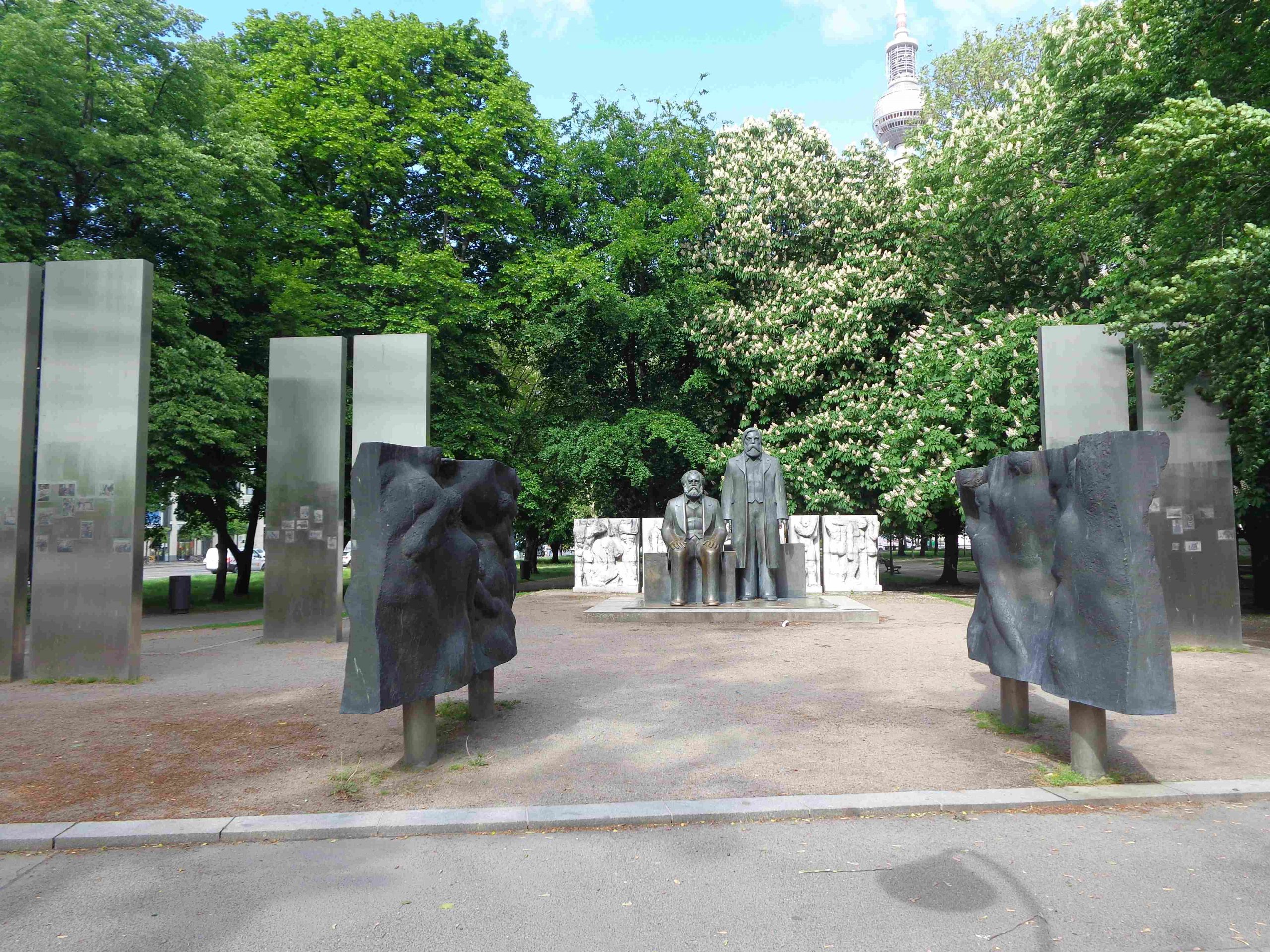Im Zustand von 2009: Im Zentrum des, von einem ringförmigen, von geraden Achsen durchschnittenen Wegesystem gegliederten, Parks liegt eine im große, mit Granitsteinen gepflasterte kreisförmige Fläche. Außerhalb der Fläche stehen im Westen fünf unterschiedlich breite weiße Marmorreliefs von Stötzer, deren figürliche Reliefs die „Alte Welt“ thematisieren. In der zentralen auf den Fernsehturm ausgerichteten Mittelachse östlich davon steht das von Engelhardt modellierte, bronzene Doppeldenkmal für Karl Marx (1818-1883) und Friedrich Engels (1820-1895) über flacher Plinthe und einstufigem, flachem Granitsockel. Marx sitzt, Engels steht leicht nach hinten versetzt. Die Achse nach Osten fortschreitend, trifft der Besucher auf acht paarweise und in einem Bogen angeordnete Fotostelen aus poliertem Edelstahl. 144 eingebrannte Fotos illustrieren den Weg der Arbeiterbewegung seit dem 19. Jahrhundert. Östlich davon stehen zwei aufgeständerte Bronzereliefs von Midell. Sie stellen inhaltlich die ideale Zukunft des Menschen (durch „paradiesische“ Akte) dar und schließen damit den nach Osten führenden Weg von der westlich gelegenen „Alten Welt“ ab (Jörg Kuhn).