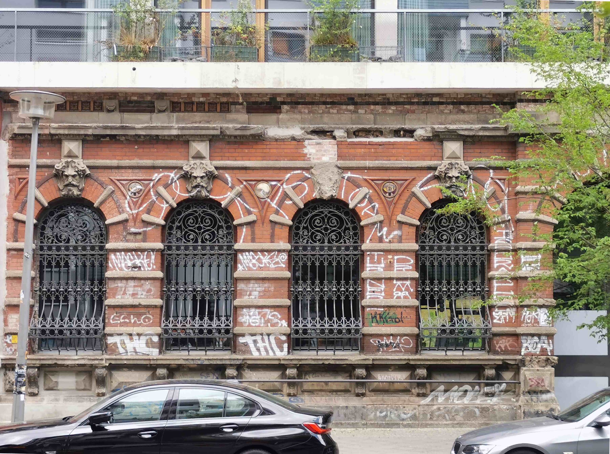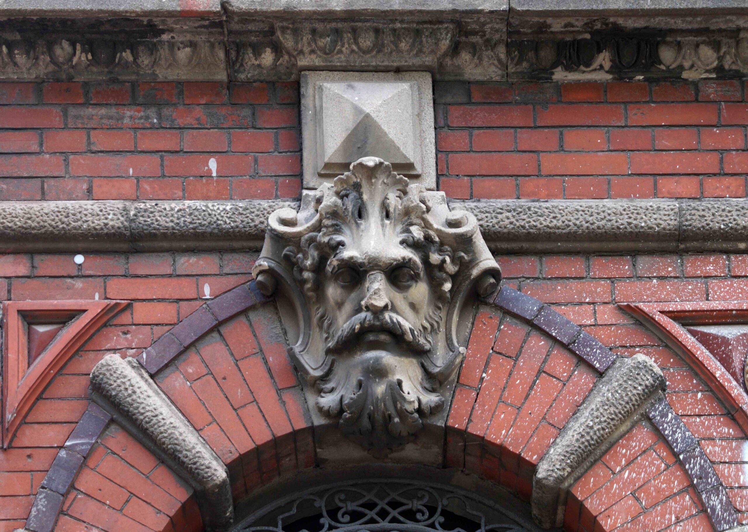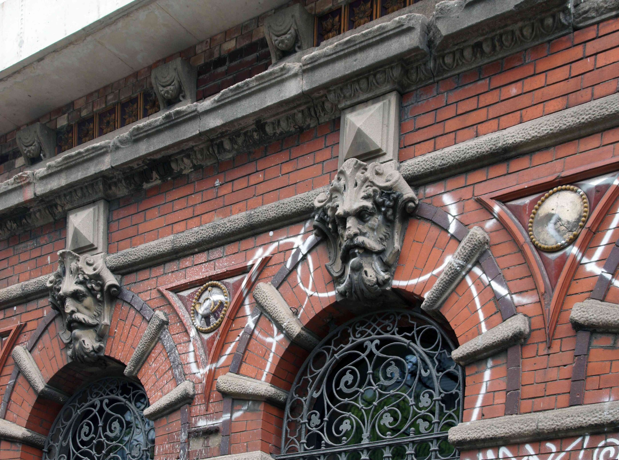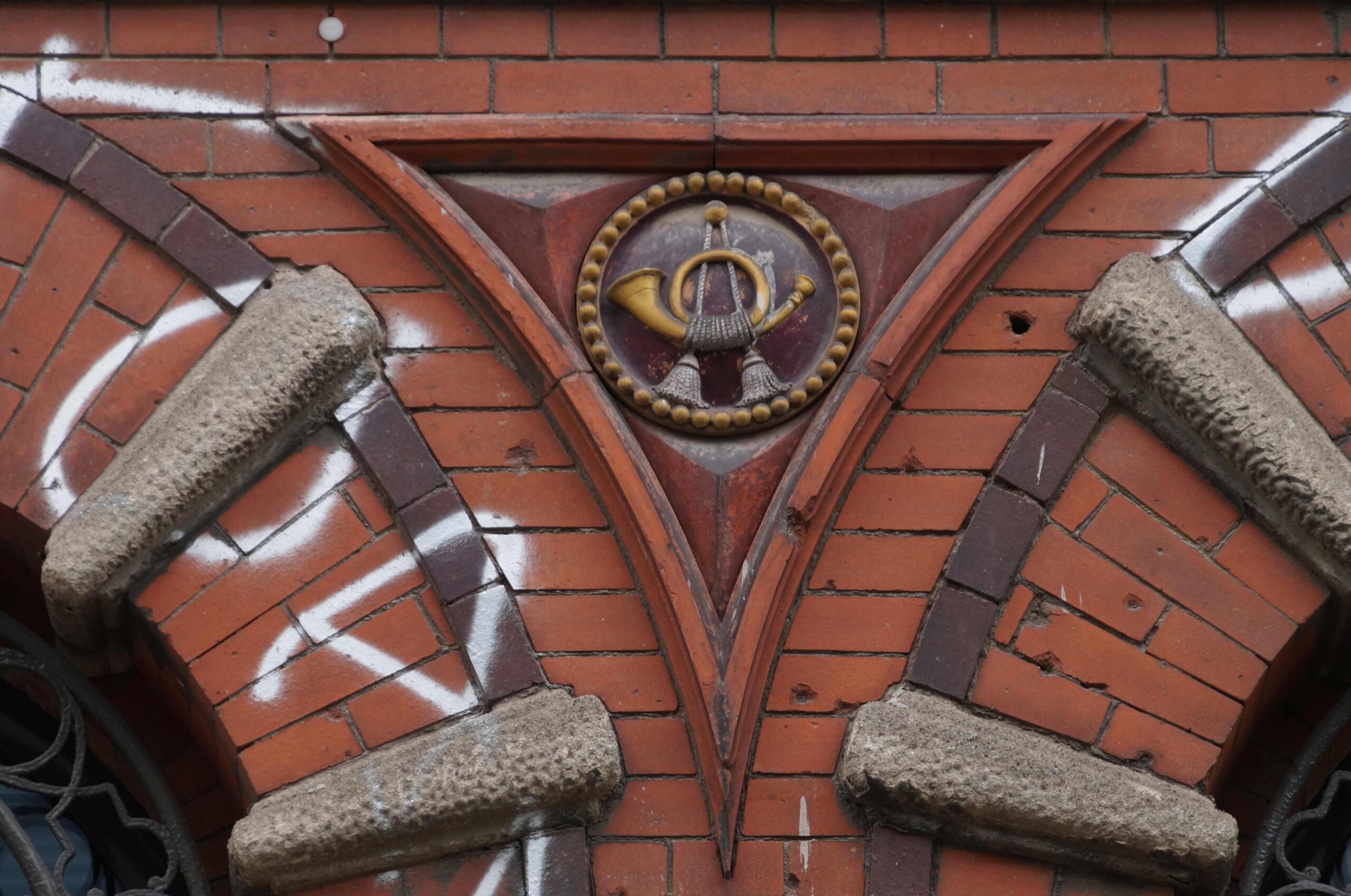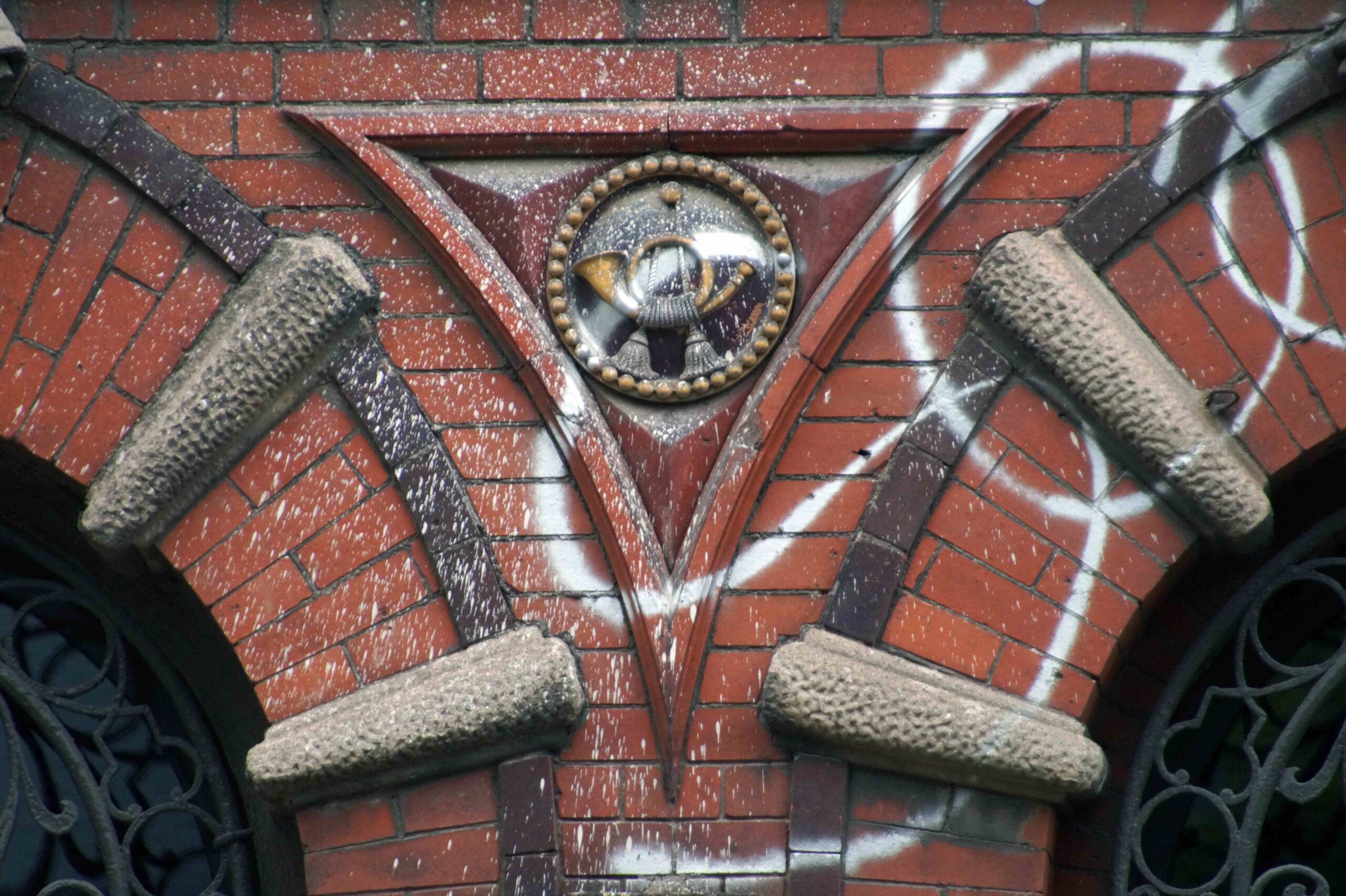 Die Rundbögen der Fenster und der Tür des ehemaligen Postamtes SO 16 sind mit maskenverzierten Schlusssteinen versehen. Die Postzeichen in den Zwickeln der Rundbögen bestehen aus farbig glasierter Terrakotta (Nicola Vösgen).