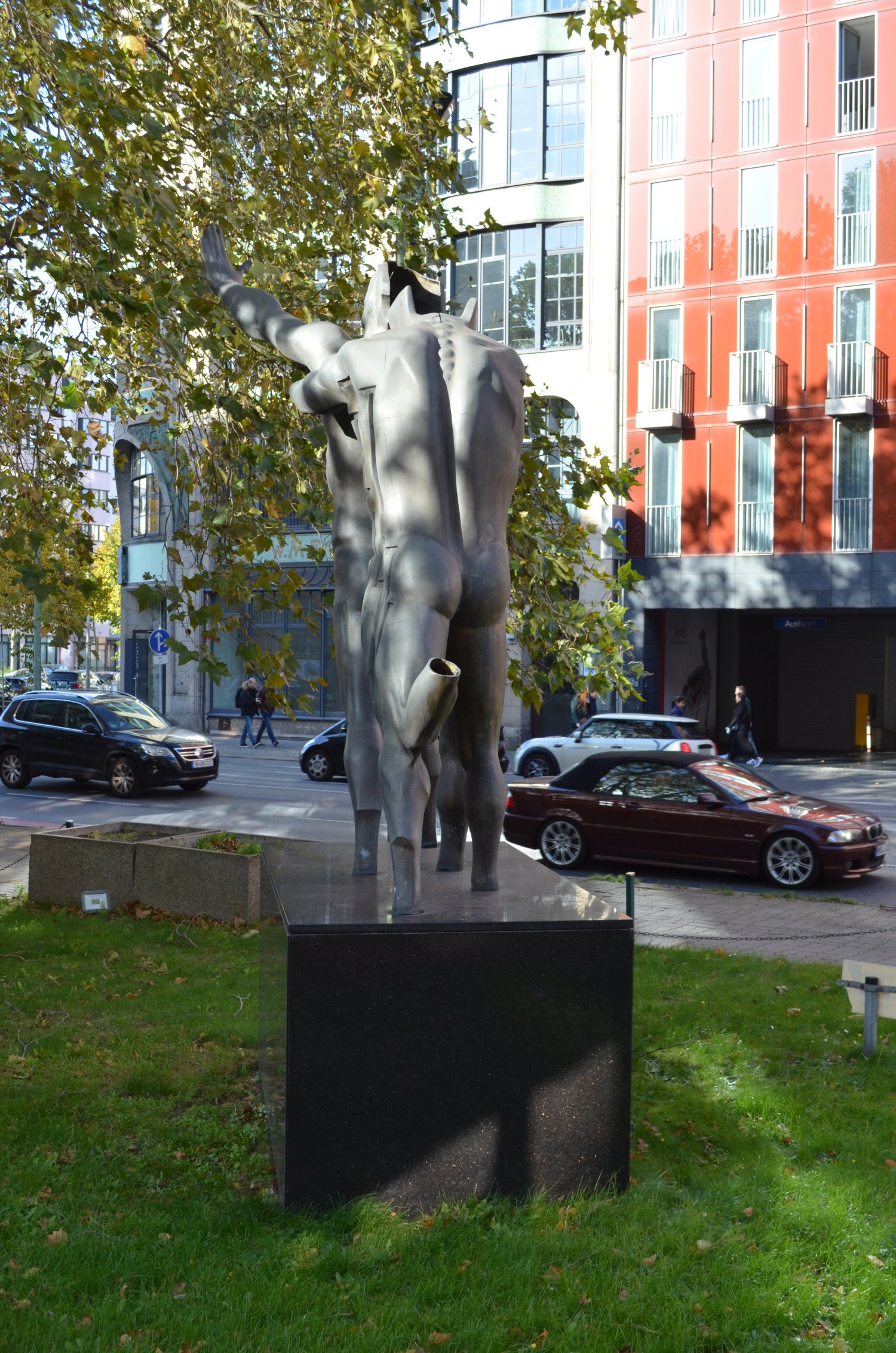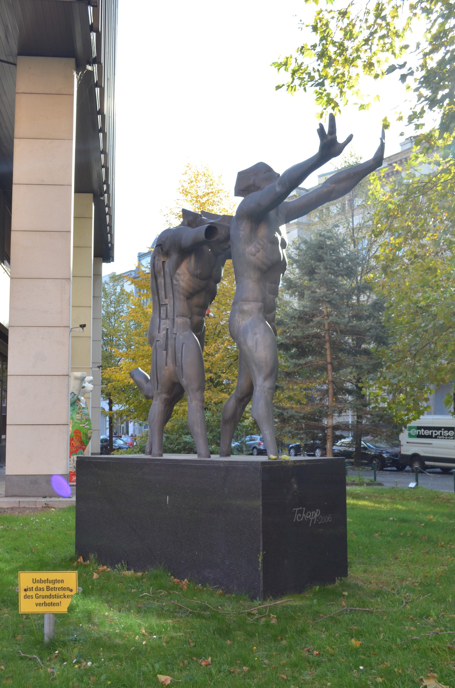 Aktdarstellung zweier überlebensgroßer muskulöser Figuren, welchen einige Extremitäten fehlen. Die Figuren stehen frei auf einem quaderförmigen Sockel und einer schmalen Plinthe. Die vordere Figur stellt einen unbekleideten athletischen Mann dar, welcher, mit dem rechten Bein voran, einen Schritt nach vorne geht. Dabei fehlen ihm beide Füße. Seine Arme sind emporstreckt, die Augen geschlossenen und der Mund geöffnet. Er wird gefolgt von einem ebenfalls männlichen und athletischem Torso, welcher größenteils kopf-, arm- und fußlos ist, jedoch vier Beine besitzt. Möglicherweise verschmelzen in der Bewegung auch optisch zwei Figuren miteinander. Auf den beiden Seiten der hinteren Figur sind ausgefräste oder vertiefte Zeichen und Linien erkennen, welche Verletzungen der Haut darstellen könnten (Pauline Ahrens).