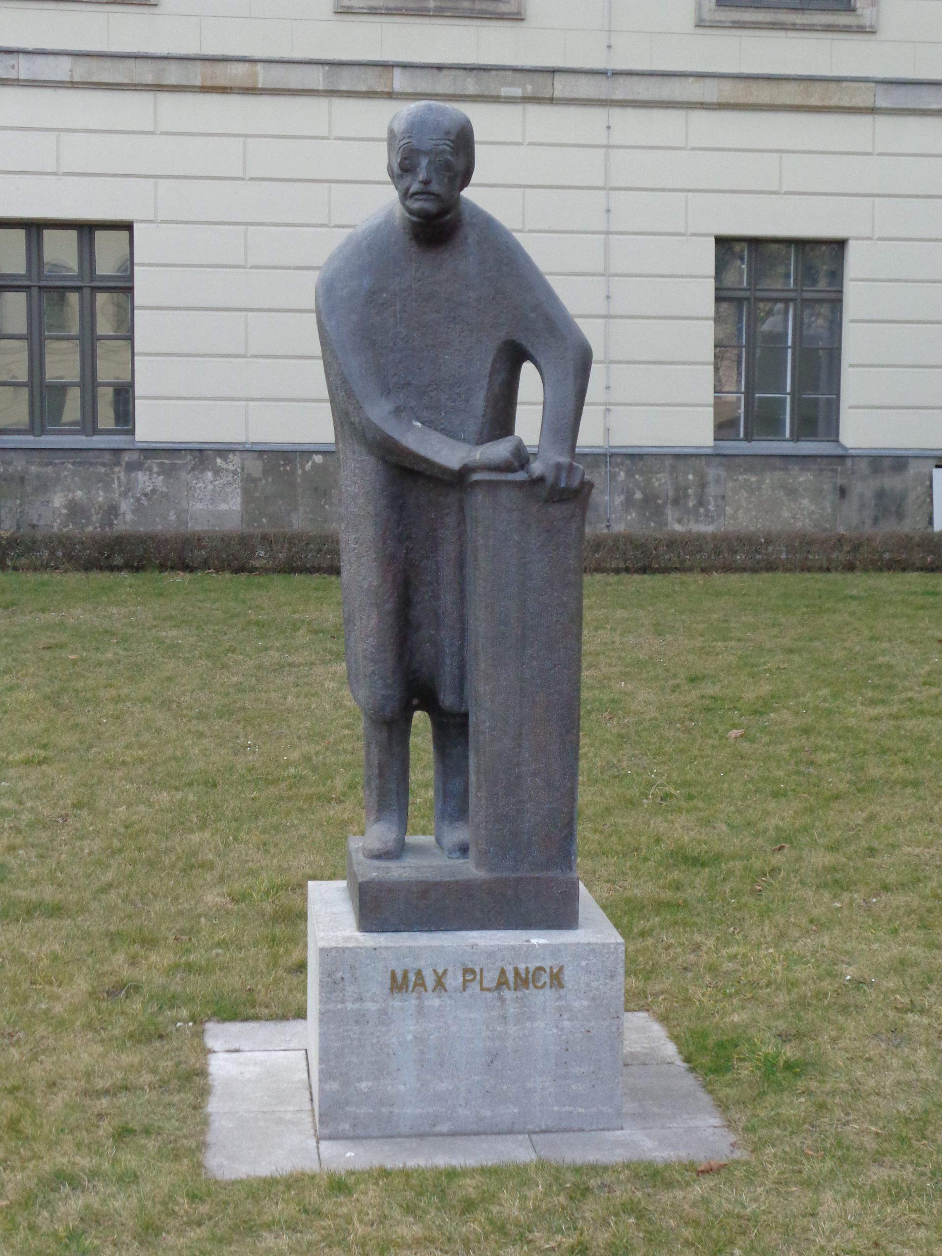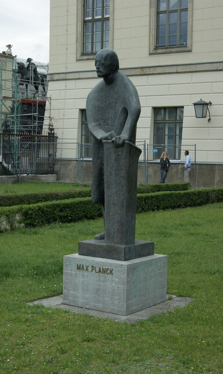 Aufgestellt mit über 50 Jahren Verspätung am 16. Oktober 2006. Das Denkmal sollte von Anfang an auf dem Ehrenhof der Berliner Universität seinen Platz finden. Anlass war der Tod Max Plancks (1858-1947), der lange an der früheren Friedrich Wilhelms Universität gelehrt hatte und hier seine banhnbrechenden Foschungen zur Quantenphysik leistete. Die Akademie der Wissenschaften schrieb 1948 einen begrenzten Wettbewerb aus - der erste für eine Denkmal im öffentlichen Raum Berlins nach dem Krieg. Überraschend gewann ihn Bernhard Heiliger vor berühmteren Namen wie Gustav Seitz und Richard Scheibe. Heiliger hatte damals einen Lehrauftrag an der Kunsthochschule Weißensee, doch zog er noch vor der Staatsgründung der DDR in den Westteil Berlins und nahm Ende 1949 eine Professur an der HfBK am Steinplatz an. Mittlerweile war das Denkmal in der Gießerei Noack in Bronze gegossen worden. Zum Jahreswechsel 1949/50 wurde der Sockel im Ehrenhof der Universität montiert, die mittlerweile in Gedenken an die Brüder Humboldt umbenannt worden war, die Einladungen. Danach verschickte der Präsident der Universität die Einladungen. Doch dann sagte man die feierliche Einweihung überraschend ab. Vermutlich wurde Heiligers Planck-Denkmal Opfer des "Kalten Krieges". Die in der ehemaligen DDR geführte Formalismusdebatte denunzierte namentlich die abstrakte Kunst als "bürgerlich" und "dekadent". An einem derart prominenten Platz sollte das stark abstrahierte Bildnis des "West-Künstlers" Bernhard Heiliger nicht aufgestellt werden. Hinzu kamen Proteste der Physiker, die in dem Denkmal nicht ihren "verehrten Lehrer" erkennen konnten. Das Standbild fand dann am südöstlichen Stadtrand Berlins vor dem Gebäude der Akademie der Wissenschaften in Zeuthen, dem heutigen DESY, einen Aufstellungsort, der sich in den nächsten Jahrzehnten nicht mehr ändern sollte. Erst 16 Jahre nach der Wiedervereinigung und insbesonders durch das Engagement des 2006 neugewählten Präsidenten der HU, Prof. Dr. Christoph Markschies, gelangte das Denkmal an den ursprünglich für ihn vorgsehenen Ort (Marc Wellmann).