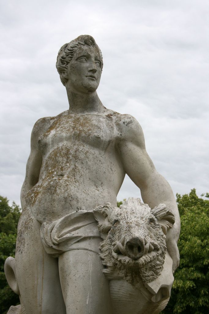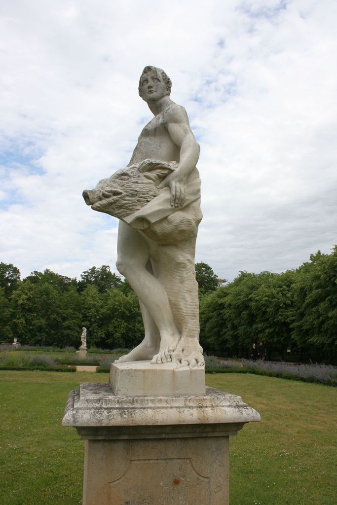 Auf einem hochrechteckigen Postament in der Form des 18. Jahrhunderts steht die Figur des Königssohns Meleager im Kontrapost auf kräftiger Plinthe. Obgleich eindeutig ein männlicher Körper dargestellt ist, weist die Brust fast weibliche Formen auf. Der Kopf ist zur Seite gewendet. Das Attribut des Jägers, der Kopf des „kalydonischen“ Ebers, ist, gestützt von einer Baumstütze, Meleager zur Linken beigefügt (Jörg Kuhn).